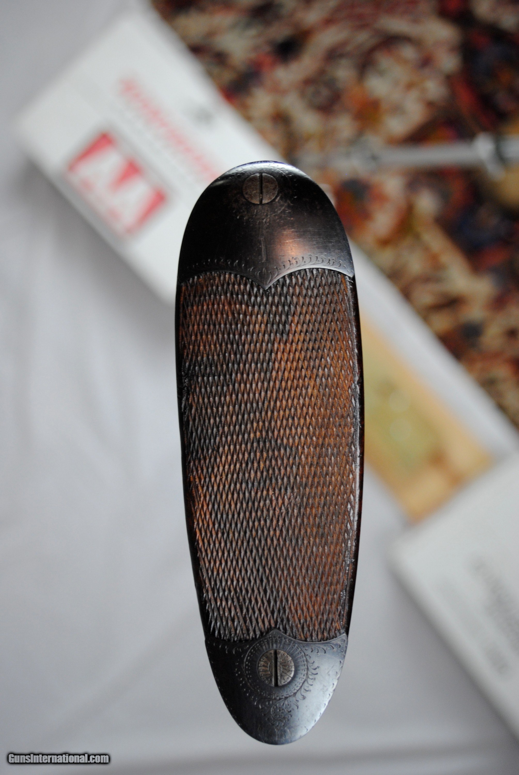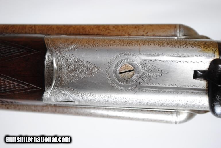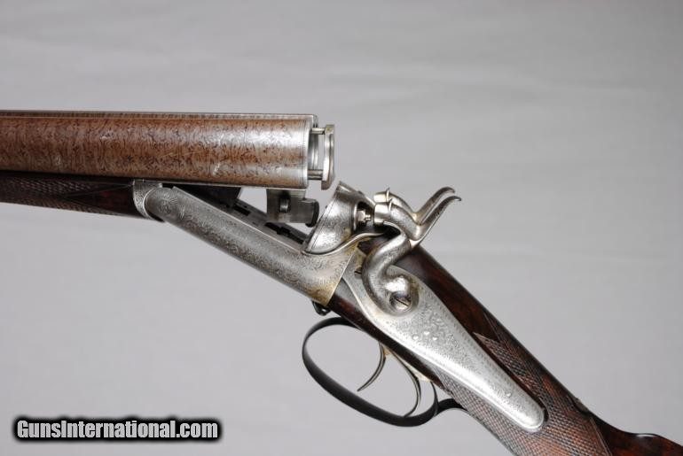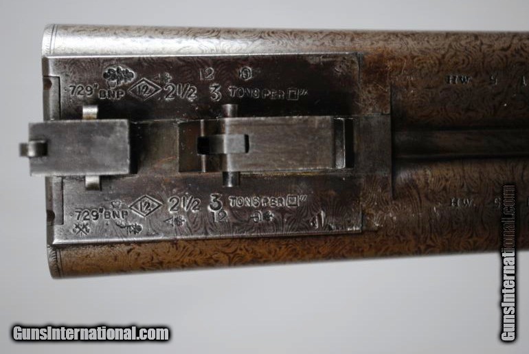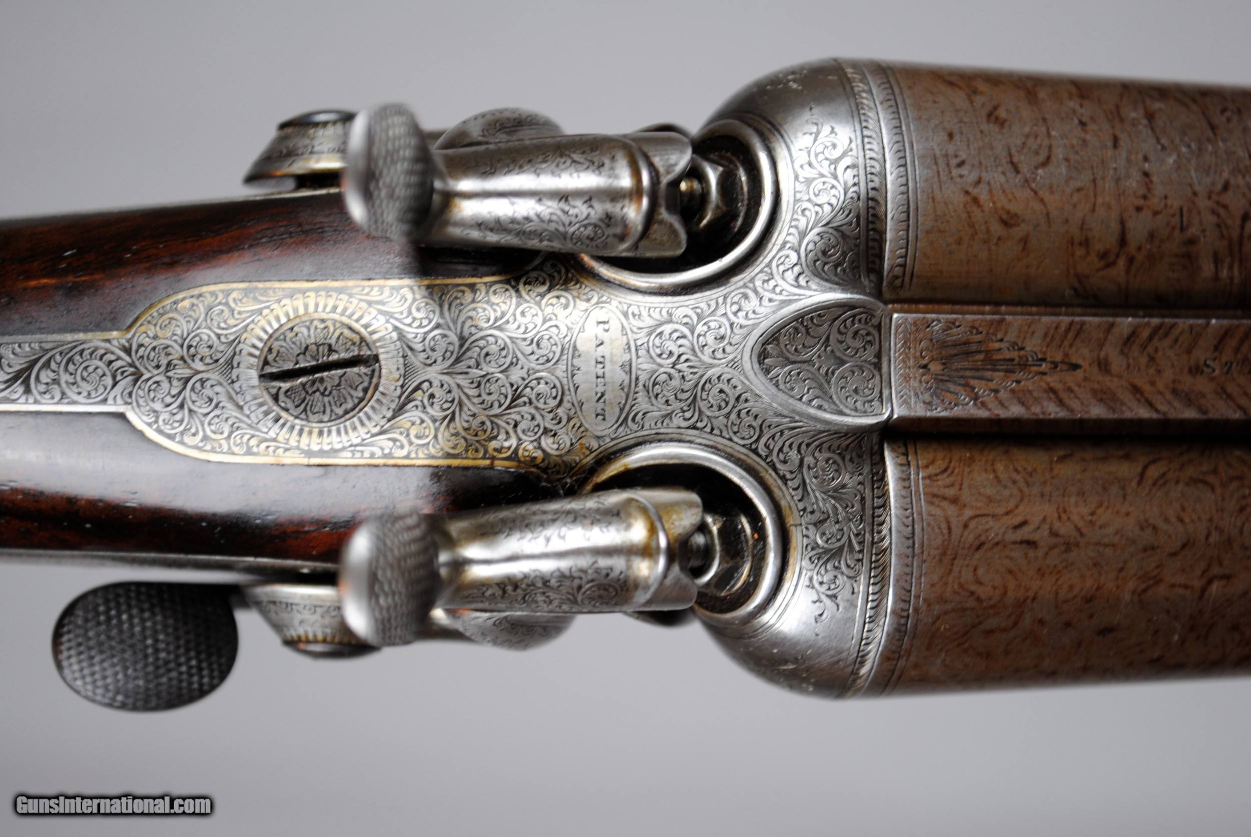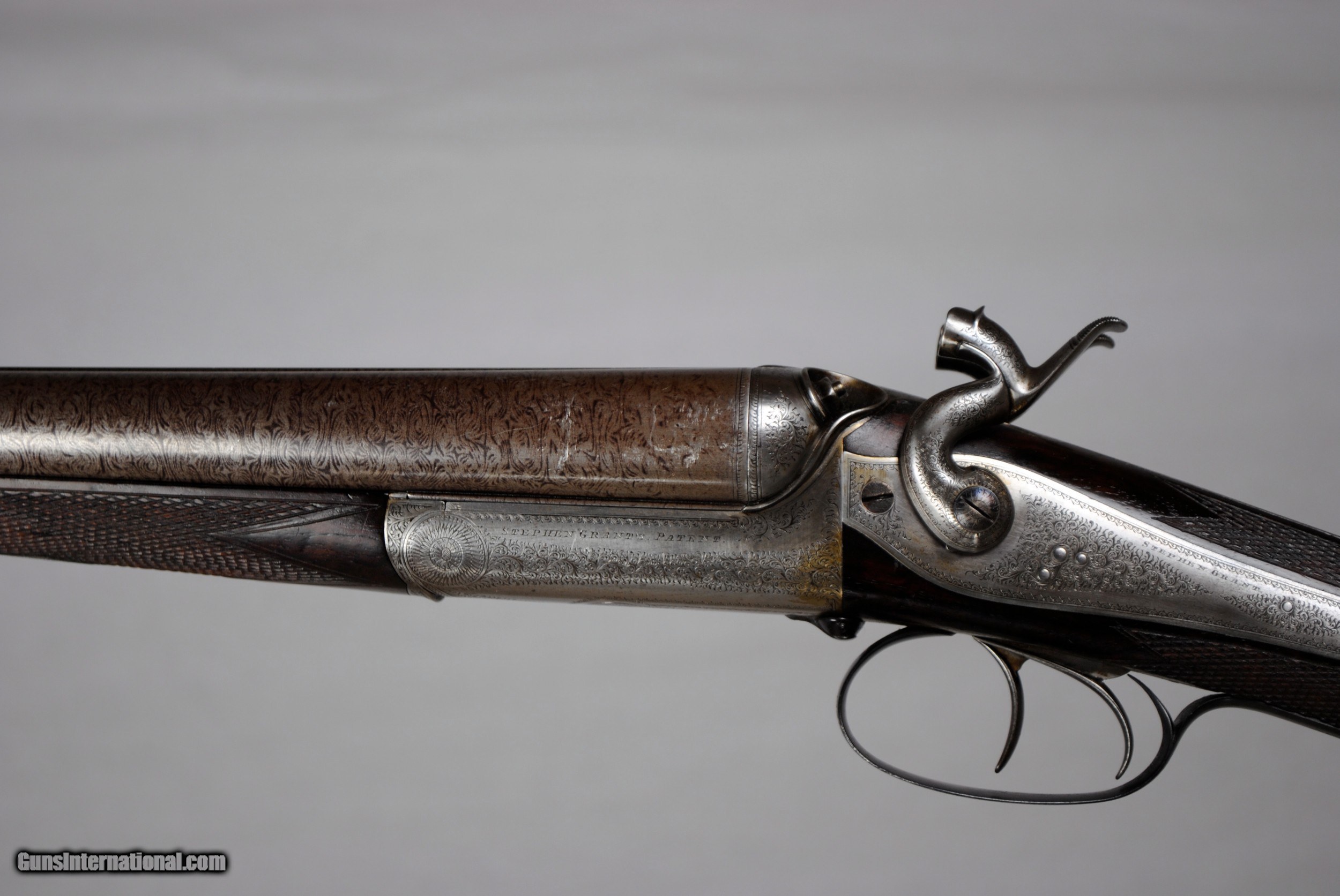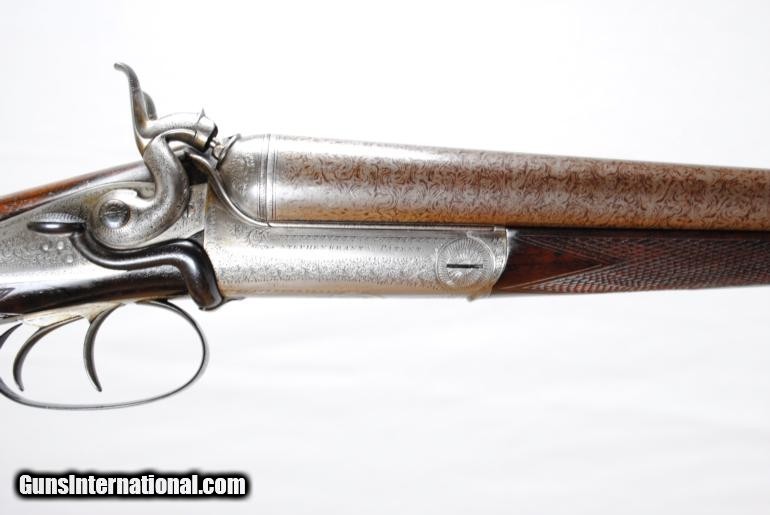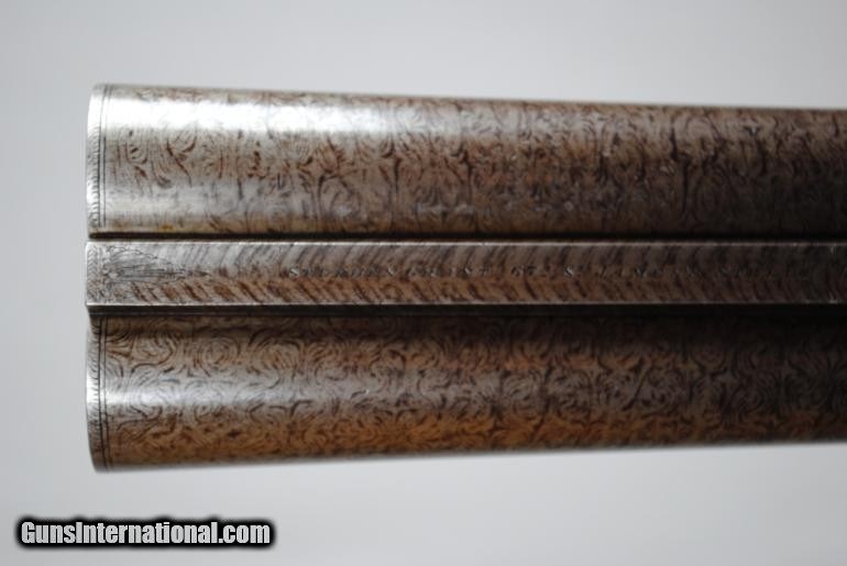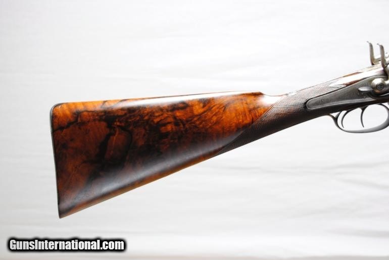 Description: Very fine conditioned, 12 ga. Stephen Grant rebounding hammergun. Side lever. Damascus barrels. Exquisite wood stock. 2 1/2 inch chambers with forcing cones opened, still in proof as per the London Proof House. Provenance search revealed that the firearm was made in 1876 for Lord Inchiquin, the titular head of the O'Brien clan. A Lord Inchiquin still sits in the House of Lords. Trigger weights are 4 pounds right and 4 1/2 pounds left. There is one tiny pit in the the left barrel. I consulted several gunsmiths who didn't feel it was an issue and recommened I continue to shoot it. I have taken this gun to Scotland twice and had good luck shooting driven pheasants, but of course didn't go after the very high fliers. SOLD Antique: Yes Manufacturer: Stephen Grant Serial Number: 3815 Bore: 12 bore Chambers: 2 1/2" Ejectors: No Condition: Fine Metal Condition: Fine Wood Condition: Excellent Bore Condition: One tiny pit Barrel Type: Damascus Action: Side Lever Triggers: Double Triggers Gauge Info: 12 Stock Comb: 1 7/16 Stock Heel: 2 1/8 Stock Cast: 3/8" off Butt Pad: Heel and Toe Plates LOP: 14 1/4 Weight: 6 lb.14 oz. Manufacture Date: 1876 Choke Left: .003 Choke Right: .000 Case: No Item Location: Wisconsin Proof:Nitro: 2 1/2" Nitro Minimum Wall Thickness Left: .034 Minimum Wall Thickness Right: .034 |