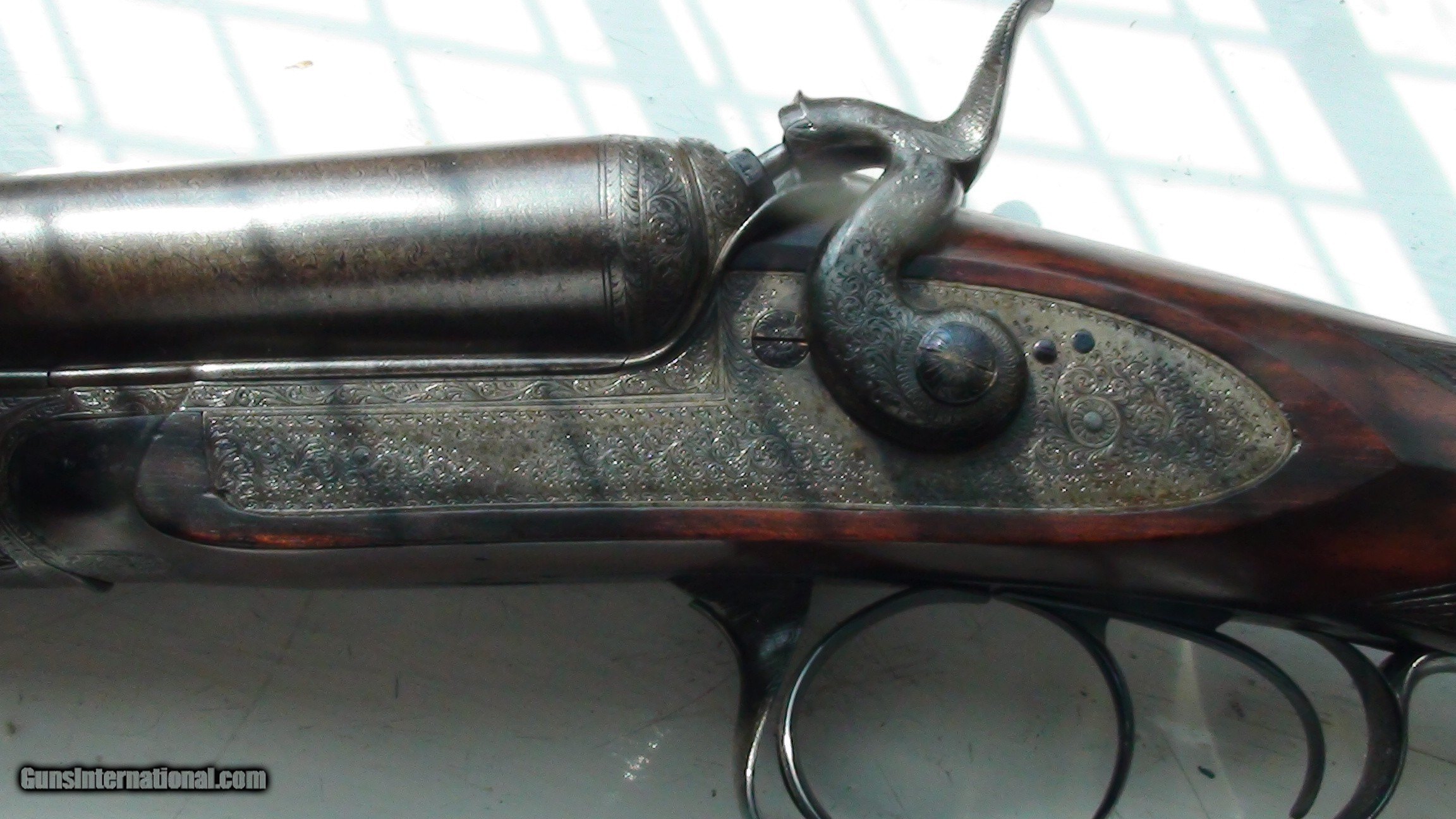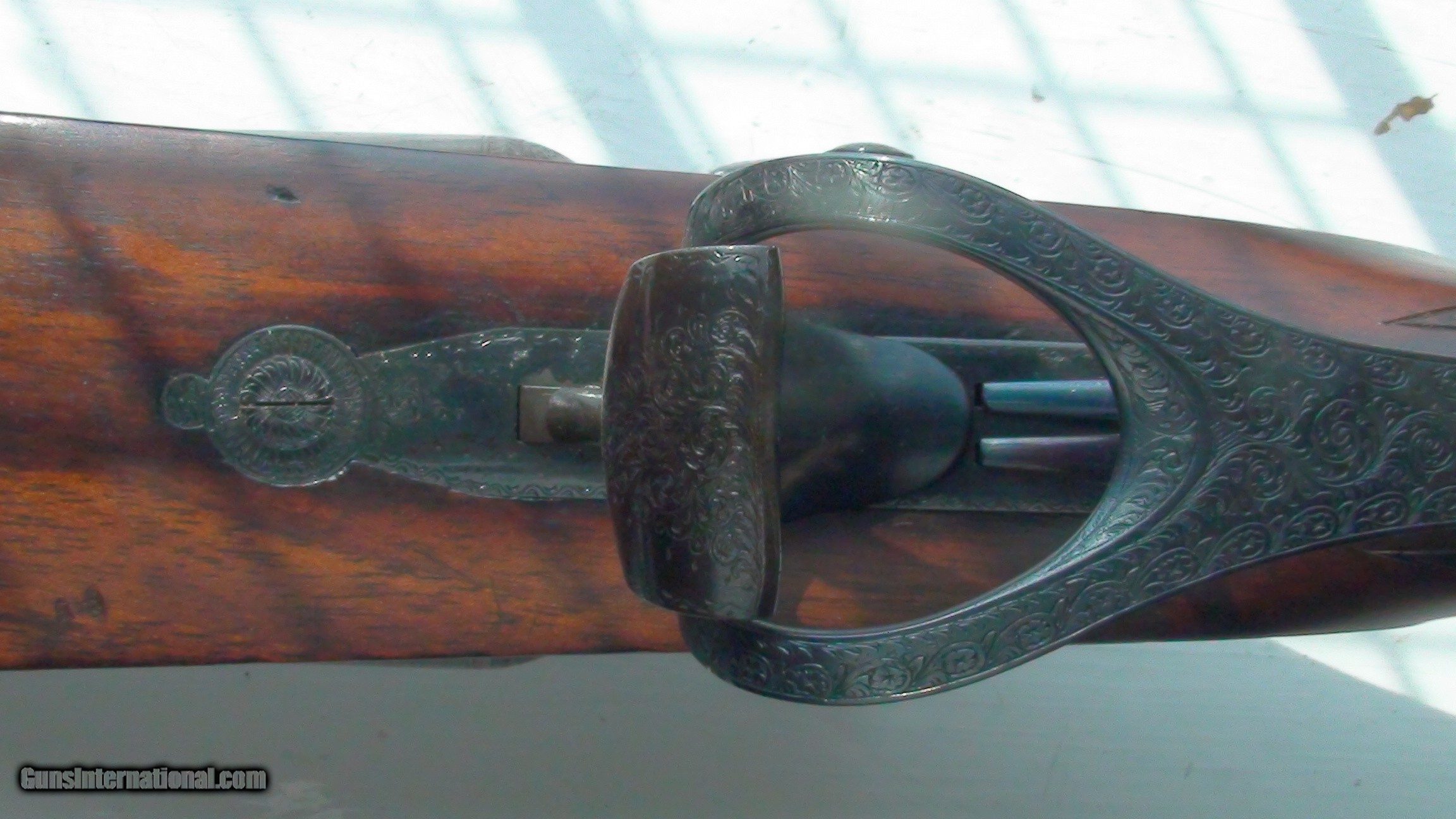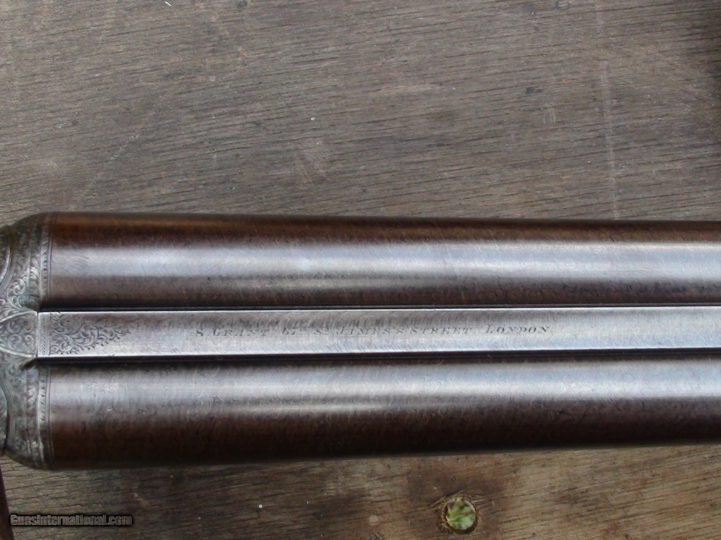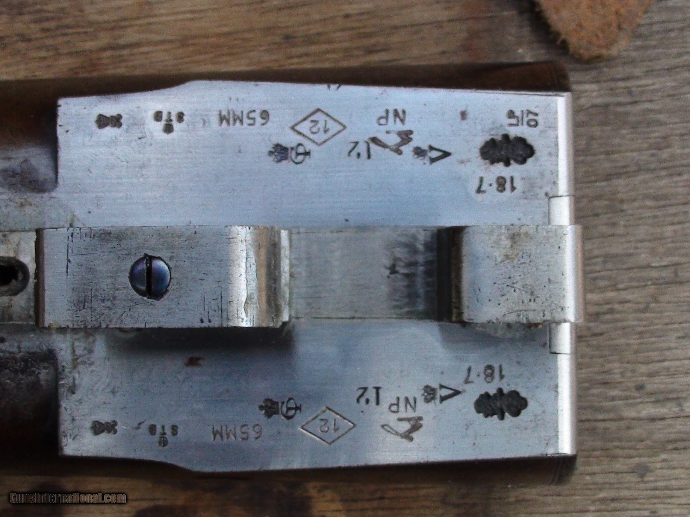 Description: Stephen Grant s/n 2768. Very good condition , 30" Damascus barrels - re browned, gun was re-jointed and re London prooved 2 1/2 in 2007. New pins fitted where needed, some parts re-blacked and a light wood re-finish and stored ever since then. Barrels 30" measure 0.24 & 0.24 walls, cylinder & cylinder - gun was made before chokes. Purdey thumb lever. Stock measurements - bend 1 3/8 x 2 1/16, LOP 14 1/2, Slight right hand cast. Last gun made by Grant in 1869, see "British guns" Nigel Brown volume 1 page 109 SOLD Antique: Yes Manufacturer: Grant Model: Hammer Gun Serial Number: 2768 Bore: 12 see proof marks Chambers: 2 1/2 Ejectors: NO Condition: good Metal Condition: good Wood Condition: good Bore Condition: good Action: s x s Triggers: Double Stock: straight Stock Dimensions: 14 1/2 Stock Drop: 1 3/8 x 2 1/16 Stock Comb: 1 3/8 Stock Heel: 2 1/16 Stock Cast: Slight RH Fore End: Splinter Butt Pad: no LOP: 14 1/2 Rib: Game Finish: Oil Weight: 6 3/4 Sights: bead Manufacture Date: 1869 Chokes: no Engraving: Small scroll Case: none original Item Location: U.K Proof:Nitro: Nitro Minimum Wall Thickness Left: 0.24 Minimum Wall Thickness Right: 0.24 |