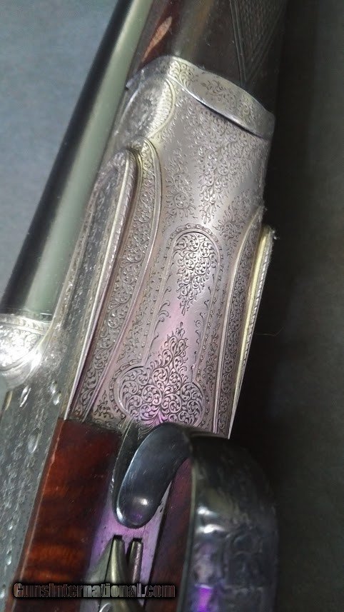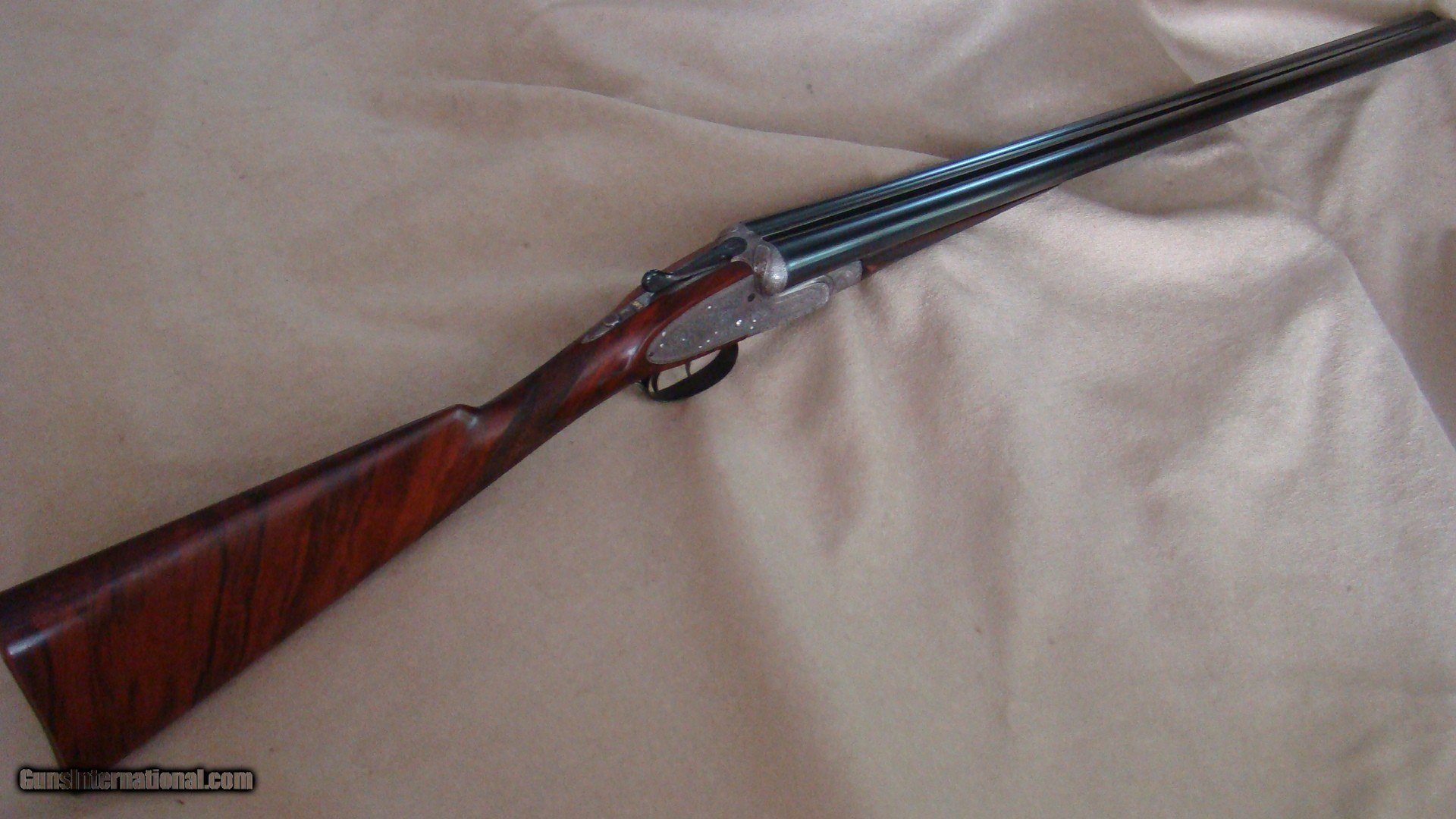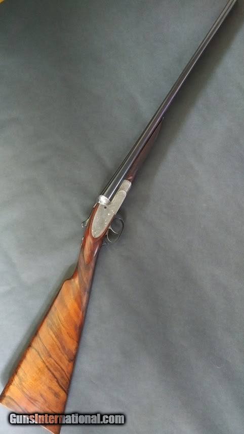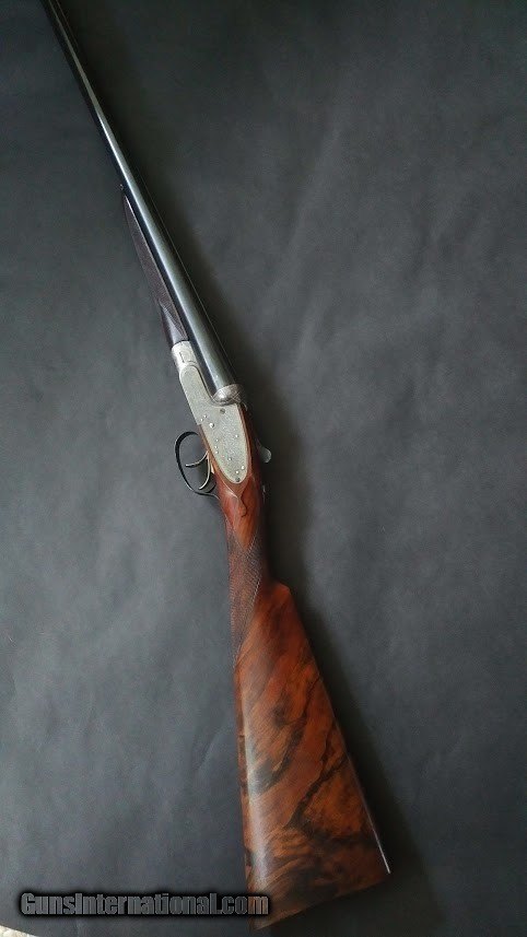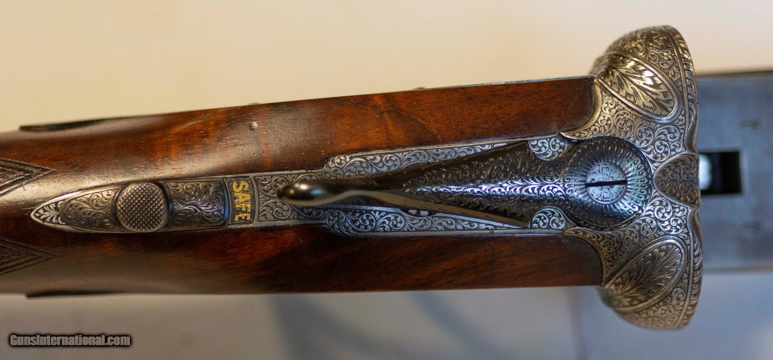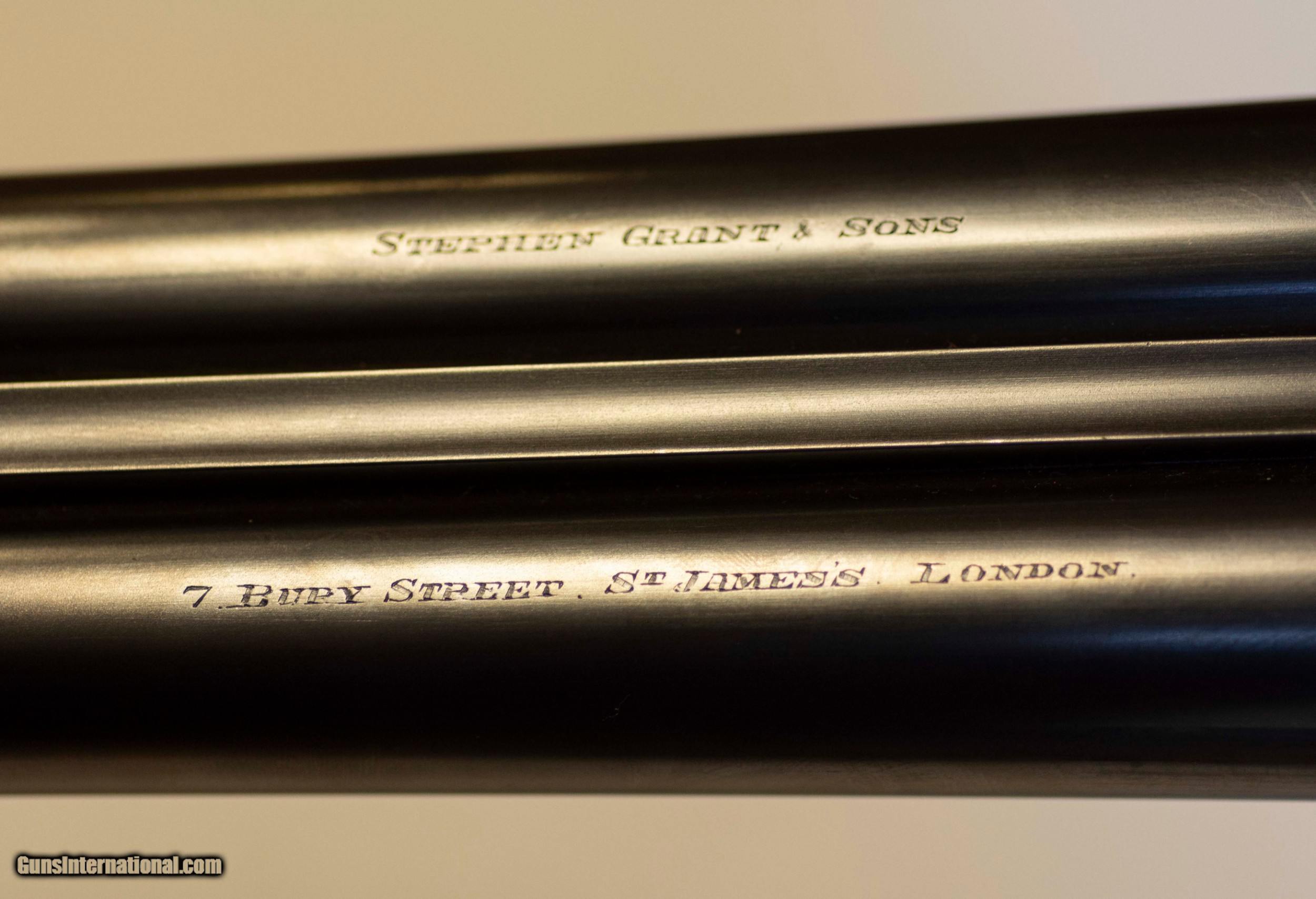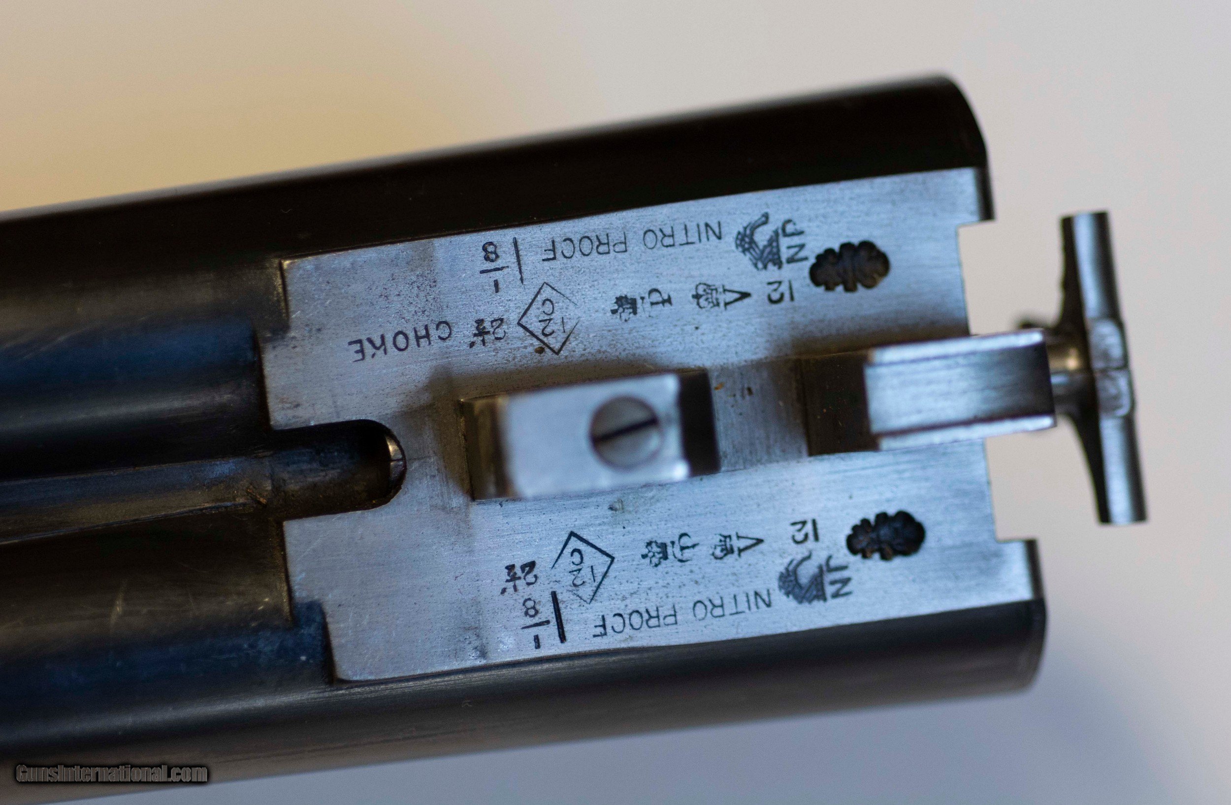 Description: Stephen Grant self-opening 12 ga., 28" chopperlump barrels, 2-1/2" chambers, choked improved cylinder, .007 right - open modified, .010 left. Double triggers, automatic ejectors. The action is beautifully engraved with the signature Grant-style carved fences and contrasts against an old silver finish. The 12-20 sized action incorporates the Baker self-opening system. The straight hand stock of outstanding deep honey color with contrasting black smokey figure throughout measures 1-1/2" comb, 2" heel, about 1/8" cast off at the face, 15" LOP to a checkered butt. Stunning example weighing 5 lbs, 12 oz. SOLD |