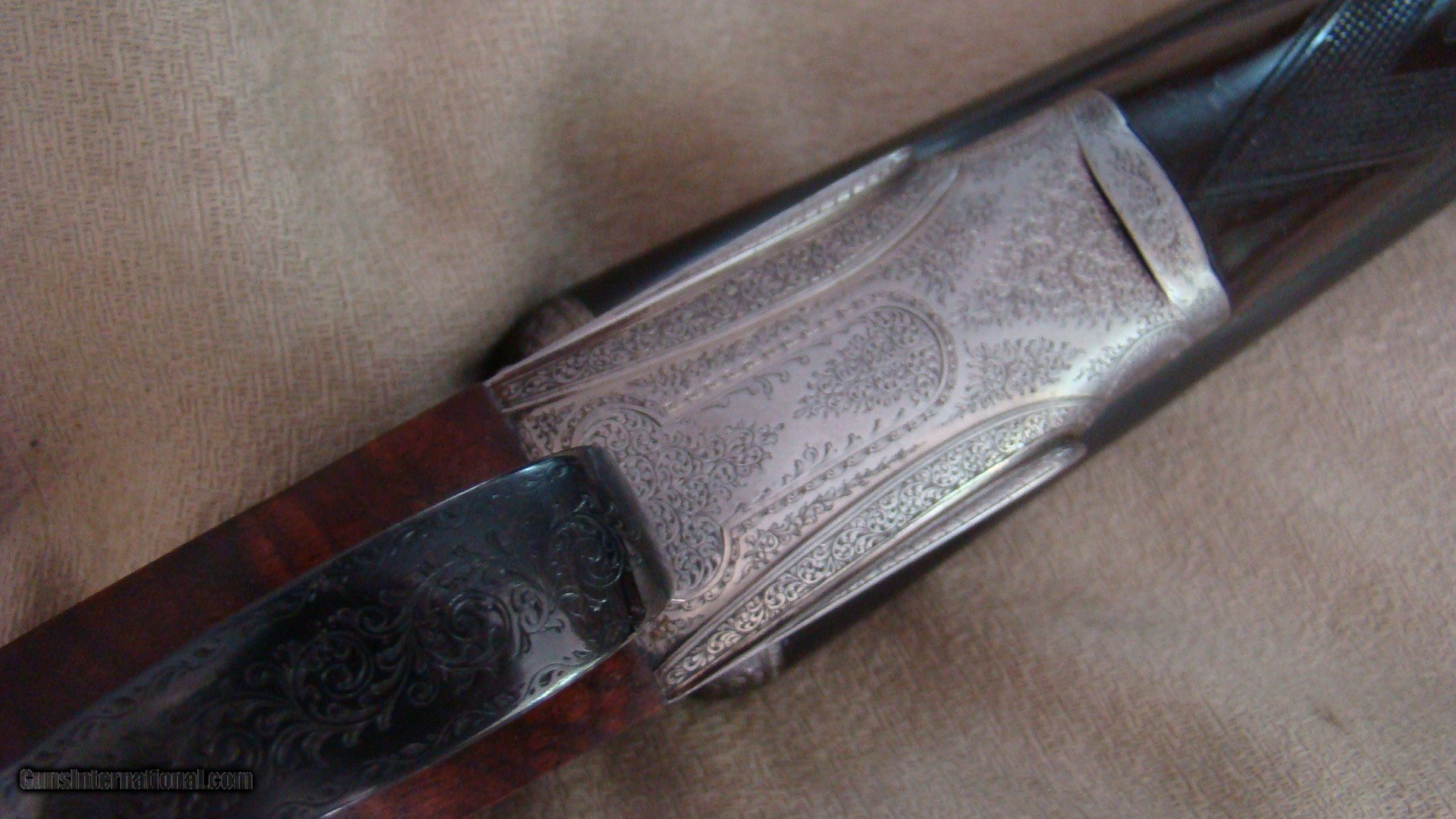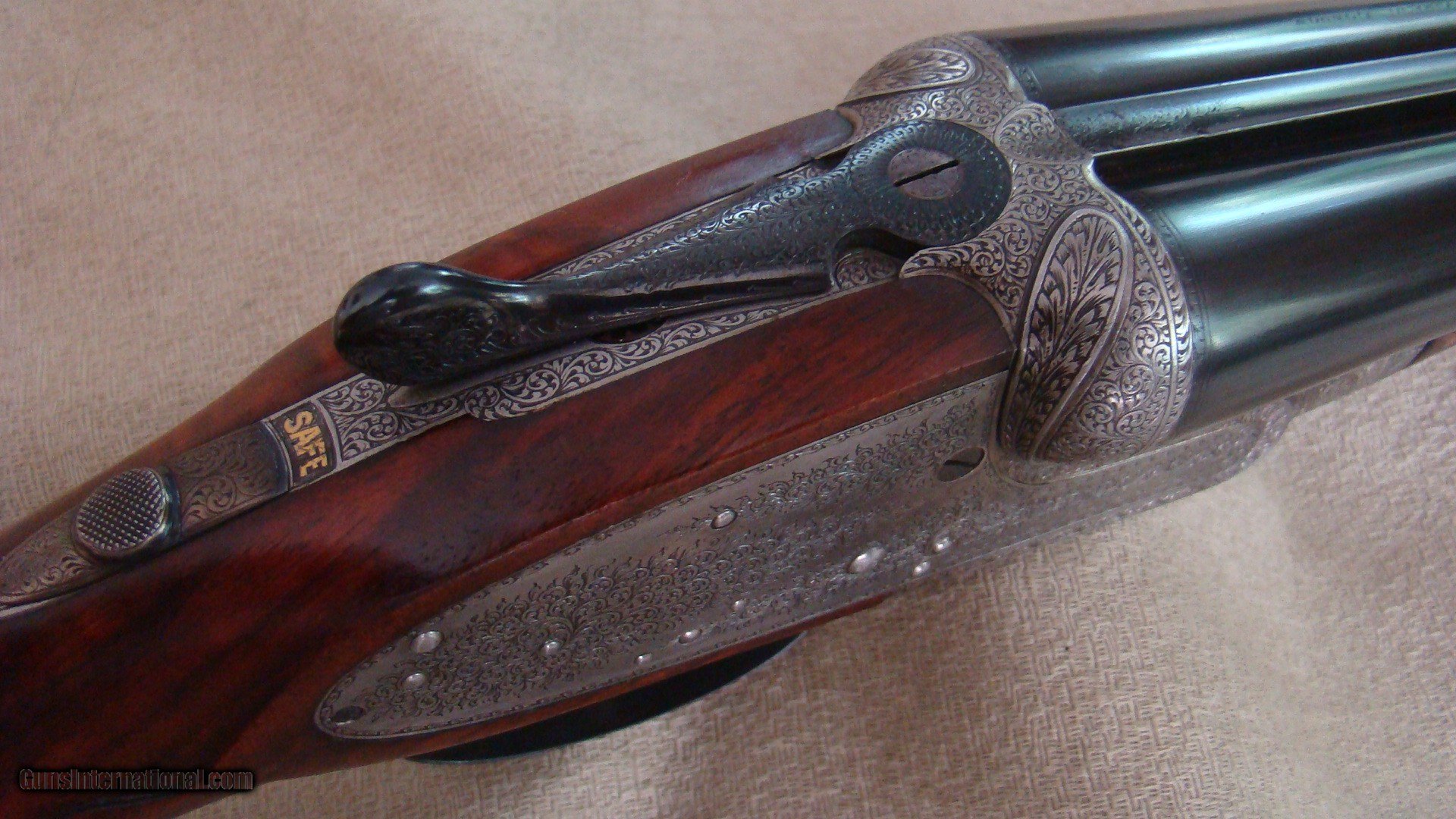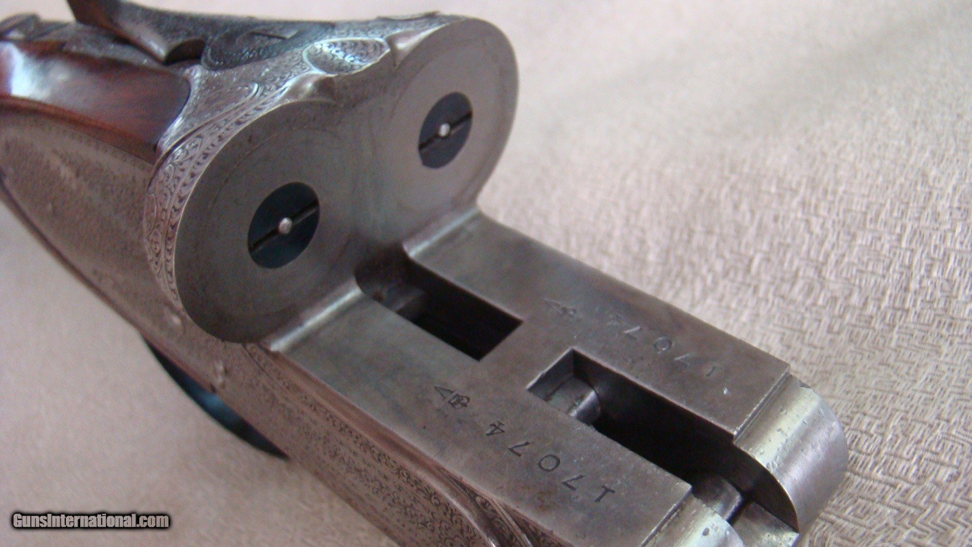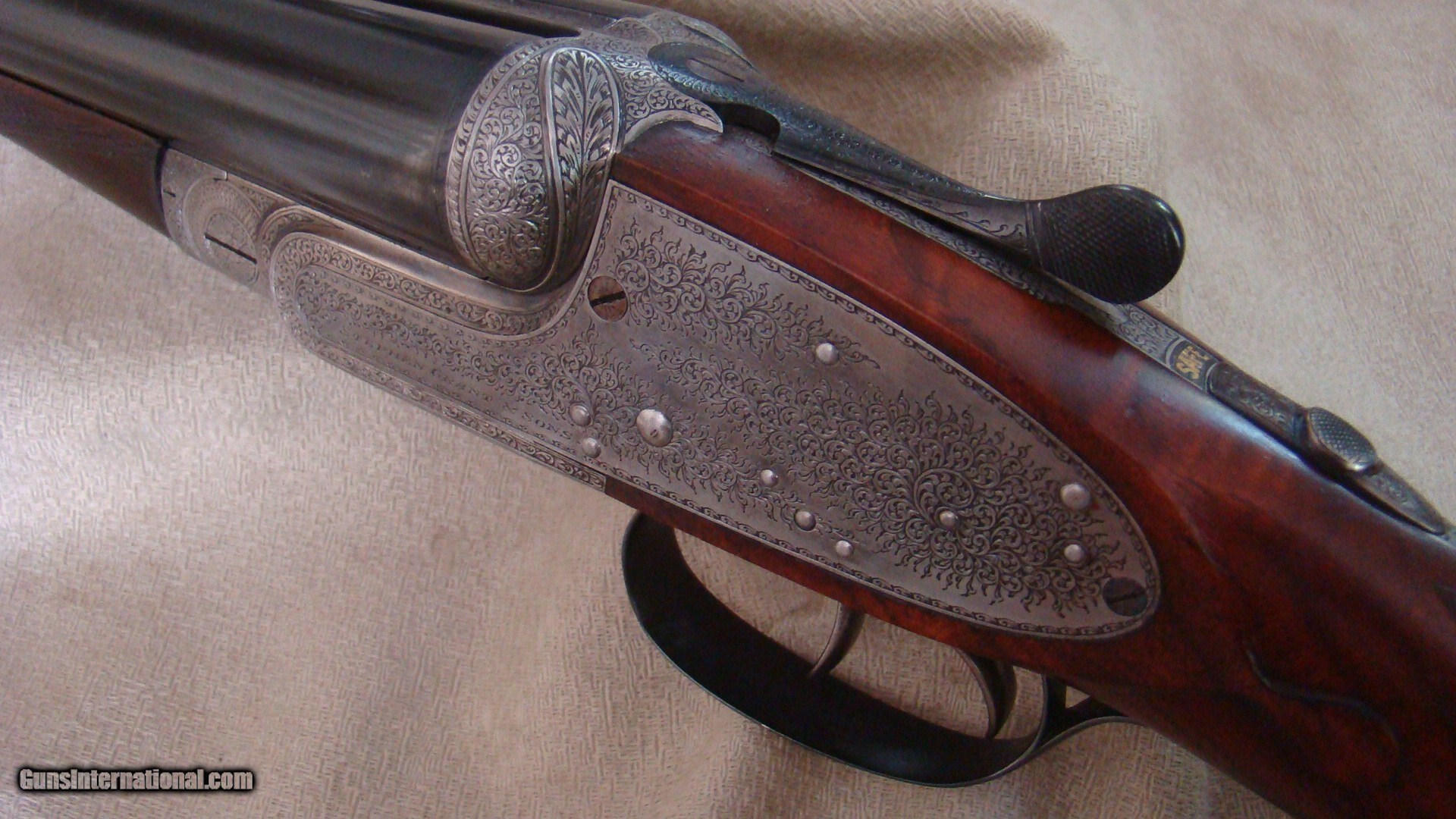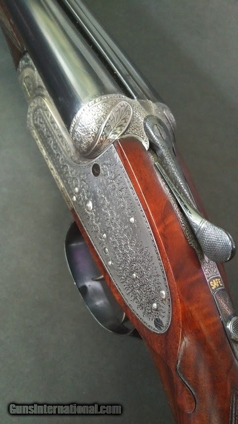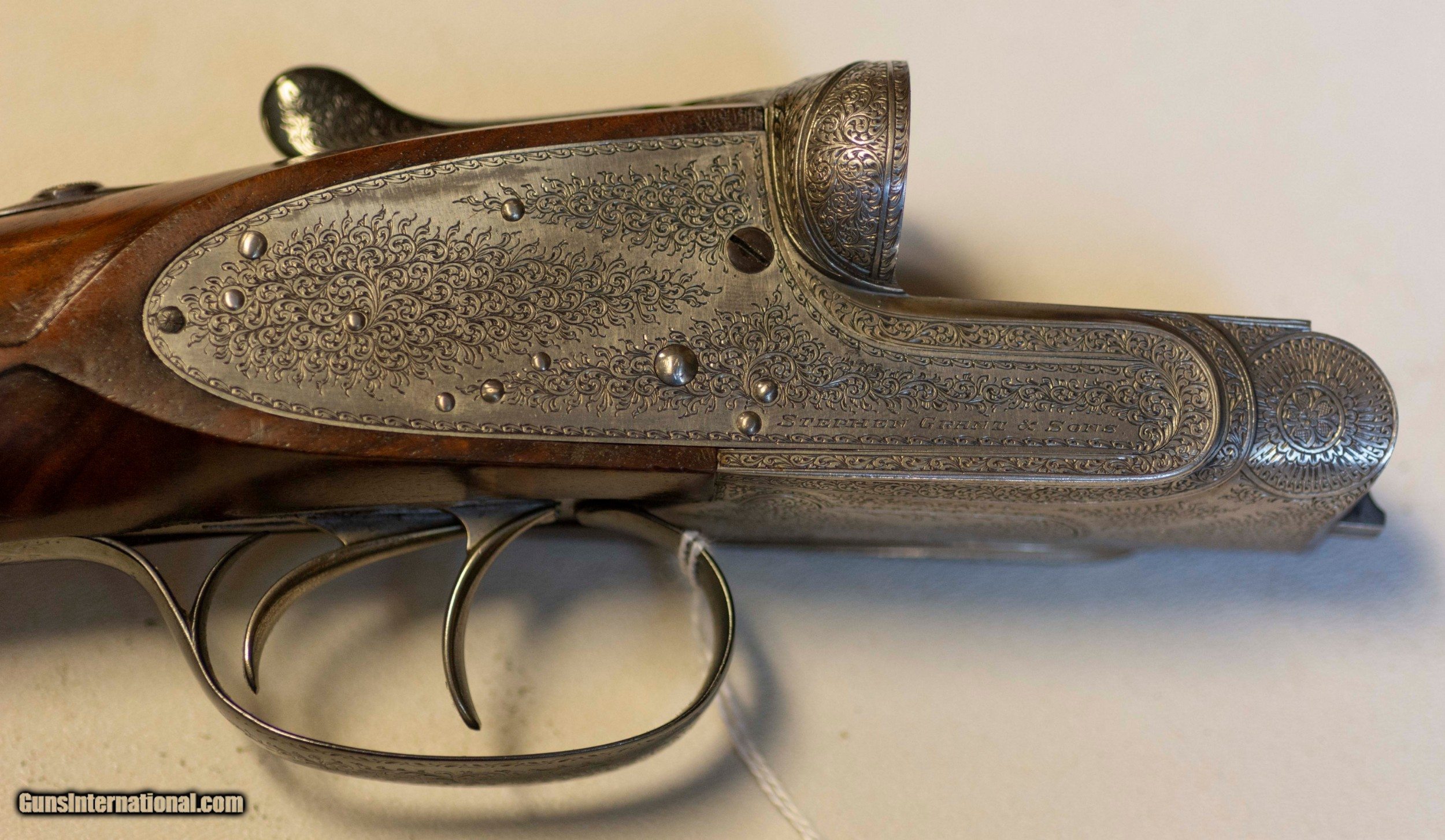 Description: Stephen Grant self-opening 12 ga., 28" chopperlump barrels, 2-1/2" chambers, choked improved cylinder, .007 right - open modified, .010 left. Double triggers, automatic ejectors. The action is beautifully engraved with the signature Grant-style carved fences and contrasts against an old silver finish. The 12-20 sized action incorporates the Baker self-opening system. The straight hand stock of outstanding deep honey color with contrasting black smokey figure throughout measures 1-1/2" comb, 2" heel, about 1/8" cast off at the face, 15" LOP to a checkered butt. Stunning example weighing 5 lbs, 12 oz. SOLD |