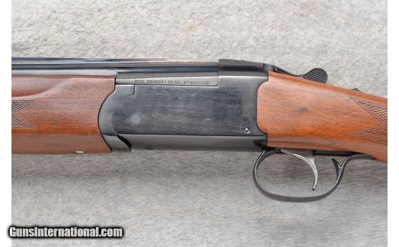 Description: This Stoeger Model Condor is an Over and Under 20 Ga. shotgun. It has 28 inch ventilated rib barrels. A brass bead front sight. With 3 inch chambers it comes with two choke tubes. The butt stock is a checkered grip walnut pistol grip. The forearm is a checkered grip walnut. It has a single trigger. 20 Gauge SOLD Chambers: 3 inch. Metal Condition: Good. Receiver has some handling marks. Wood Condition: Good. Light handling marks. Bore Condition: "Clean, bright and shiny. Barrels: 28 inch ventilated rib barrels. Triggers: Single. Stock Dimensions: LOP 14 1/4 inches. Fore End: Checkered grip walnut. Butt Pad: Black rubber recoil pad. Weight: 7 Lb. 6 Oz. Sights: Brass front bead. Chokes: Comes with a Full and IC choke tub. Item Location: Richfield, WI |