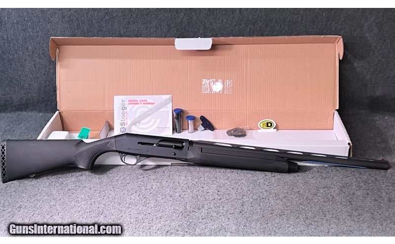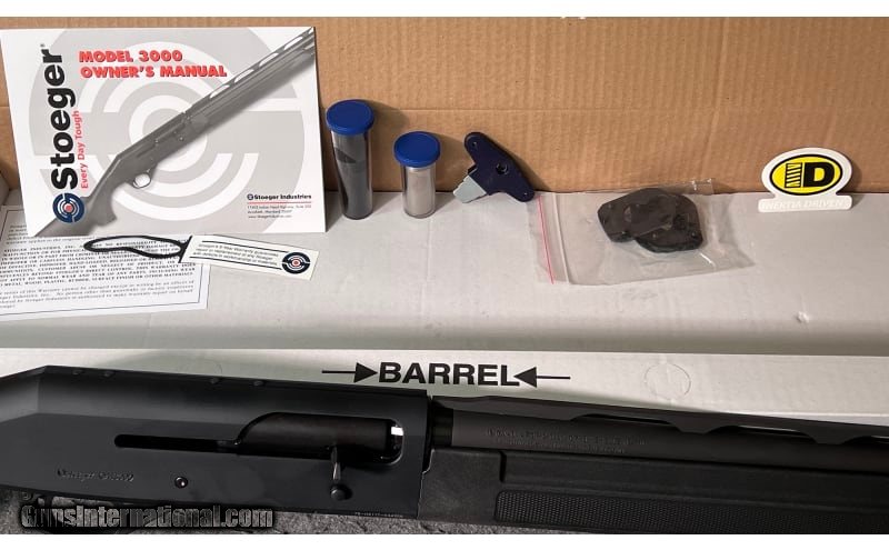 Description: This semi-automatic shotgun is a Stoeger® M3000 chambered in 12 Gauge. It uses the reliable Inertia Driven® action to cycle either 2¾" or 3" shells without adjustment. The black synthetic stock is impervious to weather, and the barrel and receiver's matte finish does not glare to spook wary game. A ventilated, stepped rib and fiber-optic front sight allow for quick target acquisition, even in low light, and an enlarged trigger guard opening allows for operation with gloved hands. Standard features include a shim kit to provide shooter with optimum fit, and 3 screw-in choke tubes and wrench. Choke tubes included: IC, XFT, and M. The M3000 Semi-Auto Shotgun comes pre-drilled and tapped to accommodate Weaver-style scope bases, and has sling swivel studs on the stock and forend cap. The M3000 with Black Synthetic Stock is an ideal semi-automatic shotgun for a wide range of applications, from extreme weather duck hunting, to spring turkey hunting, to shooting pheasants over corn stubble—it even makes a good slug gun for deer hunting when mounted with an optical sight. There is an option to add a Steady Grip stock, which has a rubber over-mold pistol grip, so you can have better control of the gun while turkey or predator hunting. An aftermarket rubber recoil reducer can be screwed into the buttstock for a softer shooting experience. 12 Gauge SOLD Chambers: 2¾ and 3 inch shells Metal Condition: Factory New in the Box Wood Condition: Factory New in the Box Bore Condition: Factory New in the Box Barrels: 24" barrel Triggers: Smooth trigger with safety button at the rear of the trigger guard Stock Dimensions: "14½ inch LOP, overall length 45¾ inches Fore End: Diamond checkered synthetic fore arm Butt Pad: Thick black rubber ventilated butt pad Weight: 7 LB 0 OZ Sights: Front fiber optic sight on a ventilated rib barrel Chokes: "Comes with 3 choke tubes total (Modified, Improved Cylinder, and Turkey Choke - Extended) Item Location: Wichita, KS |