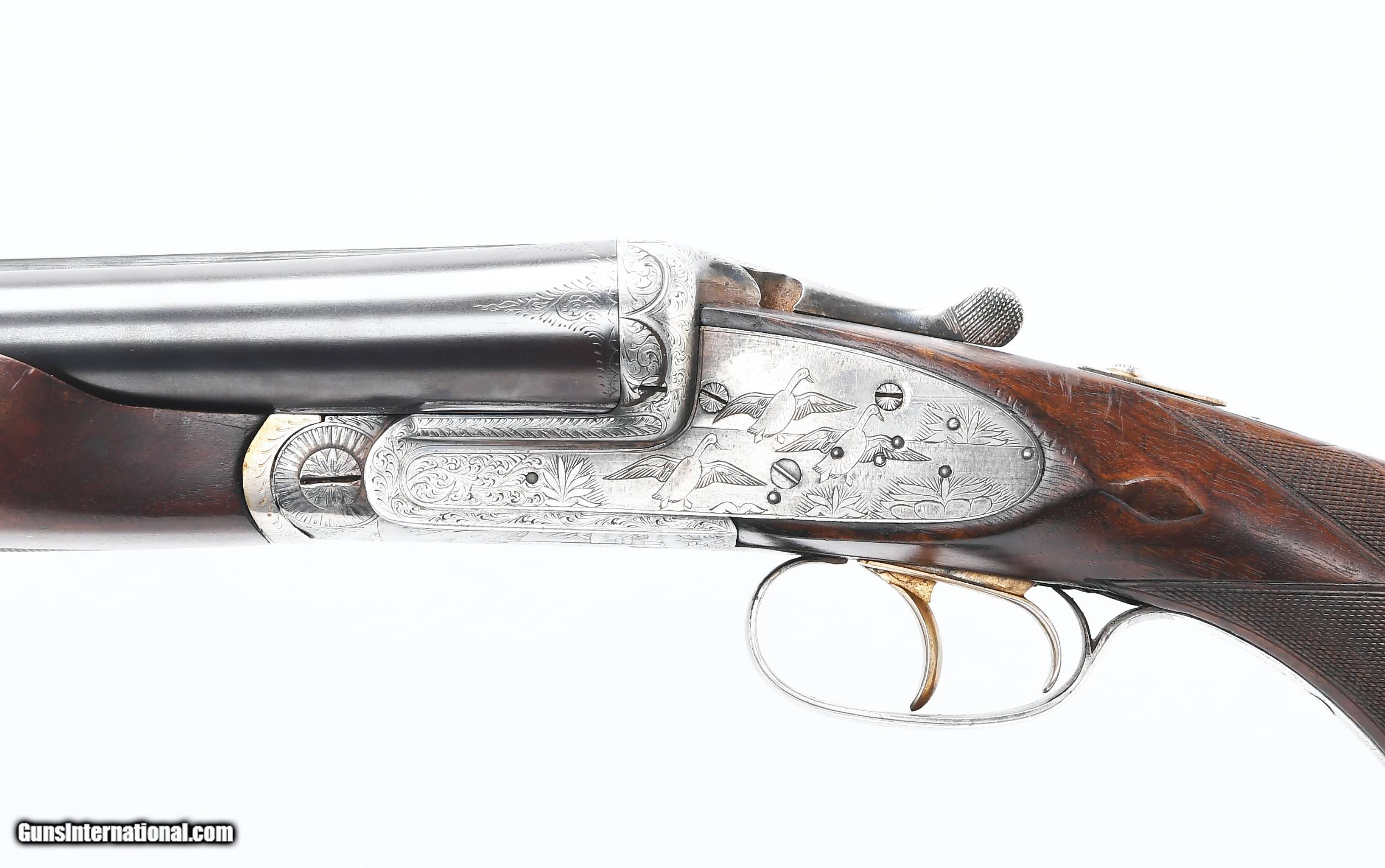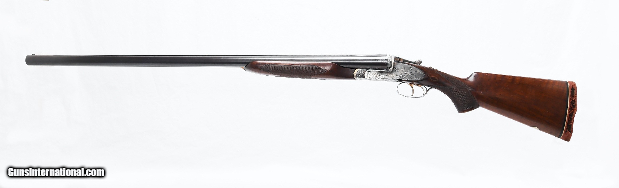 Description: Not your new Quail gun! This is a classic Waterfowling SxS Shotgun..the Stoeger Zephyr #6HG 10 gauge SxS. Built with 32" solid rib barrels with front and mid bead; factory chambered for 3 1/2" shells and proofed accoringly. The bores are typical .770" with .036" full choke in the right tube and .042" full(er) choke in the left tube with minimum wall thicknesses of .075"!! The action is a true sidelock with double triggers, extractors, automatic safety, cocking indicators and double underlug locks with hidden third fastener. The stock has a 14 1/4 LOP over an old vented 1" pad that needs to be replaced (13 1/4" LOP from front trigger to end of wood); 1 1/2" drop at comb and 2 1/2" drop at the heel. Matching beavertail forearm with anson release. Note there is an old, but solid repair in the stock on the bottom right side by the receiver and a non-interfering small crack on the forearm..see photos. The barrel blue is good to very good, the frame case color finish is nearly gone and the screw heads are far from crisp! Mechanically this 11 lb. 7 oz. beast is solid and ready for the next Goose hunt or if you just need an anchor for your large boat! SOLD |