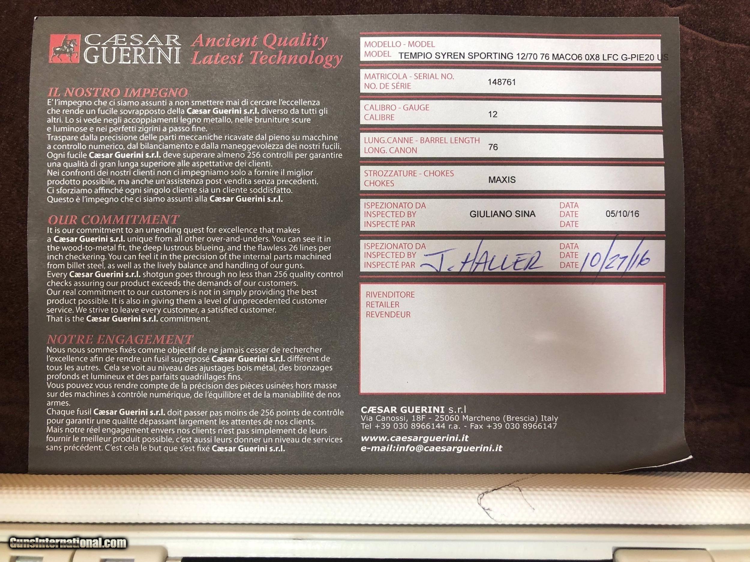 Description: Caesar Guerini Syren Tempio 12 gauge O/U. This has 30” flat rib sporting barrels, 13 1/2” LOP with pachmayr decelerator recoil pad, adjustable hybrid trigger (factory) for small bore,adjustable comb, selective safety, ejectors, 8 maxis extended chokes, DTS kinetic balancer, and Syren hard case. If interested call Jeff at 515-370-1803. Buyer must provide copy of FFL to receive gun. SOLD Manufacturer: Ceaser Guerini Model: Syren Tempio Ejectors: Yes Condition: Excellent Metal Condition: Excellent Wood Condition: Excellent Bore Condition: Excellent Barrels: 30” Action: O/U Gauge Info: 12 |
