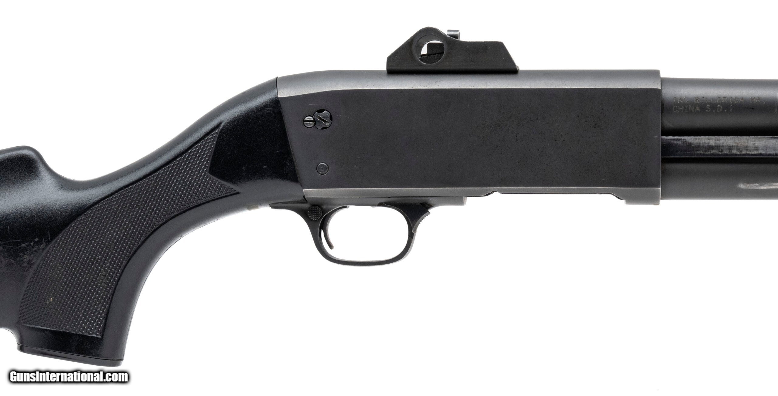 Description: "SN: 0406604. Modern production. Pump-action tactical shotgun made by SDI and imported by Interstate Arms Corp. 18¾"" cylinder bore barrel chambered for up to 3"" 12Ga shells. Good overall condition with some handling marks in the parkerized metal finish and black polymer furniture. Features ambidextrous bottom-eject design. SOLD |