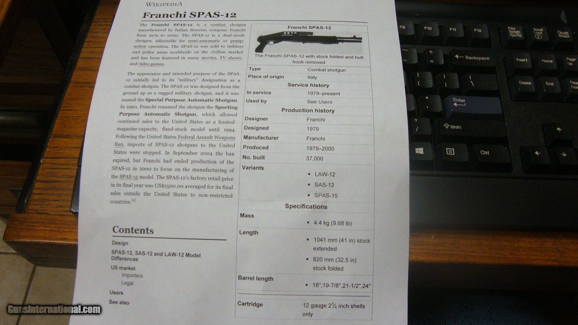 FRANCHI SPAS -12 L WITH EXTENDED TUBE VERY EARLY MODEL 4 DIGIT SER. #