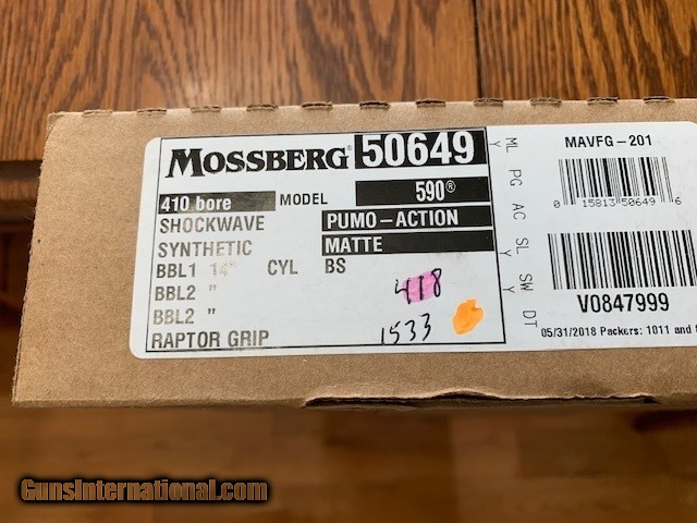 MOSSBERG 590 SHOCKWAVE, 410 GA., 14” BARREL, NIB.