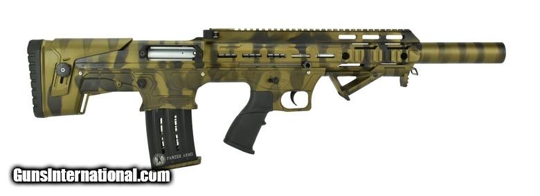 Description: Panzer Arms Bullpup 12 Gauge shotgun. Panzer Arms 12 gauge shotgun with AR style and side charging handles. Angled fore grip, quad rail hand guard, adjustable cheek riser and recoil butt pad. Comes with box, 2 magazines, cleaning kit and flip up sights in bronze camo finish. New.
