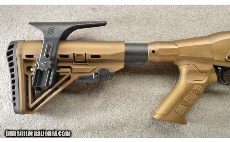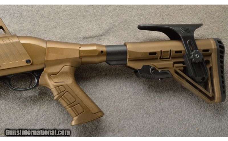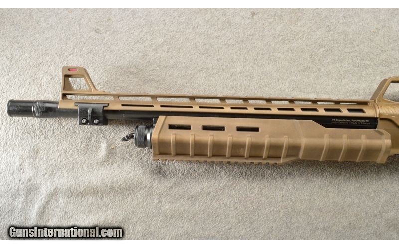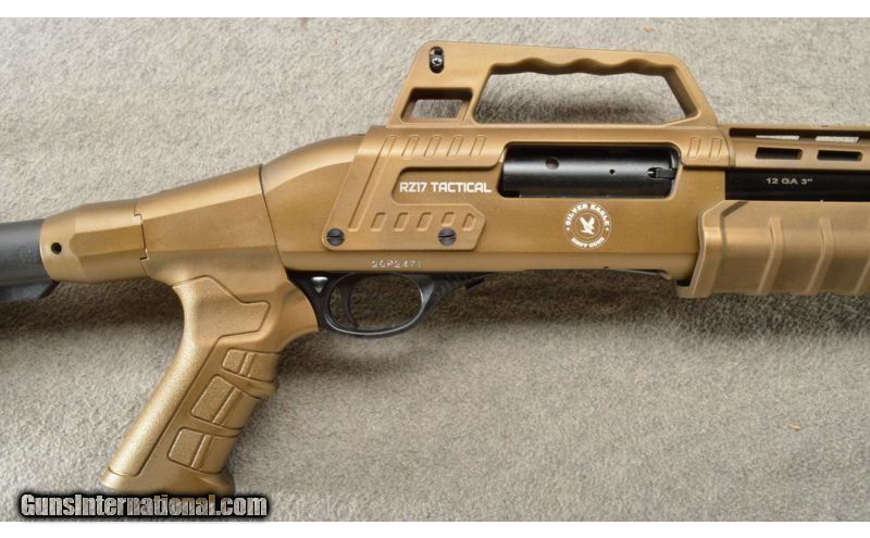 Description: This tactical version of the popular RZ17 pump action features the same forward-assist action, ensuring a positive lockup and elimination of short-stroking. Stock is adjustable for length and comb height. Rear sight in carry handle is fully adjustable. Carry handle is easily removed, permitting installation of optics. Ample rail space has all the room you need for extras. Barrel: 18.5 inch with removable Cylinder choke and removable fiber optic front sight. Capacity 4+1. Chamber: 12ga, for 3" and shorter shells. This is a new shotgun with a bronze and black finish. 12 Gauge SOLD Chambers: Pump action 4+1. Metal Condition: New. Wood Condition: The synthetic stock is new. Bore Condition: New. Barrels: 18.5 inch black with a front sight and top rail. Triggers: Single. Stock Dimensions: Adjustable tactical stock with a true pistol grip. Fore End: Bronze color synthetic with a bottom sight rail. Butt Pad: Black rubber butt pad. Weight: 7 lbs. Sights: Adjustable rear aperture and a fiber optic front. Chokes: Screw in comes with a Cylinder. Item Location: Owatonna, MN |