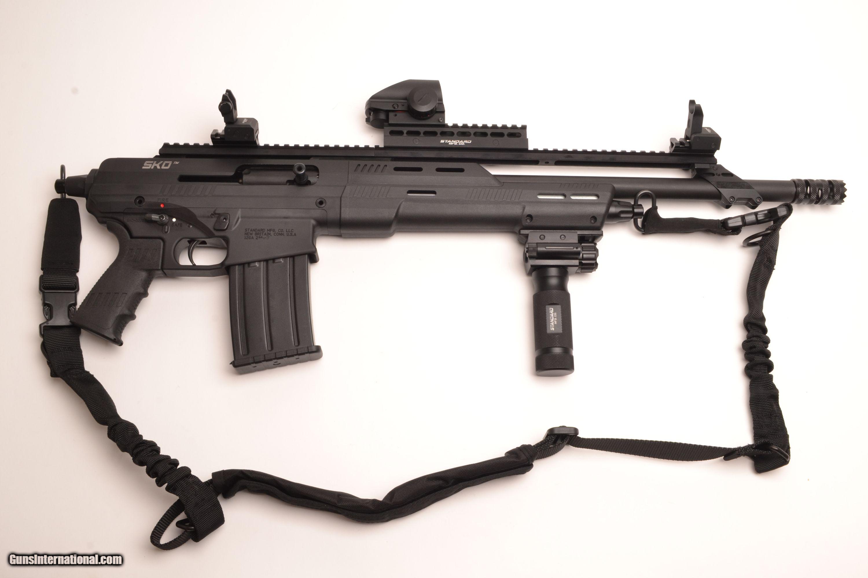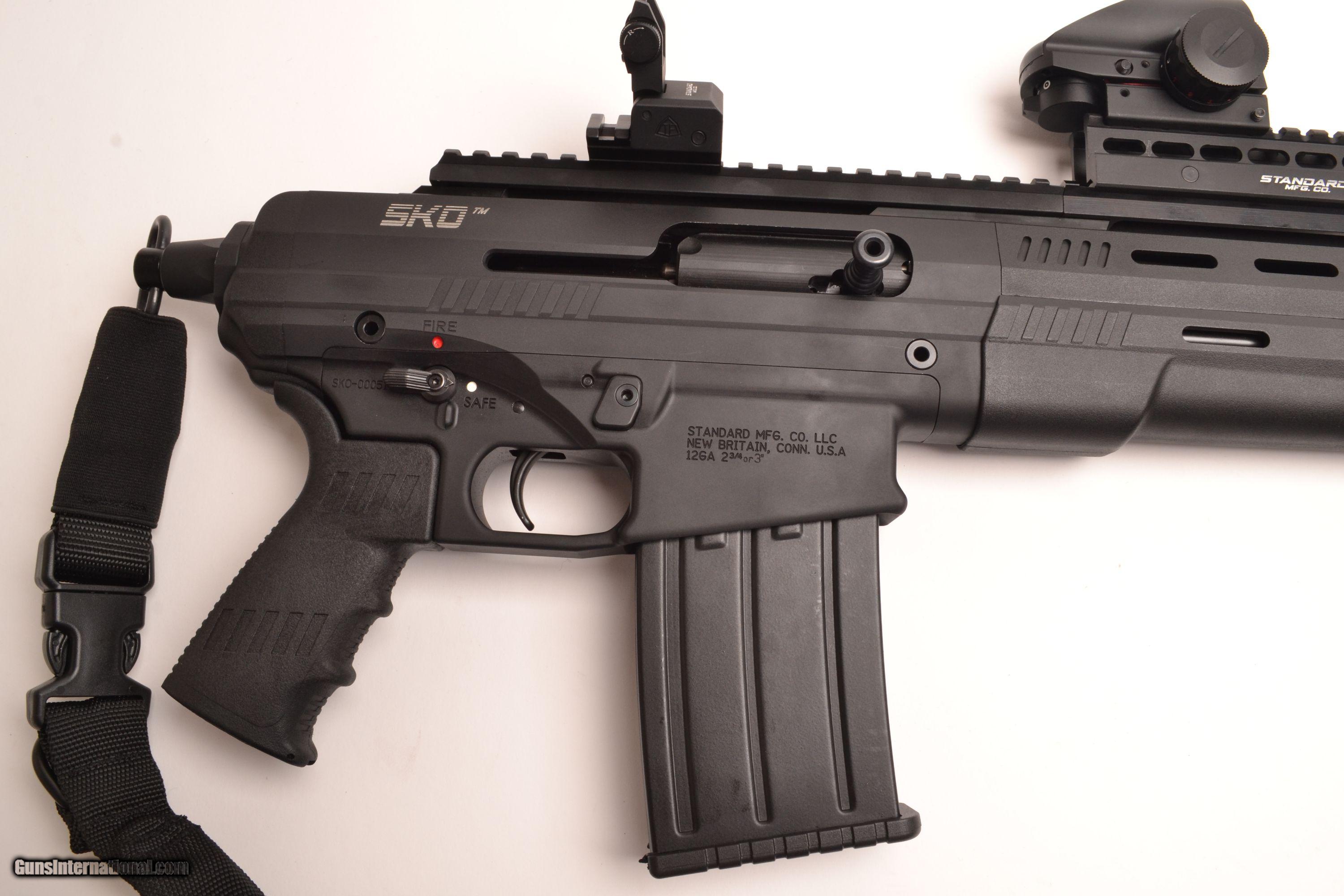 Description: Standard Manufacturing’s SKO Shorty, proudly made in the USA, offers superior firepower due to its fast semi-auto action and quick interchange magazines. It possesses the most reliable gas operated system available with smooth and flawless operation across a variety of loads. And even has bolt hold open after last round. Machined from 7075 aircraft grade aluminum with the latest technology in CNC machining, then Mil-Spec hard anodized, the SKO Shorty is both lightweight and durable. Internal components are salt bath nitride coated for optimum lubricity. Notable features include an ambidextrous safety, familiar AR-style controls for an easy transition to this platform, and a threaded muzzle to accept a variety of choke tubes, door breachers, and accessories. The length is over 26” and has an 18 5/8” barrel made from 4140 steel that accepts both 2 ¾” and 3” shot shells; which can be loaded in the included 5 round magazine with optional 2, 5, or 10 round magazines available. Large 22” picatinny top rail which provides ample room for optics, lasers, and illumination devices. **PLEASE NOTE: This item MUST be shipped to Licensed Firearms Dealer. We will contact you for a copy of the FFL that you would like to use to transfer this firearm. ** Specs: Caliber: 12 Gauge Overall Length: 28 ¾” Weight (w/out mag): 7.14 lbs. Barrel: 18 7/8”, chambered for 2 ¾” and 3” shells Chokes: Tru-Choke thread pattern Capacity: 5 round magazine; optional 2, 5, 10 round mags available Action: Gas operated semi-automatic Material: Receivers machined from aircraft grade 7075 aluminum; Mil-Spec hard anodized Controls: Ambidextrous Safety, AR-style mag and bolt release Grip: Polymer; accepts most AR-style grips Forend: Composite material with slots for MOE and bolt on rails; INCLUDES forward vertical grip The Works Package includes: Reflex Sight CXHD113 Aluminum Tactical Grip with Red Laser & Flashlight Flip up Iron AR-15 Style Backup Sights 1” High 13 Slot Riser 45° Offset Sight Mounts 2 Point Black Tactical Sling 1” Swivel Set Front Mounting Rail with Screw Door Buster Door Breaching Chokes (DP1990 Stiletto Chokes available for an additional $75) * The accessories do not come assembled onto the SKO Shorty. We offer assembly at an additional charge of $175.00 * THE SKO SHORTY IS UNAVAILABLE TO PURCHASE IN THE STATES OF NEW YORK AND CALIFORNIA. $25.00 shipping SOLD |