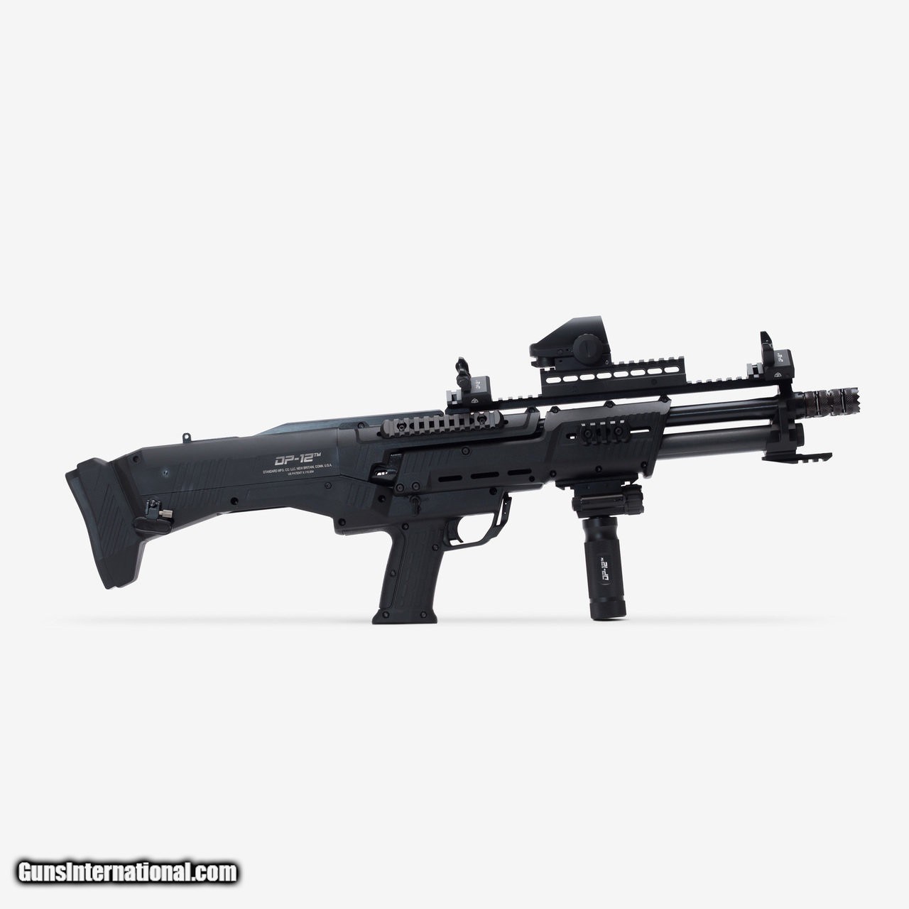 Description: Standard Manufacturing Company has raised the bar with this extraordinary shotgun that truly is one of kind that was manufactured in a state of the art facility. The innovative design and guaranteed functionality is well ahead of its time. Extreme detail has been a priority from conception through the production of these double barrel repeater shotguns. The first of its kind, a premium defense, double barreled, pump, 12 gauge shotgun that quickly fires 16 rounds. Designed for the most discerning shooters who demand extreme firepower and require consistent reliability. The stock has a QR code you can scan with your smart phone or tablet to down load the manual and other information. Please be sure and fill out the warranty card and send it to Standard Manufacturing. The spreader choke tubes are designed to shoot a devastating pattern at 25 yards. The choke tubes have Tru-Choke thread patterns. Some pictures show door breachers, these are sold separately. The DP-12 provides accessory rails and slots that allow you to customize it with your own accessories. Ergonomically designed to balance the weight of a loaded gun for quick and efficient handling with minimal recoil. Specs: Caliber: 12 Gauge Overall Length: 29.5" Weight (unloaded): 9 pounds 12 ounces Barrels: 2 x 18 7/8”, chambered for 2 ¾” or 3" shells Chokes: Both barrels include spreader choke tubes with Tru-Choke thread pattern Capacity: 14 rounds in magazine tubes + 2 in chambers - 16 total with indicator windows Action: pump action with two shots from single trigger, inline shell feeding Material: Machined from aircraft grade 7075 aluminum, Thermal coated receiver Controls: Ambidextrous safety, ambidextrous pump slide release Grip: Co-Molded non-slip rubber pistol grip, composite front vertical grip Stock: Synthetic stock Forend: Composite material with slots for MOE Rails Recoil Pad: Rubber with dual spring shock absorbing recoil mechanism Sling Points: Front sling attachment, sling swivel attachment on stock The Works Package #1 Includes: DP2001: Reflex Sight CXHD113 DP2004: Aluminum Tactical Grip with Red Laser & Flashlight DP2010: Flip up Iron AR-15 Style Backup Sights DP2011: 45° Offset Sight Mounts (2 required) DP2013: 1” High 8 Slot Riser DP2014: 4 piece MOE Rail Set DP2020: 2 Point Black Tactical Sling DP2024: 1” Swivel Set DP0209: Front Mounting Rail with Screw DP1999: Door Buster Door Breaching Chokes (DP1990 Stiletto Chokes available for an additional $75) Two Picatinny rails for accessories; seven slot rail on the bottom by the foregrip and a 13.75" 34 slot rail on top Choke tube wrench Heavy duty lock Instruction booklet and warranty card