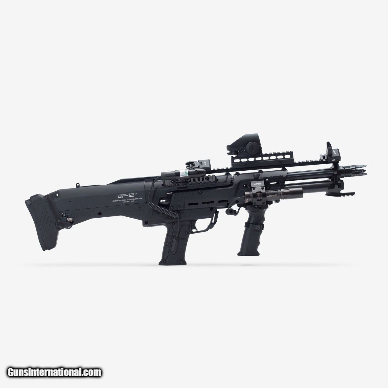Description: Standard Manufacturing Company has raised the bar with this extraordinary shotgun that truly is one of kind that was manufactured in a state of the art facility. The innovative design and guaranteed functionality is well ahead of its time. Extreme detail has been a priority from conception through the production of these double barrel repeater shotguns. The first of its kind, a premium defense, double barreled, pump, 12 gauge shotgun that quickly fires 16 rounds. Designed for the most discerning shooters who demand extreme firepower and require consistent reliability. The stock has a QR code you can scan with your smart phone or tablet to down load the manual and other information. Please be sure and fill out the warranty card and send it to Standard Manufacturing. The spreader choke tubes are designed to shoot a devastating pattern at 25 yards. The choke tubes have Tru-Choke thread patterns. Some pictures show door breachers, these are sold separately. The DP-12 provides accessory rails and slots that allow you to customize it with your own accessories. Ergonomically designed to balance the weight of a loaded gun for quick and efficient handling with minimal recoil. **PLEASE NOTE: This item MUST be shipped to Licensed Firearms Dealer. We will contact you for a copy of the FFL that you would like to use to transfer this firearm. ** Specs: Caliber: 12 Gauge Overall Length: 29.5" Weight (unloaded): 9 pounds 12 ounces Barrels: 2 x 18 7/8”, chambered for 2 ¾” or 3" shells Chokes: Both barrels include spreader choke tubes with Tru-Choke thread pattern Capacity: 14 rounds in magazine tubes + 2 in chambers - 16 total with indicator windows Action: pump action with two shots from single trigger, inline shell feeding Material: Machined from aircraft grade 7075 aluminum, Thermal coated receiver Controls: Ambidextrous safety, ambidextrous pump slide release Grip: Co-Molded non-slip rubber pistol grip, composite front vertical grip Stock: Synthetic stock Forend: Composite material with slots for MOE Rails Recoil Pad: Rubber with dual spring shock absorbing recoil mechanism Sling Points: Front sling attachment, sling swivel attachment on stock The Works Package #2 Includes: DP2001: Reflex Sight CXHD113 DP2010: Flip up Iron AR-15 Style Backup Sights DP2011: 45° Offset Sight Mounts (2 required) DP2013: 1” High 8 Slot Riser DP2014: 4 piece MOE Rail Set DP2020: 2 Point Black Tactical Sling DP2024: 1” Swivel Set DP2040: Tactical Flashlight with Strobe DP2042: Remote Switch for Flashlight DP2044: Straight Picatinny Rail Flashlight Mount DP2051: Green Laser DP0209: Front Mounting Rail with Screw DP1999: Door Buster Door Breaching Chokes *DP1990: Stiletto Chokes available for an additional $75.00 Two Picatinny rails for accessories; seven slot rail on the bottom by the foregrip and a 13.75" 34 slot rail on top Choke tube wrench Heavy duty lock Instruction booklet and warranty card * The accessories do not come assembled onto the DP-12. We offer assembly at an additional charge of $175.00 $1,725 SOLD |