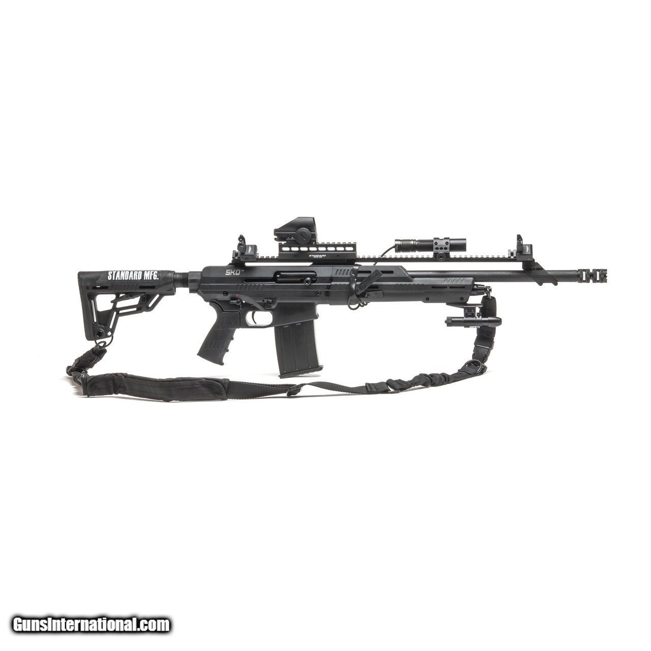 Description: Standard Manufacturing’s SKO shotgun, proudly made in the USA, offers superior firepower due to its fast semi-auto action and quick interchange magazines. It possesses the most reliable gas operated system available with smooth and flawless operation across a variety of loads. Machined from 7075 aircraft grade aluminum with the latest technology in CNC machining, then Mil-Spec hard anodized, the SKO is both lightweight and durable. Internal components are salt bath nitride coated for optimum lubricity. Notable features include an ambidextrous safety, familiar AR-style controls for an easy transition to this platform, and a threaded muzzle to accept a variety of choke tubes, door breachers, and accessories. The length is over 26” and has an 18 5/8” barrel made from 4140 steel that accepts both 2 ¾” and 3” shot shells; which can be loaded in the included 5 round magazine with optional 2, 5, or 10 round magazines available. Large 22” picatinny top rail which provides ample room for optics, lasers, and illumination devices. Specs: Caliber: 12 Gauge Overall Length: 38” Weight (w/out mag): 7 lbs. 10 oz. Barrel: 18 7/8”, chambered for 2 ¾” and 3” shells Chokes: Tru-Choke thread pattern Capacity: 5 round magazine; optional 2, 5, 10 round mags available Action: Gas operated semi-automatic Material: Receivers machined from aircraft grade 7075 aluminum; Mil-Spec hard anodized Controls: Ambidextrous Safety, AR-style mag and bolt release Grip: Polymer; accepts most AR-style grips Stock: 6-position buttstock; accepts any Mil-Spec buttstock Forend: Composite material with slots for MOE and bolt on rails. The Works Package includes: Reflex Sight CXHD113 Aluminum Tactical Grip with Red Laser & Flashlight Flip up Iron AR-15 Style Backup Sights 1” High 8 Slot Riser 45° Offset Sight Mounts(2) 2 Point Black Tactical Sling 1” Swivel Set Front Mounting Rail with Screw Door Buster Door Breaching Chokes (DP1990 Stiletto Chokes available for an additional $75) * The accessories do not come assembled onto the SKO. We offer assembly at an additional charge of $175.00 * THE SKO IS UNAVAILABLE TO PURCHASE IN THE STATES OF NEW YORK, MASSACHUSETTS, CALIFORNIA AND CONNECTICUT. $1,500 Shipping: $25 SOLD |