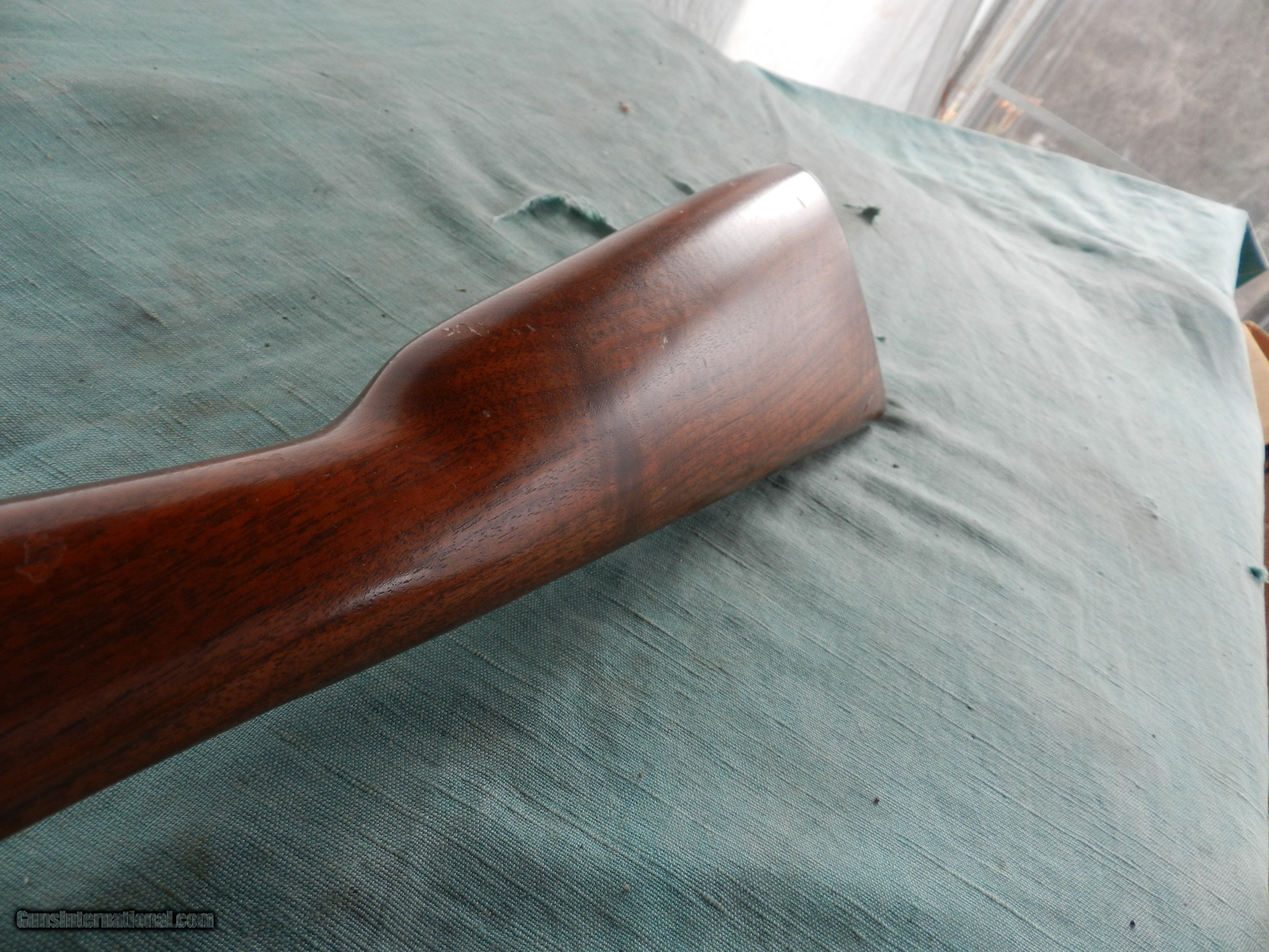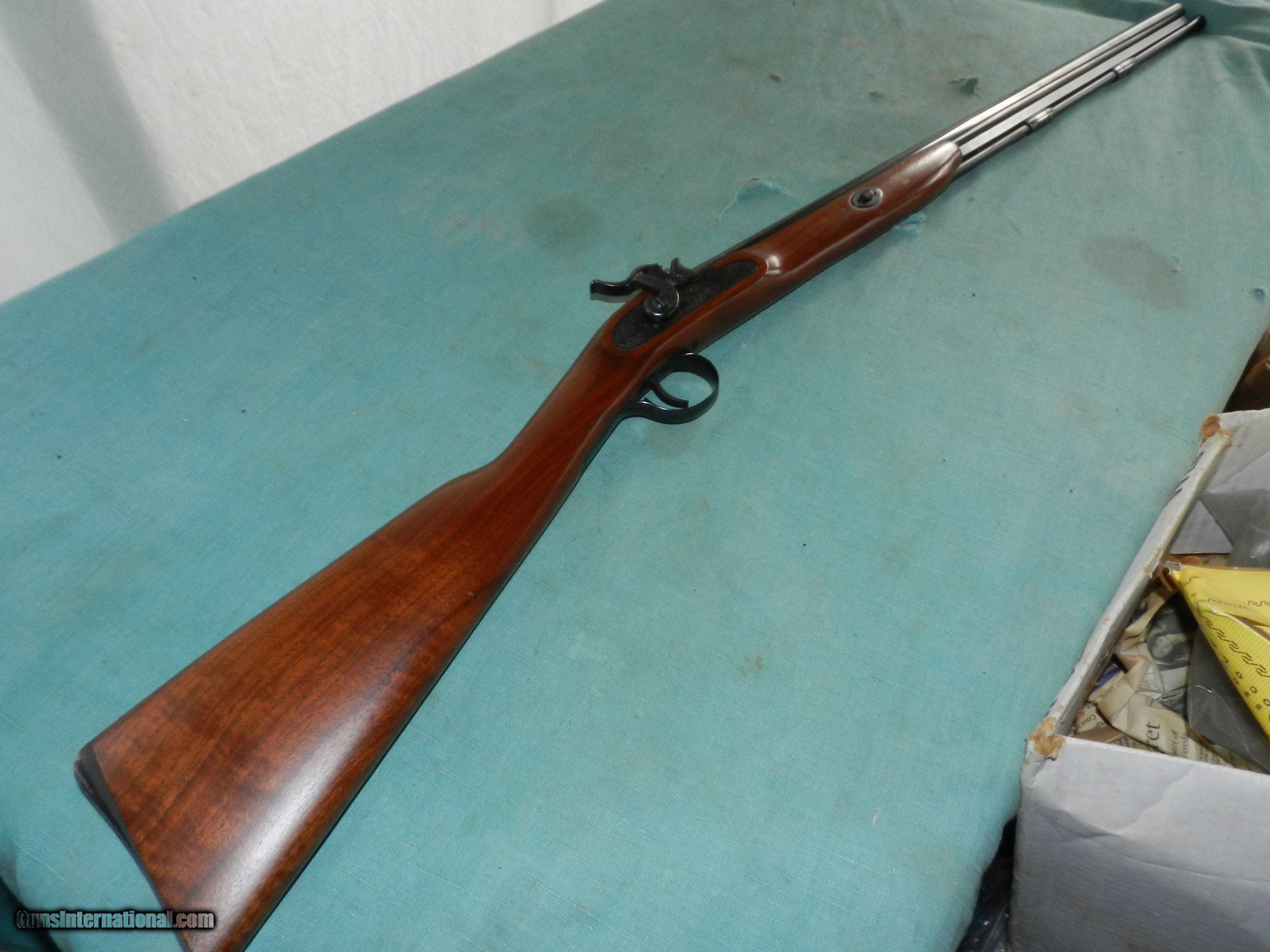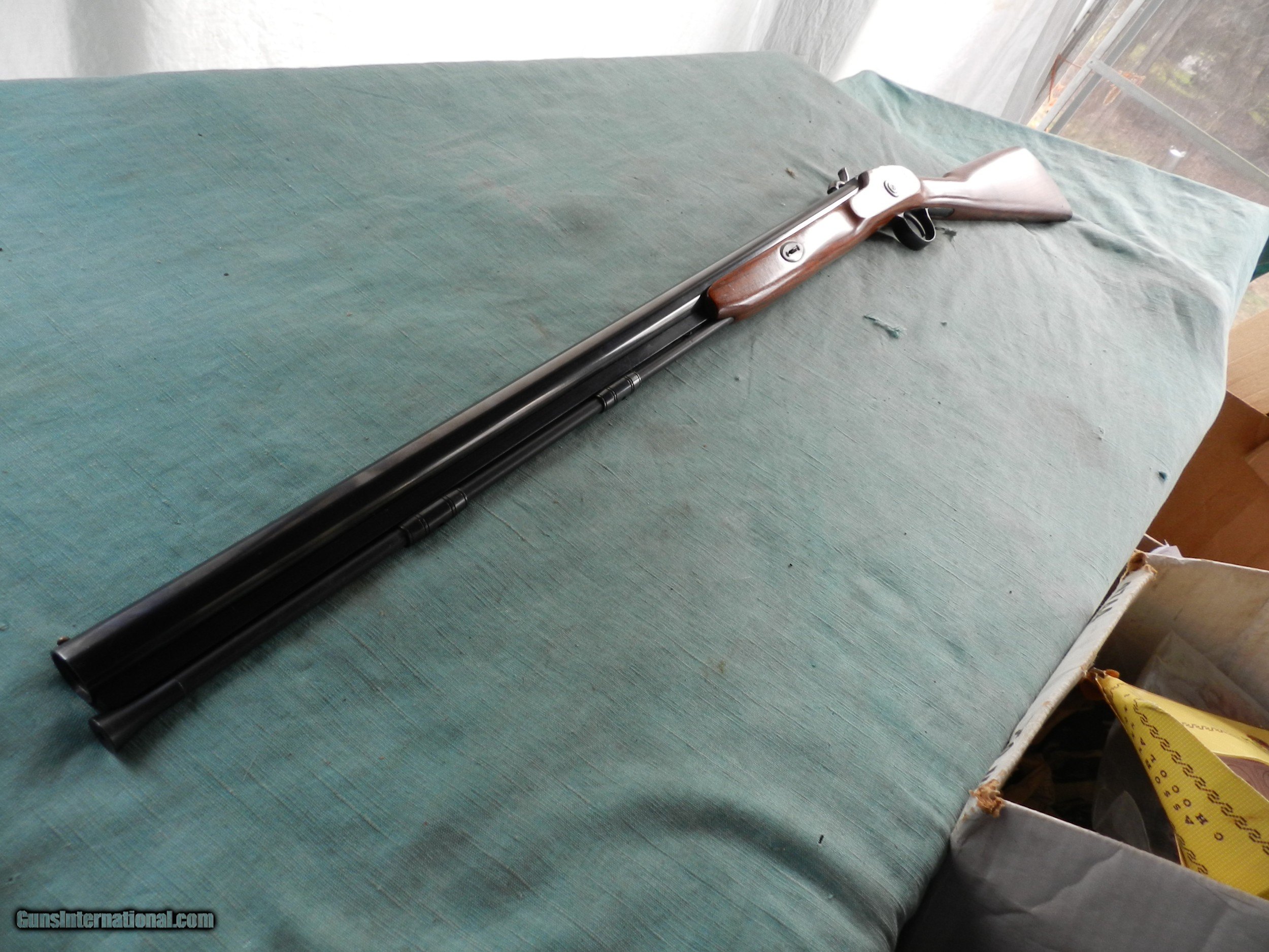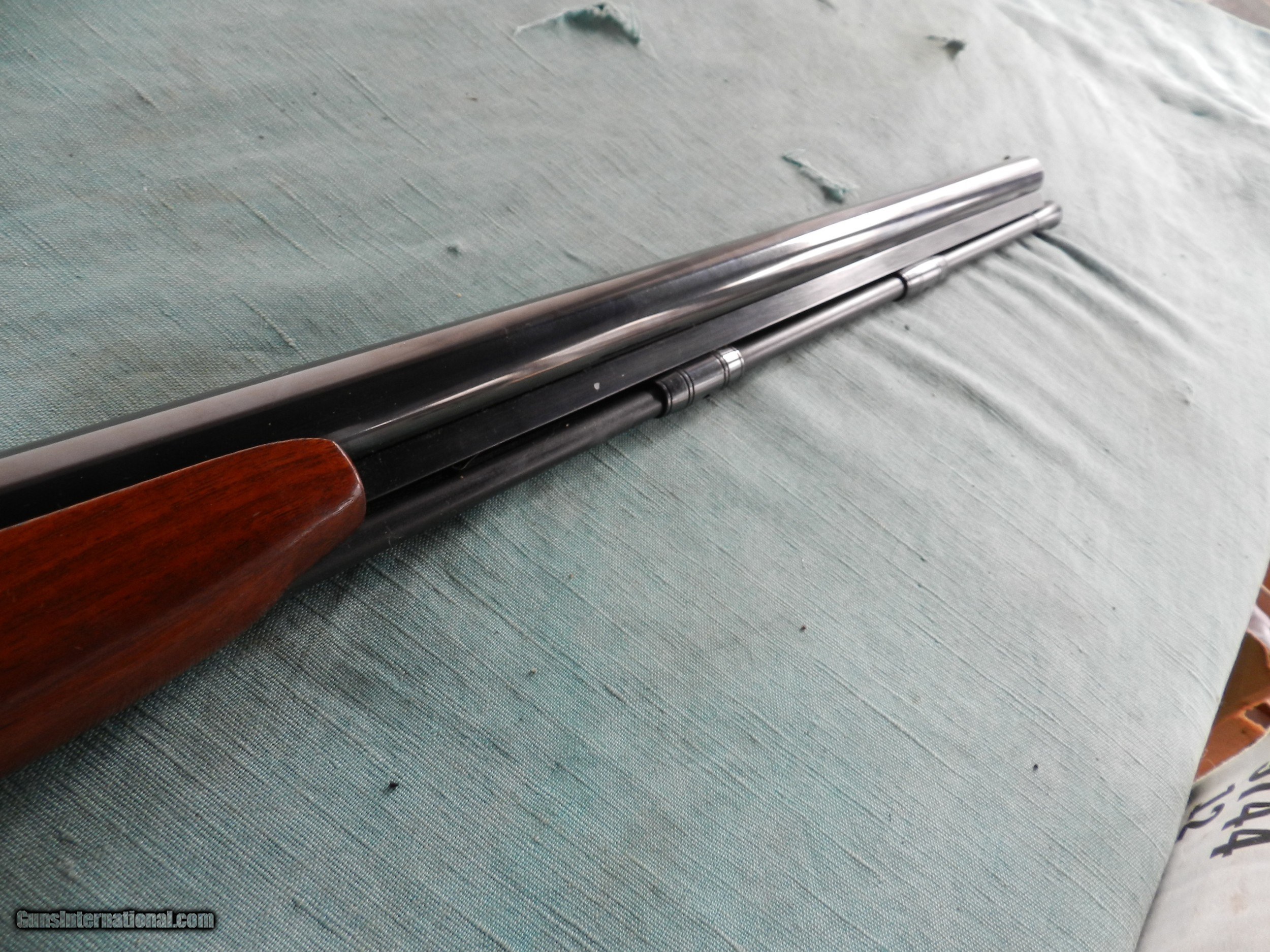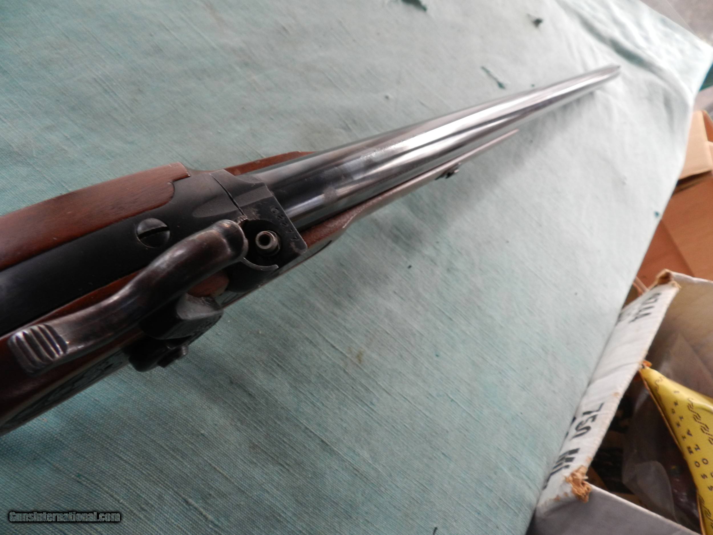 Description: With a serial #02277,in 12 Ga., 28” barrel with a mostly bright bore showing scattered shallow pits about 6" down from the muzzle, nut not fully , and then further down is clean; won;t affect the shooting accuracy. The metal surfaces of this shotgun retain about 96% original blue showing the expected loss around the nipple and a 1/2” circle of abrasion loss on the rear of the barrel. The lock displays generous amounts of case hardening with a few spots of staining with loss on the top of the hammer. The straight grip walnut stock rates very good with a few small impact marks on the left stock flat and toe line displaying an attractive straight grain pattern with a bit of vertical figure in the buttstock. The shotgun is sighted with a single brass bead, functions well mechanically and includes a fiberglass tulip head ramrod. The muzzle measures about CYL choke.When buying a gun always have it examined by a competent gunsmith before shooting. To buy a gun from me you must get a direct email for me, with details, and shipping cost. We don’t have a web site .I prefer money orders or a check. Item ships when funds come in. I try to keep guns affordable, which means I make less money than most dealers. You won’t get altitude sickness, or nose bleed, with my prices! I consistently have the best selection of older guns If you attempt to buy, you must still contact us for details . Best to email to buy. Sometimes a local person can stop buy and purchase before the gun is removed. Sometimes not home to get calls. Some guns are required shipment to a gun dealer near you for a transfer to you when it arrives. Otherwise many older or black powder guns ship to your door. With the widest selection of older guns at great prices, We don’t have a store, and sell on the internet only. I’m easy to get along with. SOLD |