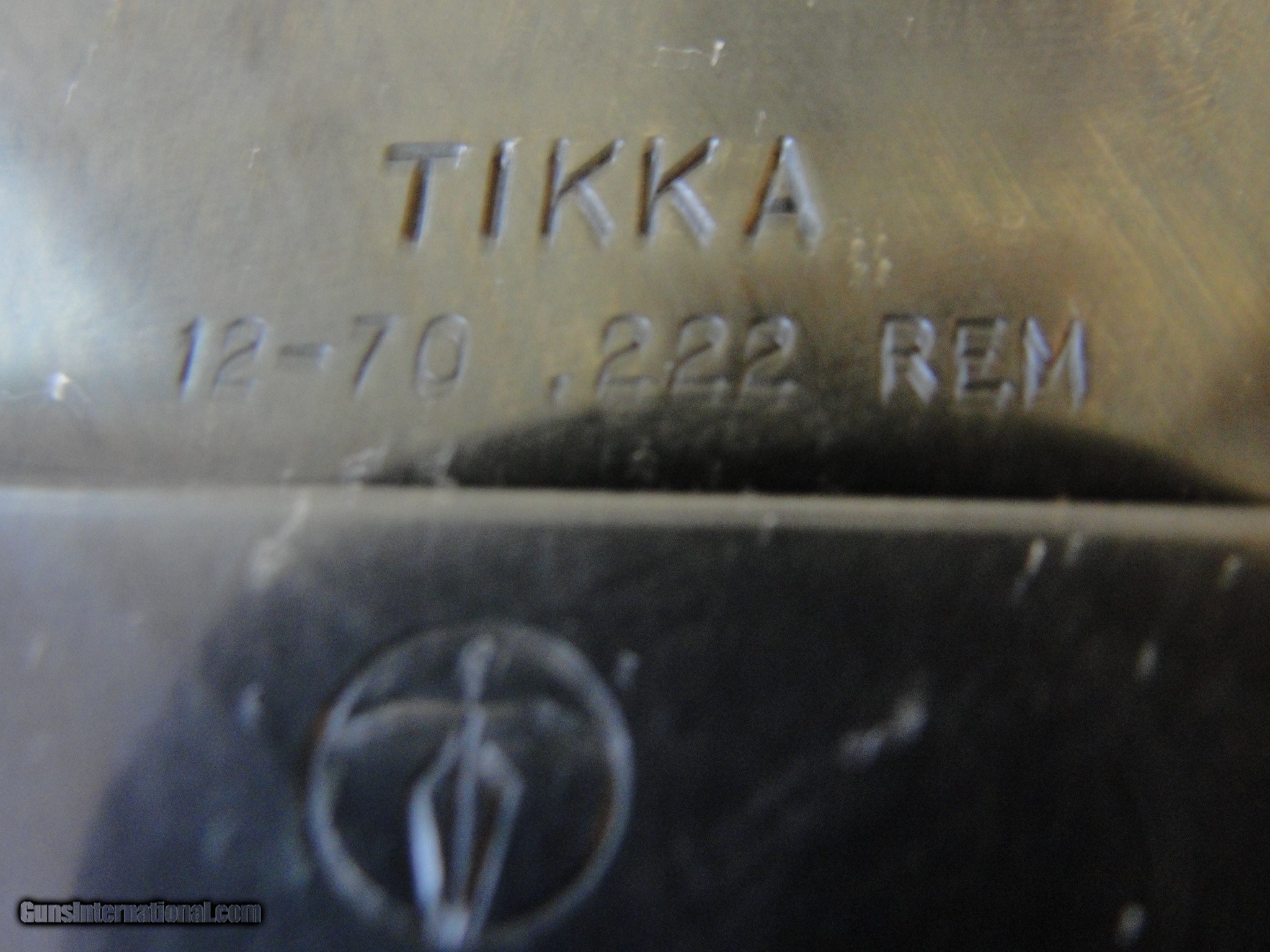 Description: Tikka O/U 12 ga / 222Rem. Excllent condition W/ Tasco3-9 power scope 26in barrel over all lenth W/ sling 12ga 2 3/4 in or 3in Mag. SOLD Rifle Caliber: .222 Remington Shotgun Gauge: 12 Gauge Manufacturer: Tikka Model: 12ga / 222Rem. Serial Number: 14386 Barrel Length: 26in Bore: Exc. Condition: Exc. Metal Condition: Exc. Wood Condition: Exc. Bore Condition: Exc. Barrels: Exc Barrel Type: Steel Butt Pad: Orig. Engraving: Fore arm |