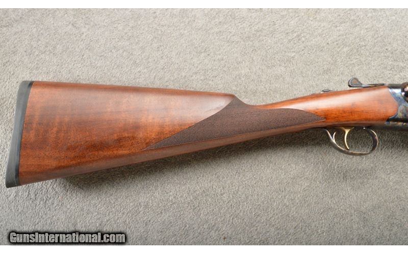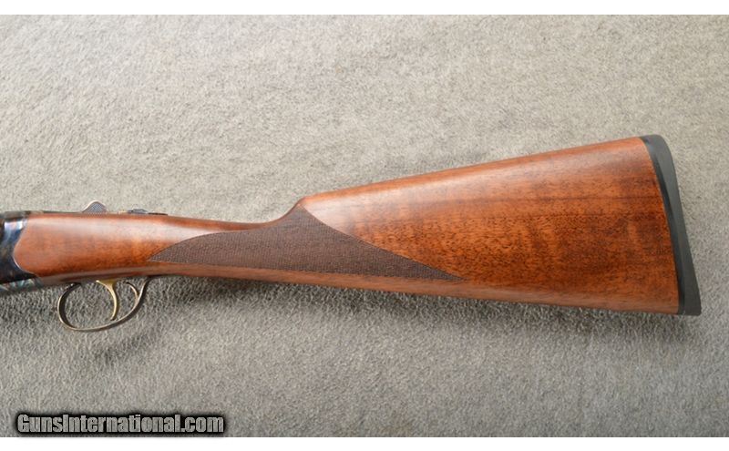 Description: This is a value prices shotgun with very nice features. This Tri-Star Bristol 20 gauge shotgun has 28 inch blue barrels with ejectors and screw in chokes (5) with a nice finish. The frame is a chemical case color that looks quite nice. The straight grip walnut stock and matching forearm would be a grade II-III or better. All in all a very nice shotgun for the money. 20 Gauge SOLD Chambers: 3 inch side X side with ejectors. Metal Condition: New in the box. Wood Condition: New in the box. Bore Condition: New in the box. Barrels: 28 inch blue. Triggers: Single gold color trigger. Stock Dimensions: 14 1/4 inch LOP. Fore End: Very nice grade II-III walnut with checkered splinter forearm. Butt Pad: Matching checkered pistol grip butt stock with a black rubber butt pad. Weight: 6 Lbs even. Sights: Single brass front bead. Chokes: "Screw in, comes with a full set of 5 chokes. Item Location: Owatonna, MN |