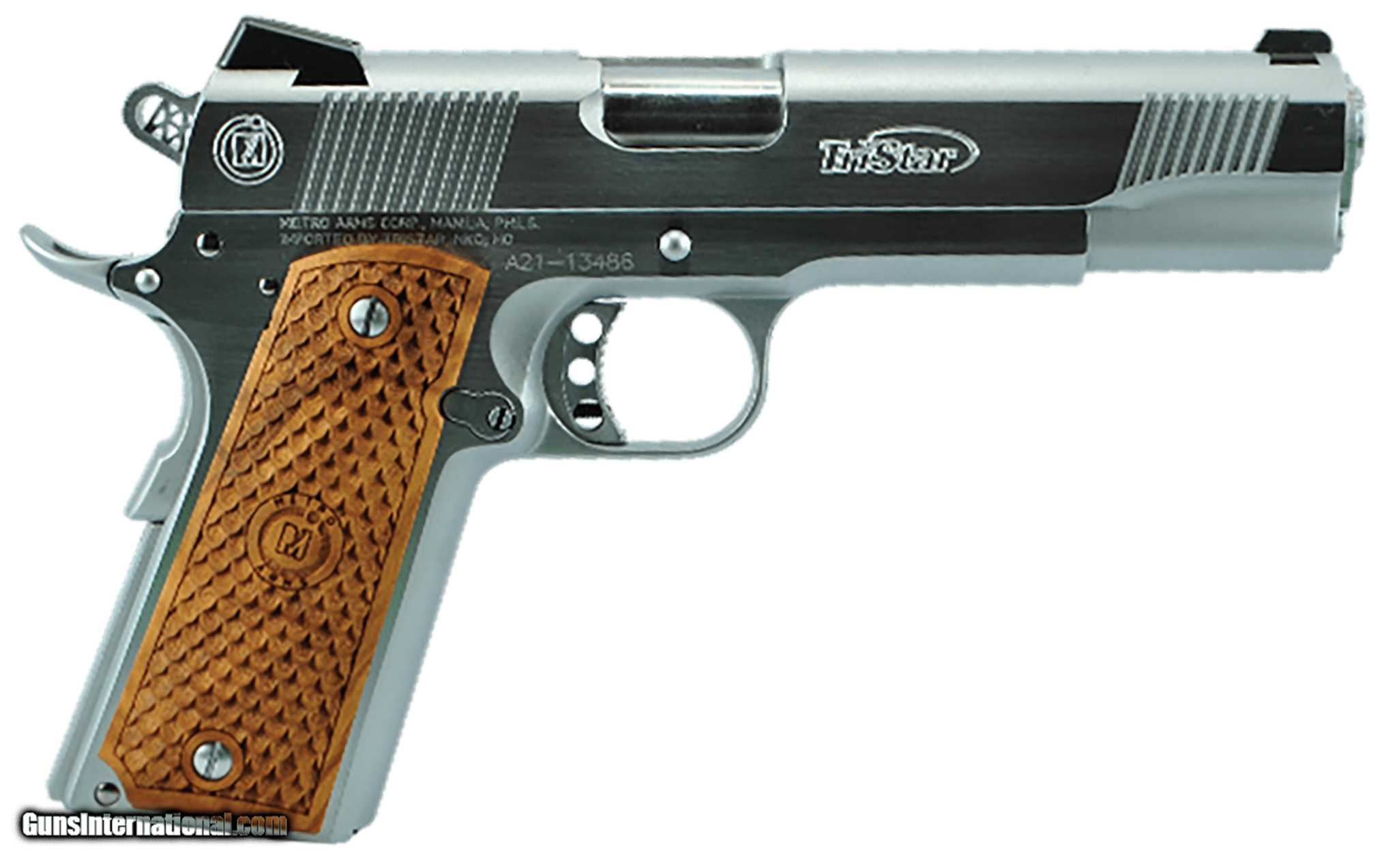 Description: Guns Listing ID: 188594 10mm, semi-automatic with steel frame, steel slide and wood grips. Single Action. Front dovetail & Rear Novak sight. Custom hardwood grips with logo. Extended beavertail & Thumb safety. Skeletal combat hammer. Front and rear slide serrations. 1 Magazine included, and packaged in hard plastic case. Also includes a gunlock, cleaning kit and owners manual. SOLD Manufacturer: TRISTAR ARMS INC. Model: American Classic II 1911 Caliber Info: 10MM Condition: new Barrels: 5 BARREL Action: STRIKER Finish: CHROME Weight: 2.47 lbs. |