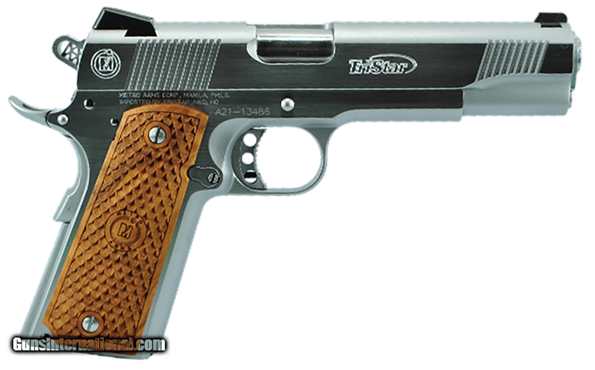 Description: Guns Listing ID: 398342 10mm, semi-automatic with steel frame, steel slide and wood grips. Single Action. Front dovetail & Rear Novak sight. Custom hardwood grips with logo. Extended beavertail & Thumb safety. Skeletal combat hammer. Front and rear slide serrations. 1 Magazine included, and packaged in hard plastic case. Also includes a gunlock, cleaning kit and owners manual. SOLD Manufacturer: TRISTAR Model: American Classic II 1911 Caliber Info: 10MM Condition: new Barrels: 5" barrel Finish: CHROME |