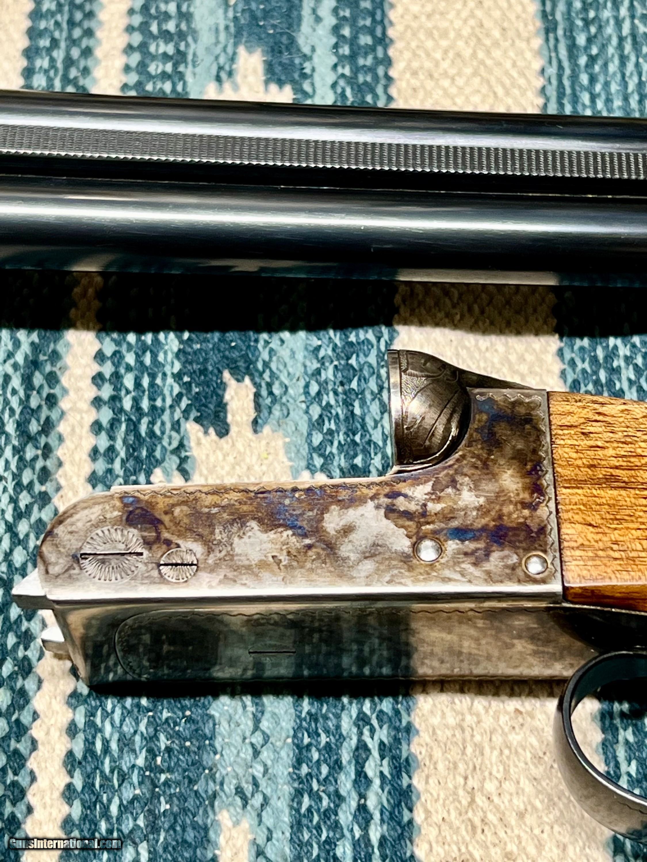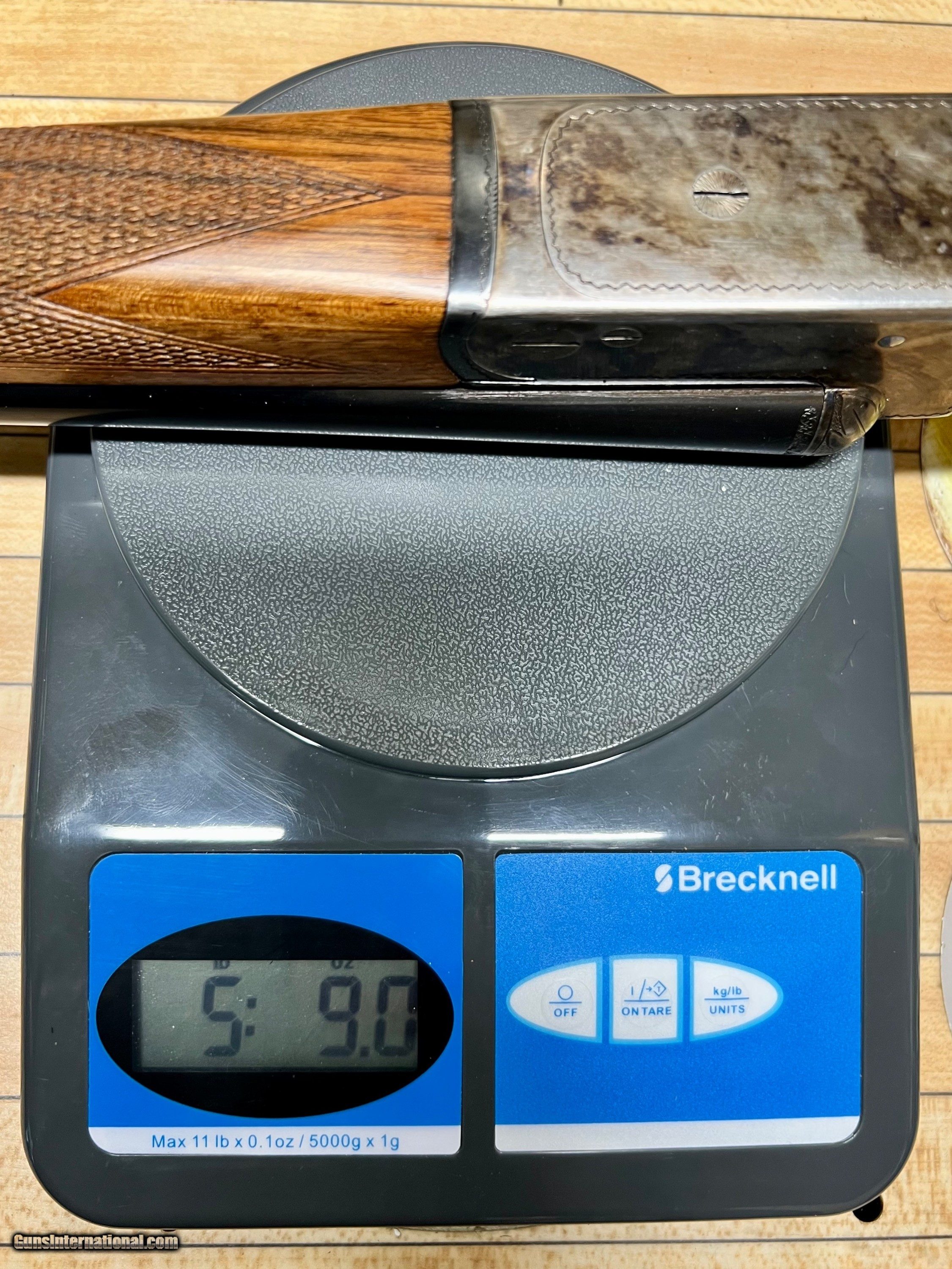 Description: Sale Pending Ugartechea 20ga boxlock SxS. A solid lightweight shotgun from a good maker that locks up tight. This one has additional engraving on the fences, disc-set strikers and hidden third fastener. 26” barrels, 3” chambers, choked M & IC. Bores are bright and clean, barrel blue is good with a few handling marks from honest use. English stock with 14-5/8” LOP to a pachmayr old english pad. Wood is nice for a uggie GR1 gun with nice contrasting figure and very few handling marks. Nice handling shotgun that weighs 5 lbs 9 oz. This gun is an Exell Arms import, model 221. $1300.00 SOLD Shotgun Gauge: 20 Gauge Manufacturer: Ugartechea Model: Gr 1 Barrel Length: 26” Chambers: 3” Ejectors: Non Ejector Condition: Very Good Barrel Type: SxS Action: Boxlock Triggers: Double Stock: English Stock Dimensions: 14-5/8” x 1-1/2” x 2-3/8” Fore End: Splinter Butt Pad: Pachmayr Old English LOP: 14-5/8” Weight: 5lbs - 9oz Choke Left: M Choke Right: IC |