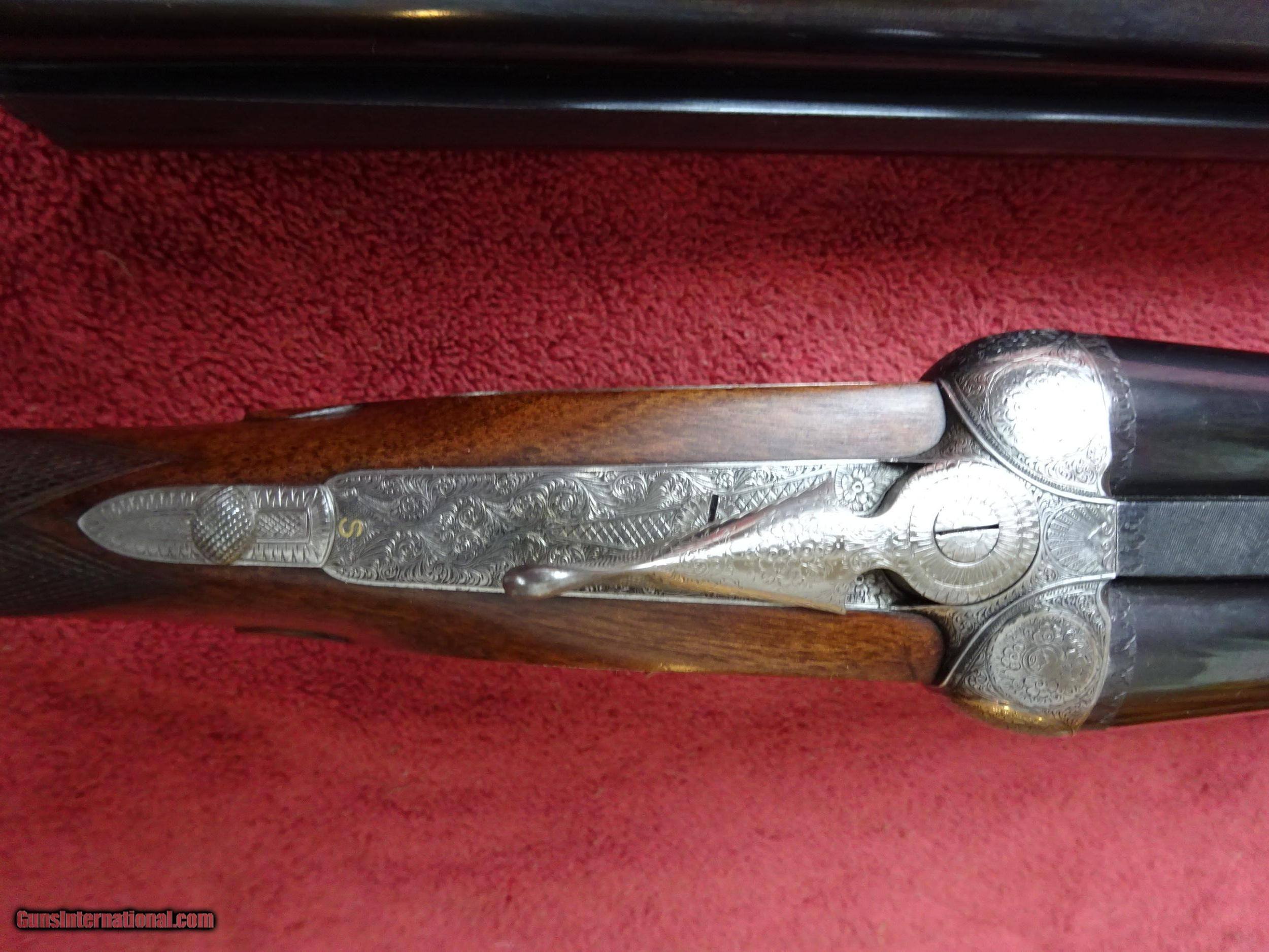 Description: UGARTECHEA HIGH GRADE TWO BARREL SET, 12 GAUGE SIDELOCK EJECTOR DOUBLE. COIN FINISH WITH FULL COVERAGE, ENGLISH STYLE ROSE AND SCROLL ENGRAVING, MAKER'S NAME ON BOTH LOCKPLATES, BOTTOM AND BOTH BARRELS. SIDE CLIPS, COCKING INDICATORS, AUTO EJECTORS, DOUBLE TRIGGERS WITH FRONT ARTICULATED. AUTO SAFETY, CHOPPERLUMP BARRELS, MODIFIED AND FULL, 2 3/4" CHAMBERS. 1950s VINTAGE NITRO PROOF MARKS. STRAIGHT GRIP STOCK, SMALL BEAVERTAIL FOREARM WITH ANSON RELEASE. NICELY FIGURED EUROPEAN WALNUT, VERY FINE CHECKERING, DIMENSIONS 1 3/8" X 1 3/4" X 13 7/8", SILVERS 1/2" PAD. 6 POUNDS 15 OUNCES. VERY PLEASING, VERY HIGH-QUALITY SPANISH DOUBLE. $2750.00 + $60.00 Insured shipping to an FFL address. Layaway is available. See all Pats gun listings on this site! We also have hundreds of pieces of ORIGINAL gun company advertising & memorabilia available for sale on our site SPORTINGCOLLECTIBLES. We have no reprints or reproductions. Email for more information. SOLD |