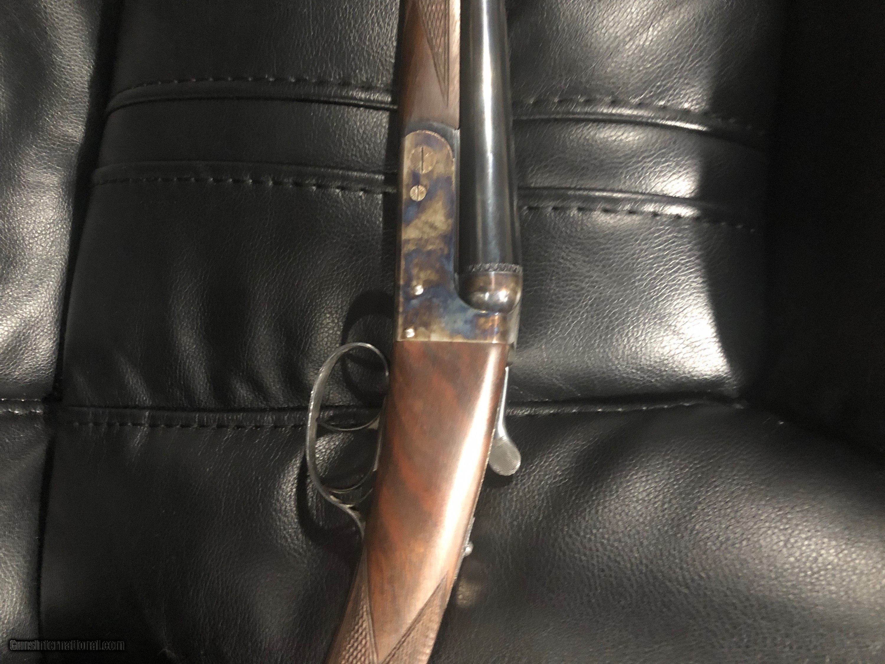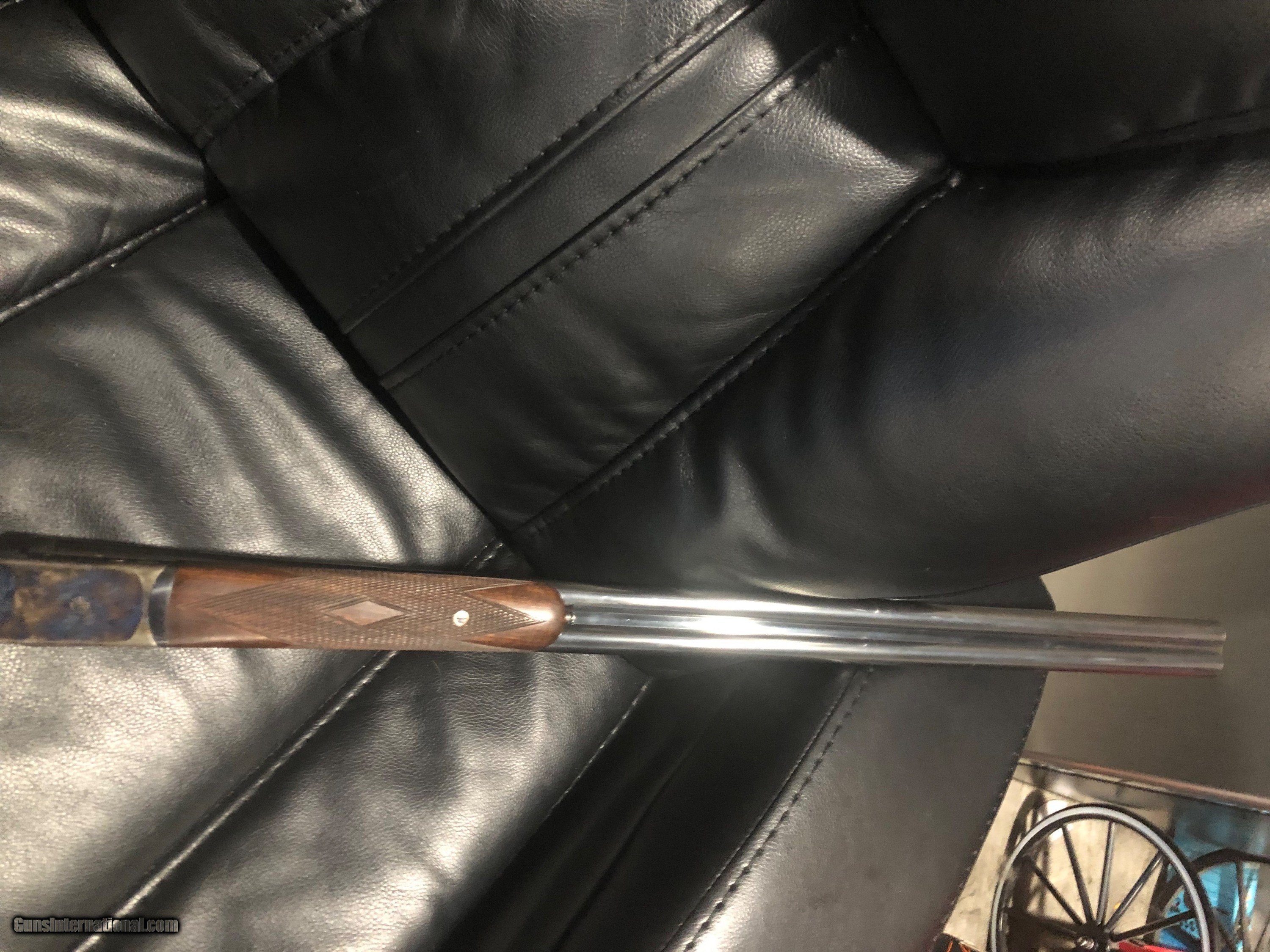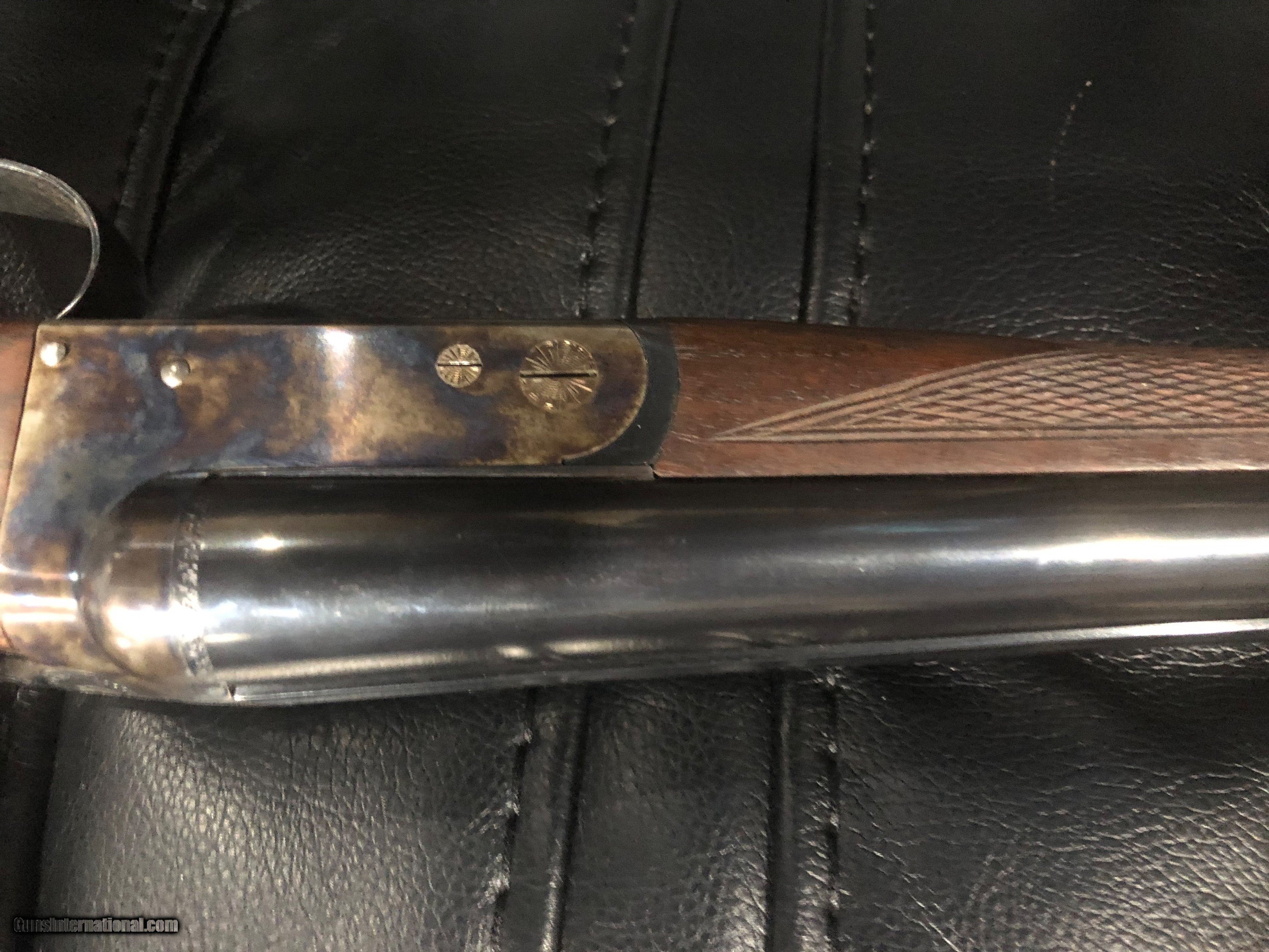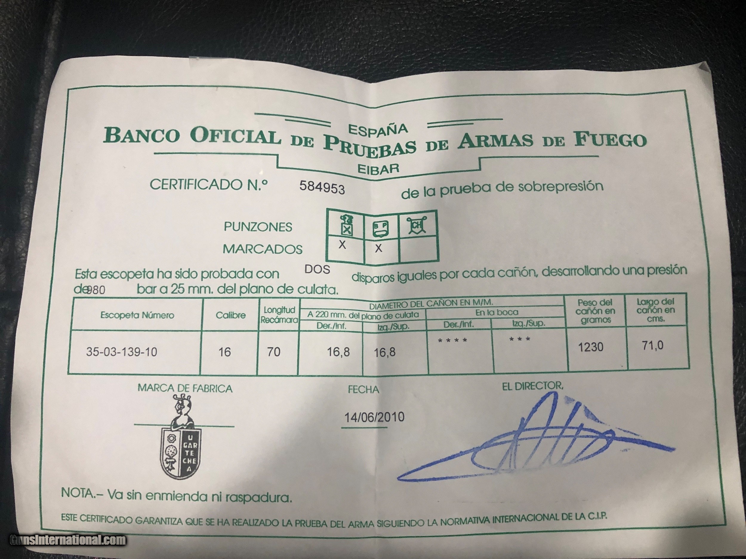 Description: Beautiful grade 1 Model 30 16 gauge SXS box lock Uggie, color case hardening remains at almost new level, improved cylinder and modified chokes. 28 inch barrels with a checkered wood butt plate. Box and makers proof included. Double triggers, factory dimensions. I took it pheasant hunting once and went 3 for 3. SOLD Shotgun Gauge: 16 Gauge Manufacturer: Ugartechea Model: 30 Serial Number: On manufactures proof Bore: 16 Chambers: 2 3/4 Ejectors: Extractors Condition: 97 Metal Condition: 98 Wood Condition: 97 Bore Condition: 98 Barrels: SxS Action: Break Triggers: Double Stock: 14 1/2 Lop English Stock Dimensions: Factory Stock Drop: Factory Stock Comb: Factory Stock Heel: Factory Stock Cast: Factory Fore End: Splinter Butt Pad: Wood LOP: 14 1/2 Finish: Oil Weight: 6.3 Sights: Bead Manufacture Date: 2009 Chokes: Fixed IC Mod Engraving: Slight scroll |
