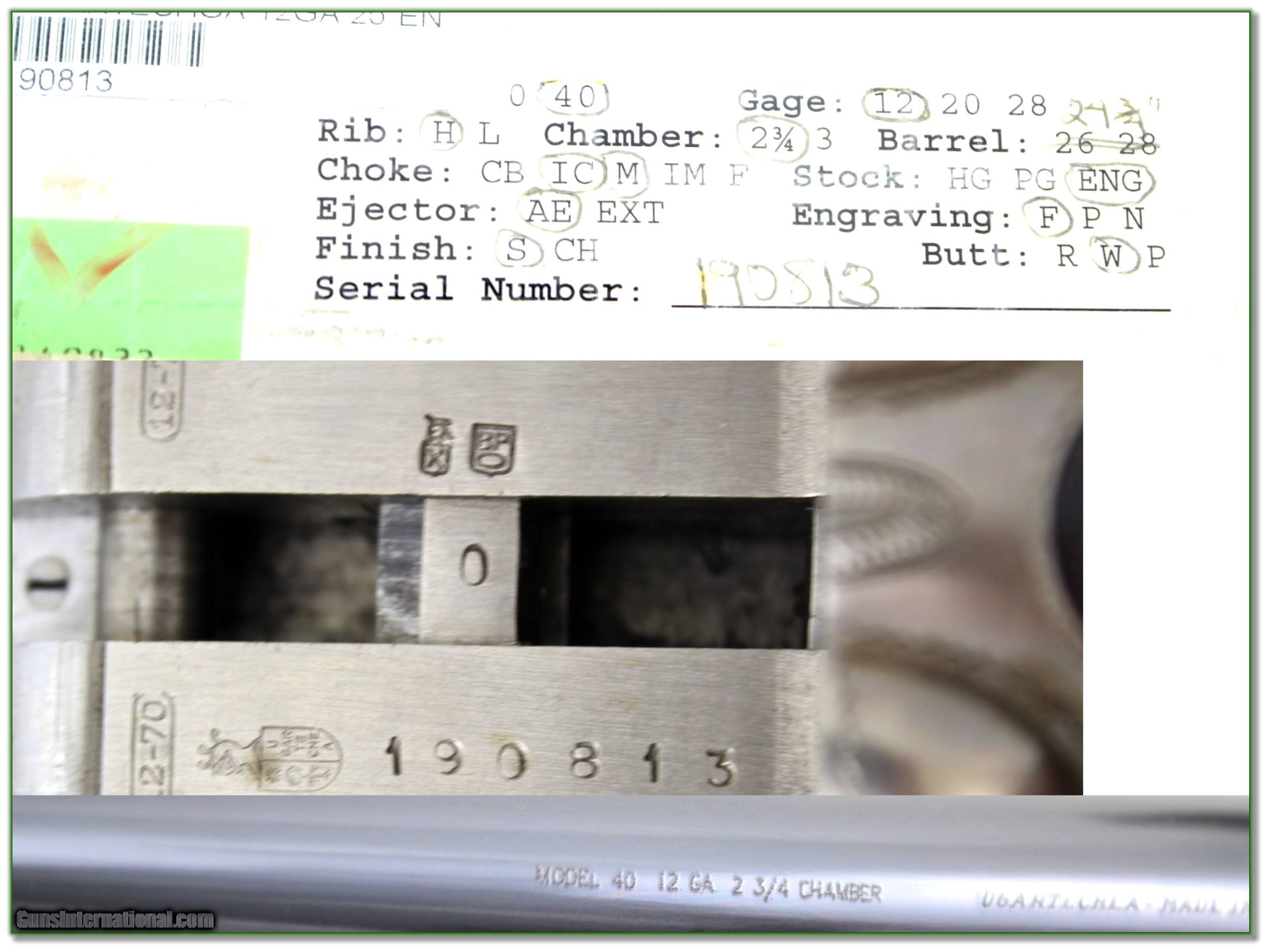 Description: This is a like new and in the box Ugartechea Model 40 12 gauge. It has beautiful wood with checkered butt. The barrels are 25in choked Modified and IC. It has an English Stock, splinter forearm with double triggers. It will make a classic bird gun! I am selling this one on consignment and as such lay-a-way can’t be used. It does of course have the standard 3-day inspection. Shipping and insurance is $39. Please email me with any questions or larger pictures. (Consign your quality firearms with Shooting Investments for only 12%! Let me know if you have any you would like to sell!) 20-0657 Payment: Payment is by Money Order, Cashiers Check or Personal Check. I can now also accept Credit Cards (MasterCard, Visa, Discover & American Express) with a 3% convenience fee. Shipping: The shipping charge will be listed in each description. It is $39 for most firearms. Some heavy guns or those insured for over $2000 will be higher. Shipments to Alaska and Hawaii are higher because air shipment is required. Most firearms are shipped on Tuesday and Thursday and usually in 5 days of receipt of payment. We package all shipments carefully and insure them. Optics are shipped Priority Mail and most other non-firearm shipments are shipped First Class. Returns: Our return policy is simple. If for any reason you are not pleased with your purchase, you may return your item for a full refund of purchase price. Ammunition cannot be returned. It is important to us that you are happy. Guns cannot be fired or dissembled before returning them and they must be returned in the same condition as received. Notification of a return must occur with-in 3 days of receipt at your dealer. Shipping, convenience and dealer fees are not refundable and are the responsibility of the buyer. Lay-a-way: If needed, we offer a 60 day lay-a-way option on most firearms. It is 1/3 now, 1/3 in 30 days and 1/3 in 60 days. Lay-a-way firearm sales are final and if not completed the first payment cannot be returned. Consigning your firearms with Shooting Investments: We will help you get top dollar for your firearms. While most local guns shops charge 20% or more, our fee is only 12% with a minimum of $75. At your local gun shop it might take months to sell. Selling on-line provides instant access to thousands of interested buyers. You won’t find any other on-line dealer willing to sell your firearms for only 12% or listing every gun on 3 separate s. Selling through an House typically costs the seller 15% and the buyer an addition 15% (so 30%) and you have to wait several months to sell and longer to receive funds. If properly priced, we will sell your firearms in a few weeks. Send us an email or give us a call and we’ll explain how easy it is for you to get top dollar. Trading: Trading for use is really just buying your gun to re-sell. If you have a gun you want to trade, please email a picture and we will let you know what we can give or it. You will always get more if we sell it for you on consignment. Help for California Buyers: We are happy to ship to California. It is the buyer’s responsibility to make sure any item you buy is legal in your state. We are also happy to help with your purchase of a firearm from someone other than us. If you see a gun you would like to buy but the seller can’t or won’t ship to California they can ship to use and we’ll then ship it to your California dealer. The cost for this service is only $30 + shipping. Let us know if we can help! SOLD |