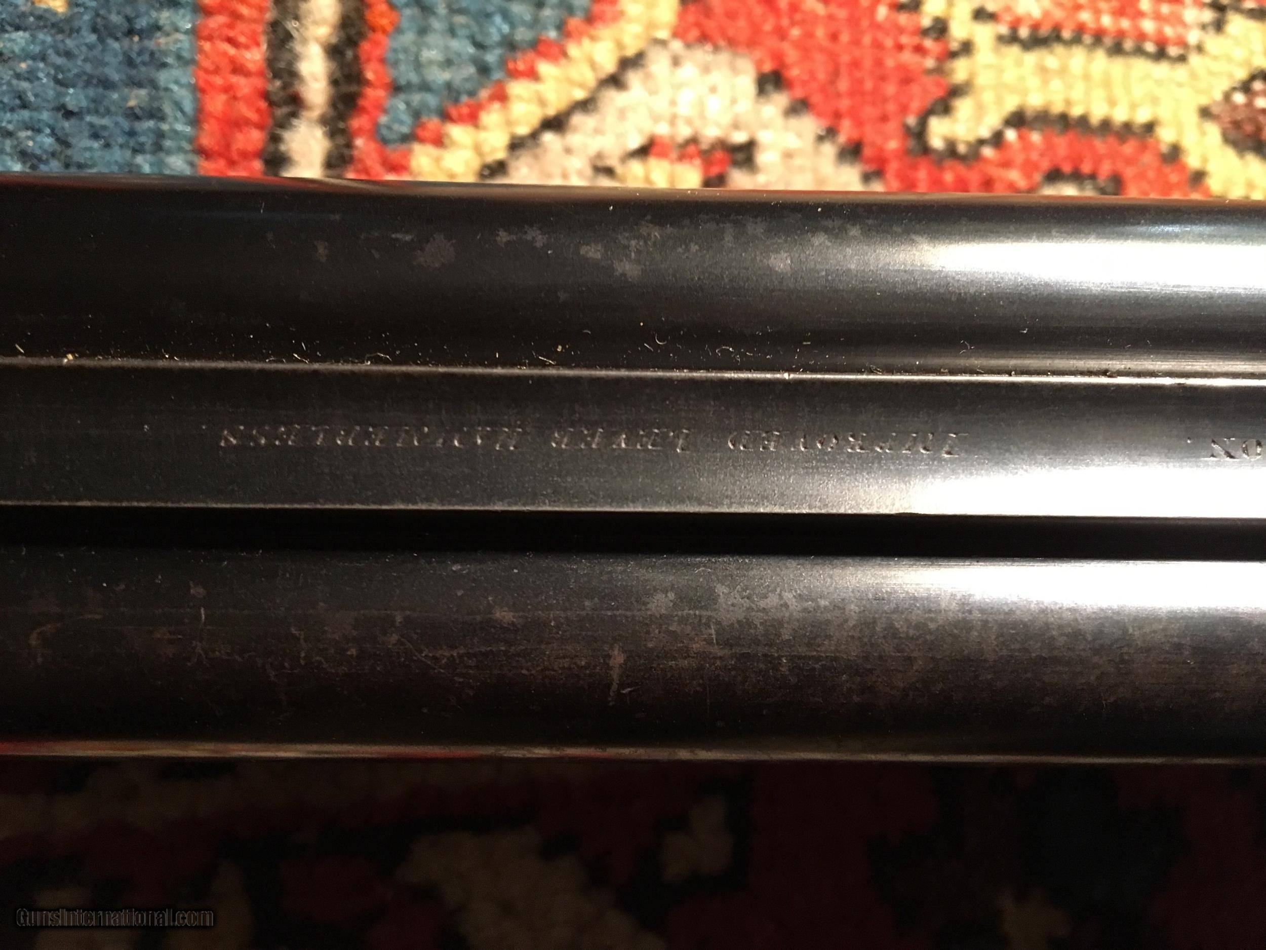Description: Moore and Harris 12 gauge sidelock, made by WC Scott, Scott bought Moore and Harris to get their retail network im America in the 1880s. crystal indicator windows, gold hammers, extractors, 26 mod and imp cyl barrels, no pits shiney bores, figured stock, all original, no issues, engraved high end British sidelock. Good dimemtions on stock. Scott patient top lever cocks the hammers, original case colors and blue and stock finish, used very little, 6.8 pounds. A sweet bird gun. silver oval is inscribed J W Coulston, a Philadelphia banker. SOLD Antique: Yes |