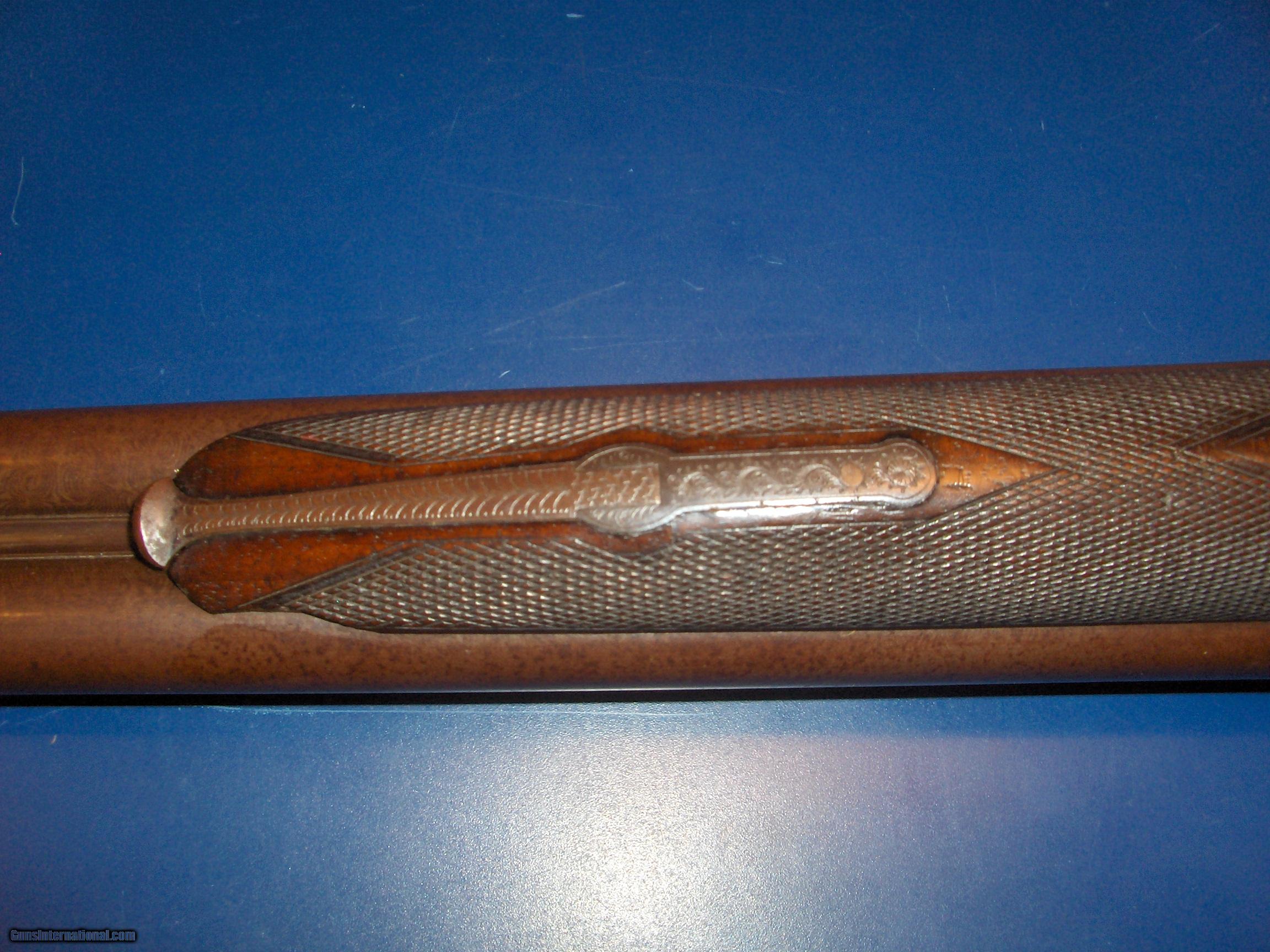 Description: W C Scott & Sons 12 ga Hammer Gun Serial # 9079 DOM 1878 30" Damascus barrels marked "Not for Ball" Rebounding hammers. Game scene engraved. Horn butt plate. Bores bright & slightly pittrd. Top rib marked "W & C Scott & Son Makers & Patentees London". Small sliver of wood missing from right side of lever latch fore end. SOLD Antique: Yes |