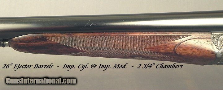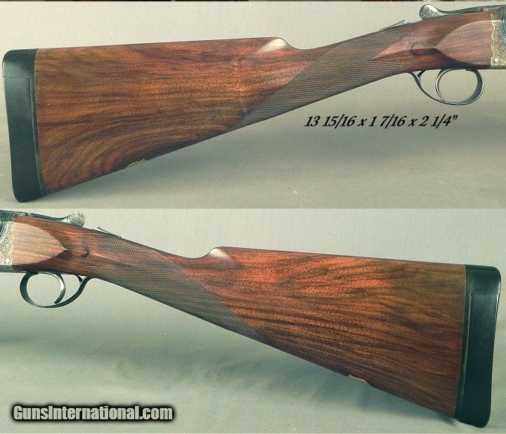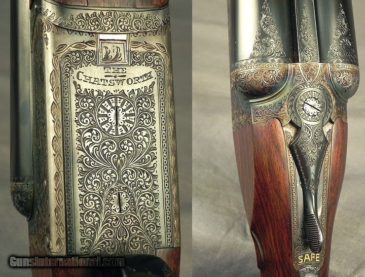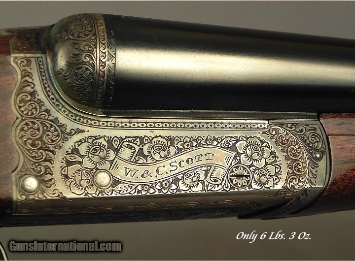 Description: #147200, W & C Scott Gunmakers, Birmingham, England: A W. C. Scott SxS Highest Grade Boxlock Model Chatsworth Deluxe 12 Bore Made 1987, This was Scott's highest grade boxlock in the 1980 to 1990 period, There were about 200 Model Chatsworth built, This gun is with 26" Ejector Dovetail Lump barrels at .726 .011 & .027" (Imp.Cyl. & Imp. Mod), Original 2 3/4" chambers, Single non-selective trigger, Scalloped action back, Fairly nice wood with decent black/brown contrast, Carved shoulders at the knuckle of the forend, Splinter forend with a frontal Anson release, Straight hand stock at 13 15/16 x 1 7/16 x 2 1/4" over a 1" pad, Slight Cast-Off for the right hand, 6 lbs. 3 oz., 98% coverage of floral & scroll that has more depth than lower grade models, Initial's on the escutcheon in the stock line, The gun retains 92% original case colors, The barrels retain 98% original blue, The wood finish remains at 95%, The checkering is at 99%, The breech face retains 90% case colors. There is a very small chip of wood missing near the forend tip. It is cased in the makers leather trimmed canvas trunk with accessories and the proper trade label. The Chatsworth sold new in England in 1985 for 3080-pound sterling or about $4307 U.S. in 1985, plus the case was 250 pounds or about $350 U.S. Abercrombie & Fitch imported several of the roughly 200 Model Chatsworth's made in the 1980 to 1990 period. The days are over for Boxlock game guns coming out of England at this price. Here is a piece that came from the Premier Works after Webley & Scott discontinued their production in 1979. In 1980 Mr. Patrick Whatley was the managing director of the new W&C Scott shop and had about 26 craftsmen at the facility, most from Webley & Scott. Mr. Whatley began as a gunmaker with Webley & Scott in 1947. Then in 1985 Holland & Holland bought all the assets of W&C Scott and it continued from there with the Scott and H&H then offered their own new boxlock gun. SOLD Shotgun Gauge: 12 Gauge |