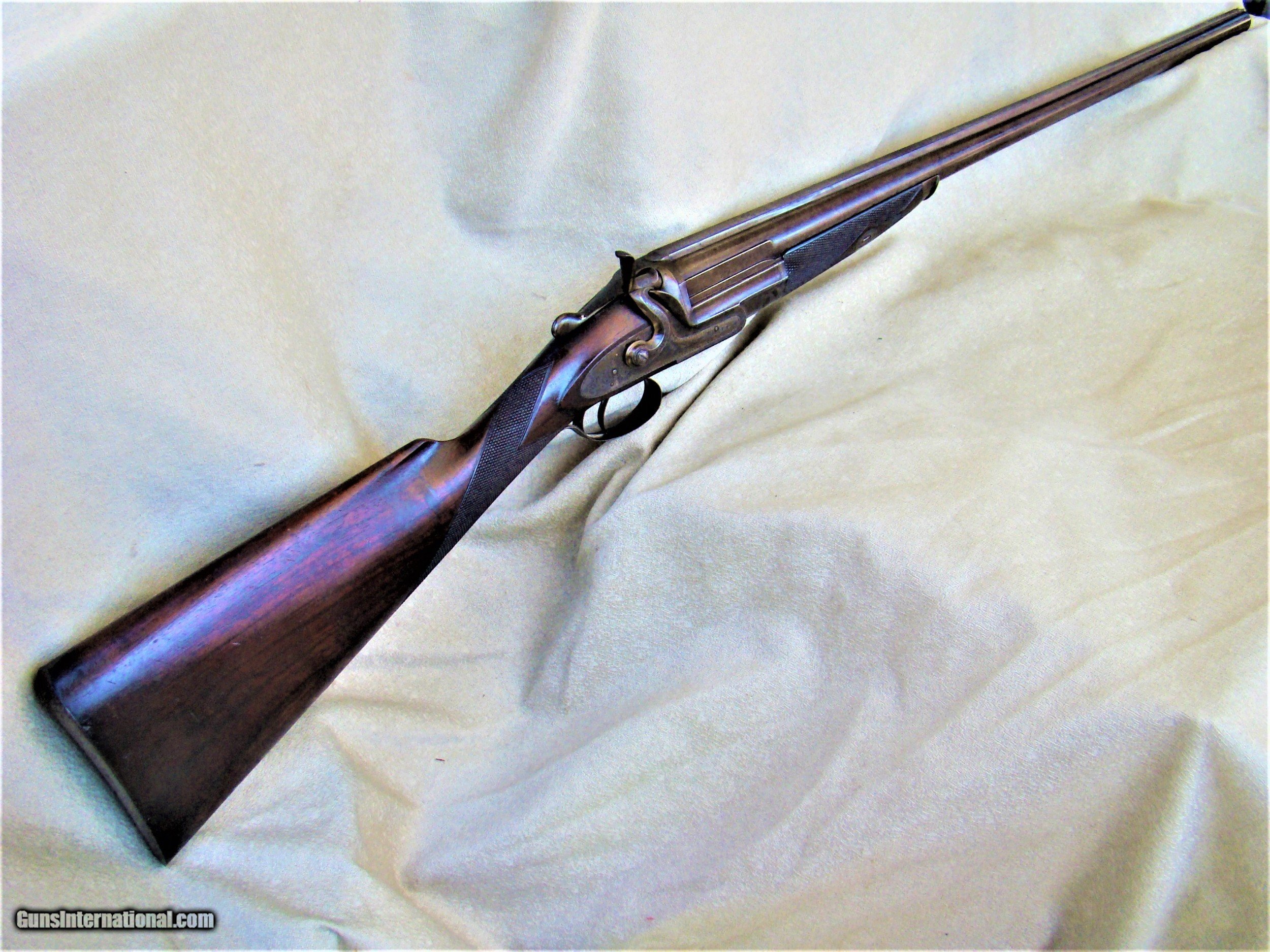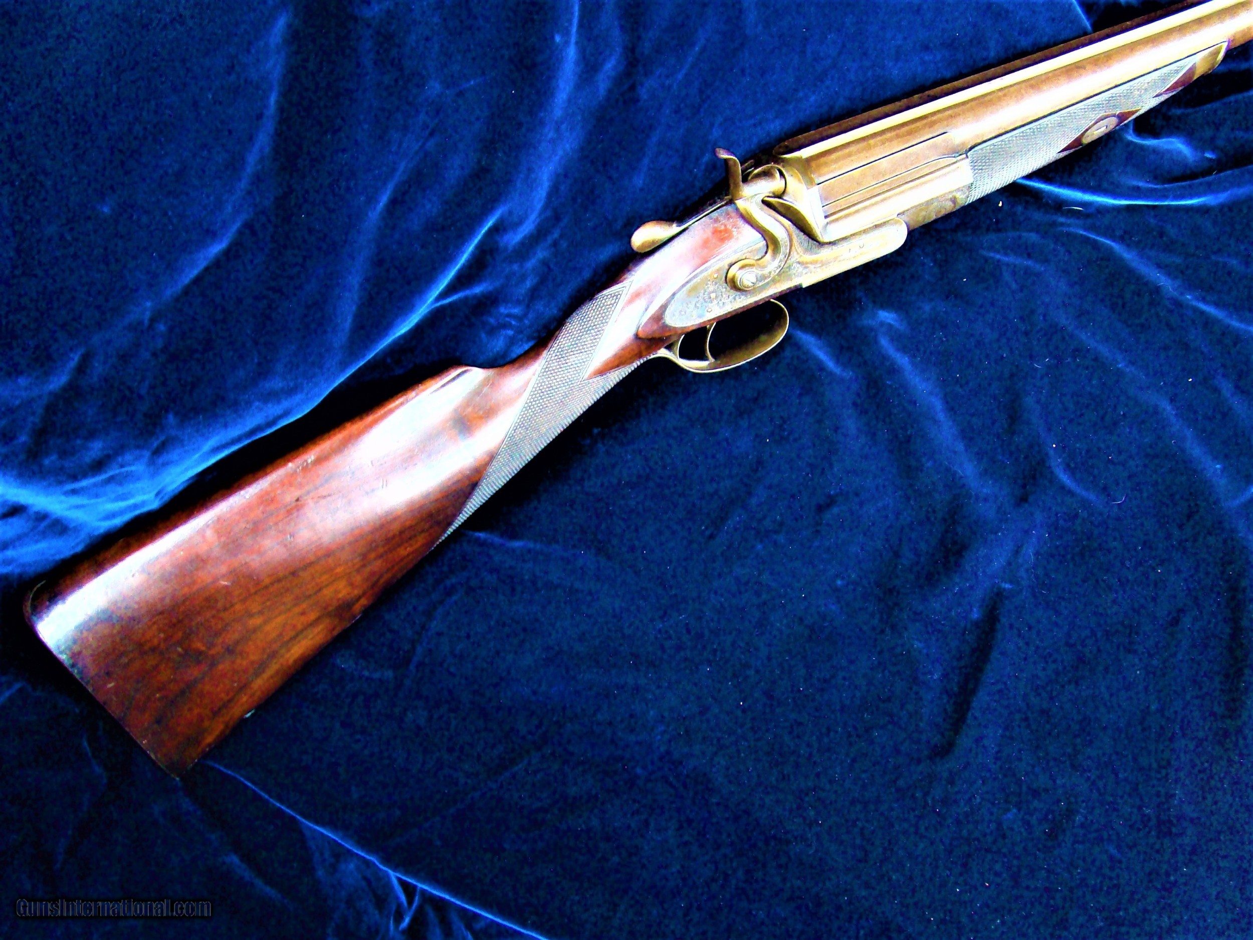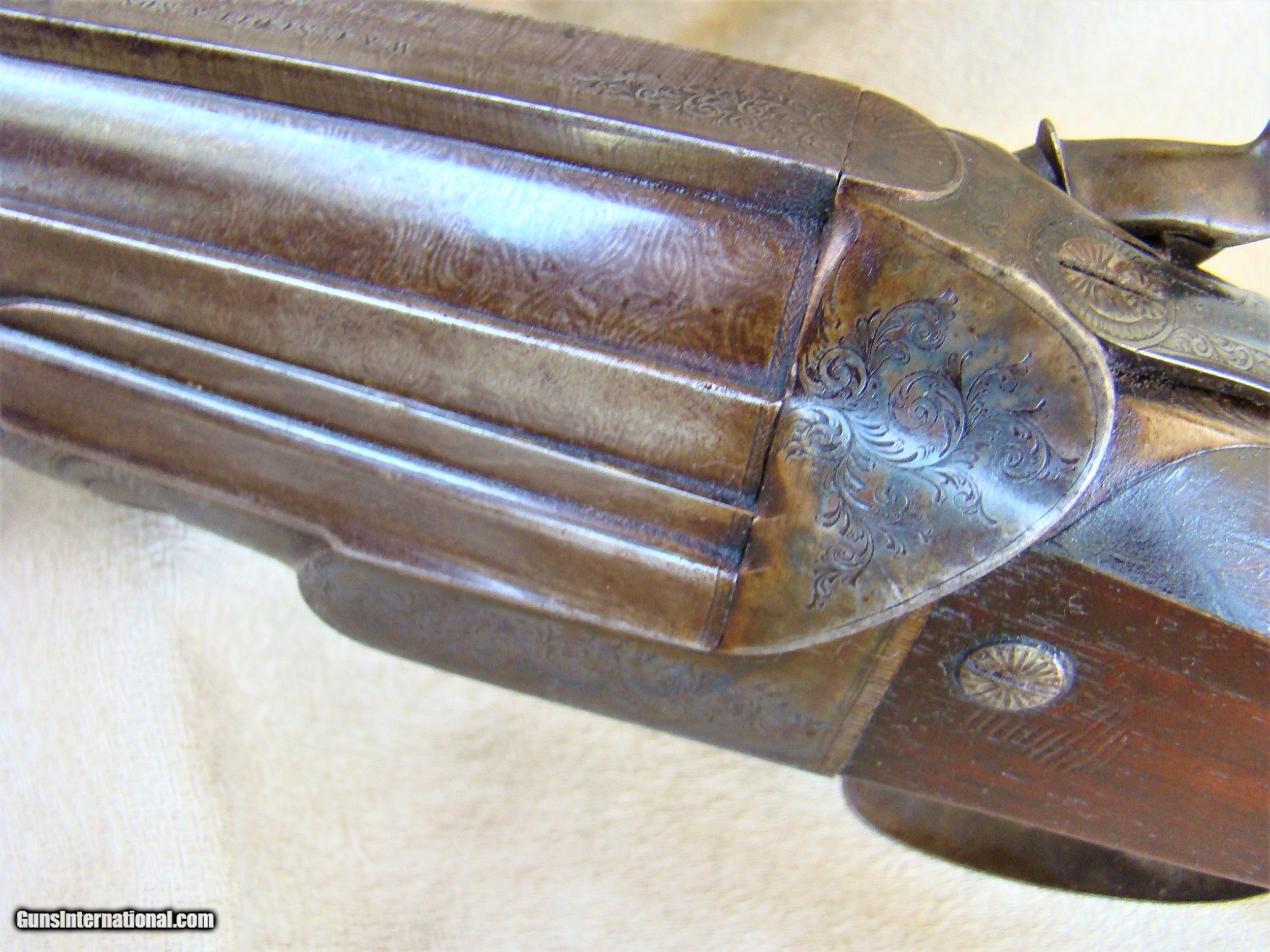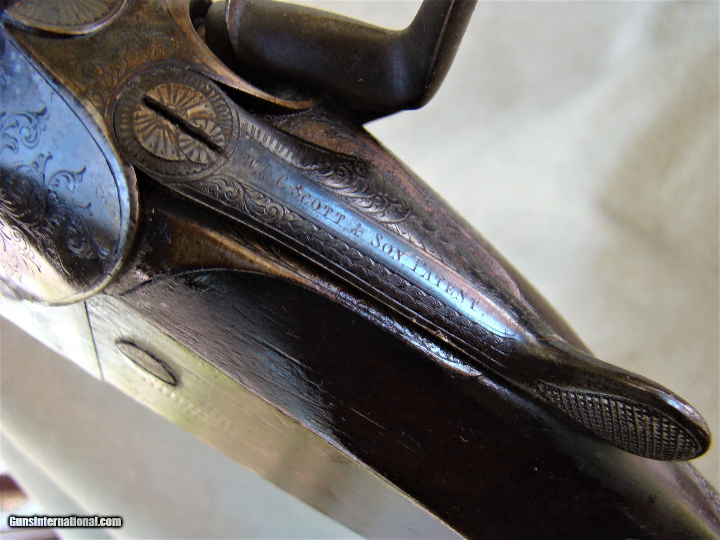 Description: W&C Scott 8 bore sporting gun, 32" Damascus barrel features a wide raised concave rib which bears the London address "W&C Scott & Son Patentees, 10 Gt Castle St Regent Circus London." Early example circa 1872, the water table is stamped " Purdey Patent Bolt" and "Scott Patent Action". This is a high grade waterfowler, fully engraved with English acanthus and vignettes of duck on the trigger guard and a retriever on the lock. The gun is in remarkable condition just out a house in the Boston area, where it has resided for over 100 years. Boston was the location for Wm. Read and Son, the U. S. agents for W&C Scott. Rich case colors compliment the engraving and deep sculpted action. Finely checkered straight hand stock and forend with horn tip. Dimensions 1-3/4" comb, 2-3/4" heel, 14-1/4" LOP to a steel butt plate. Stocked for heads up shooting the gun mounts with surprising ease and the balance at the pin allows for a wonderful feel and swing! Mechanically perfect, bright shiny bore, the gun locks the massive breech like a vault. Only the best Scott guns bear the Gt Castle St address. At 9 lbs, 13 oz, this likely was the extra lightweight model. Just a fabulous gun! SOLD |