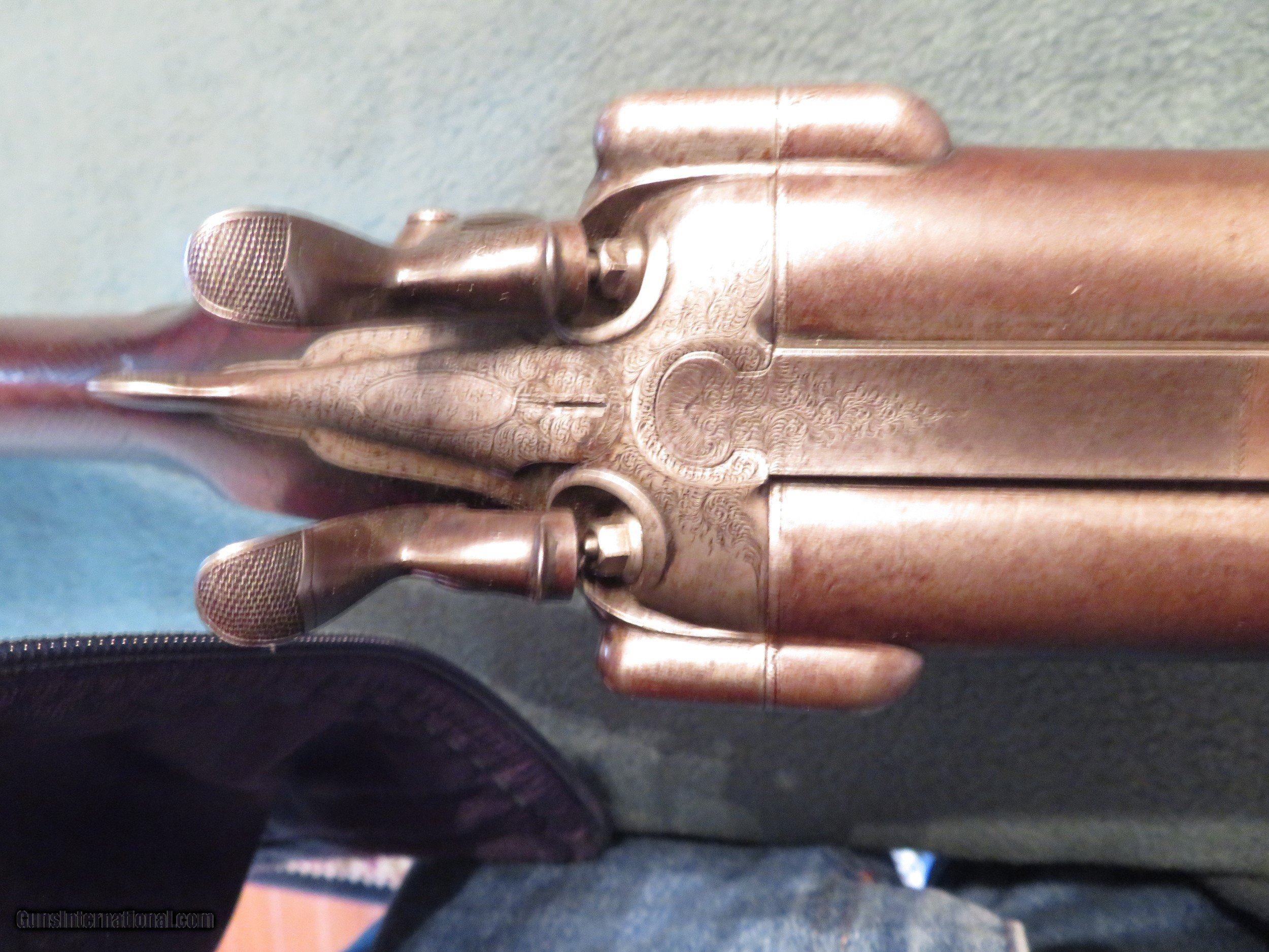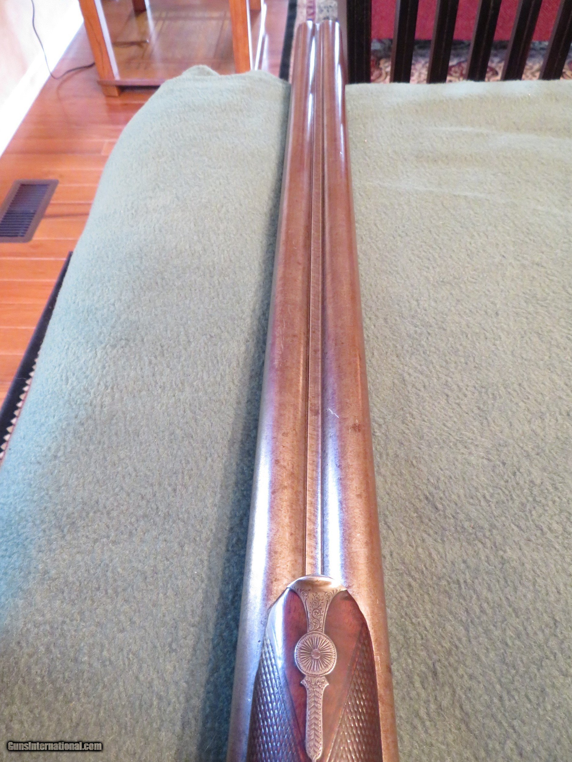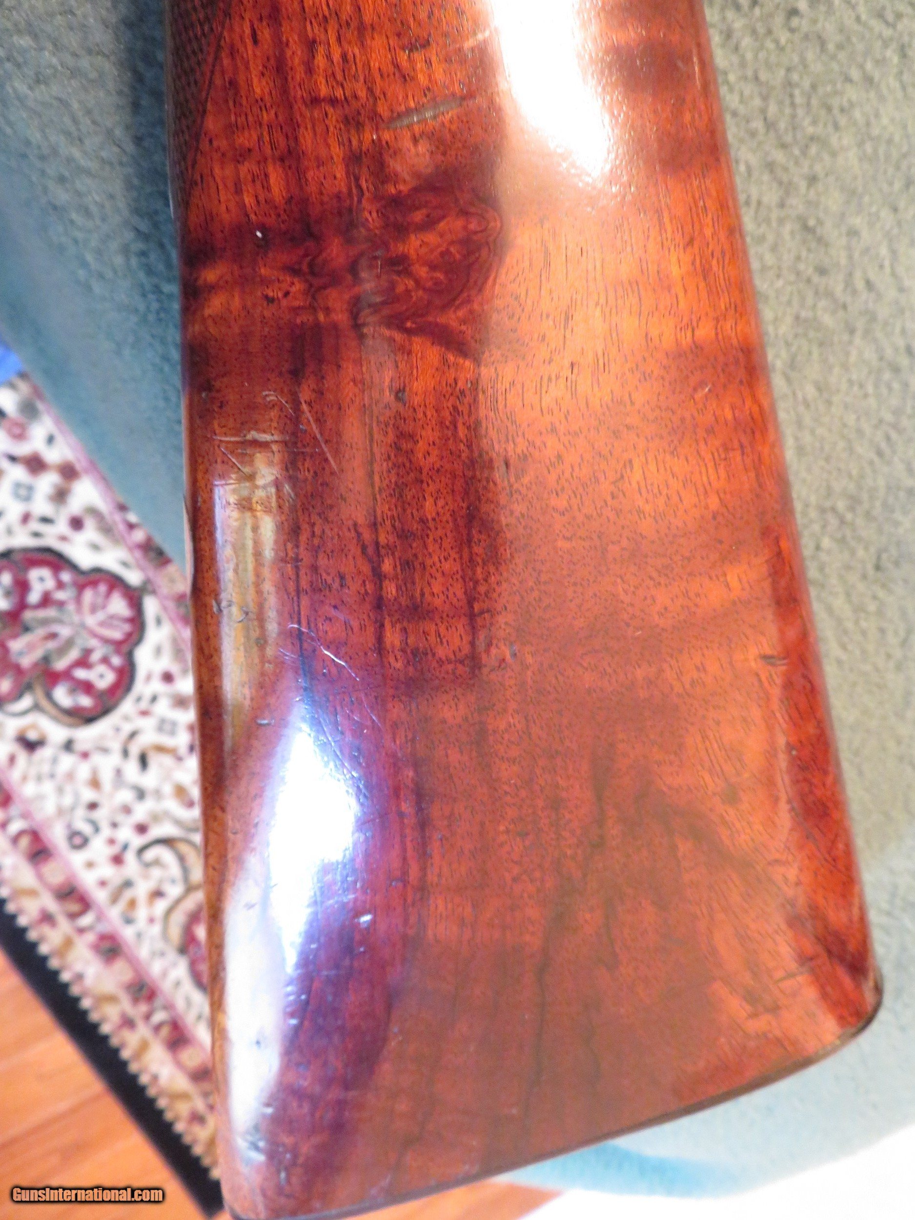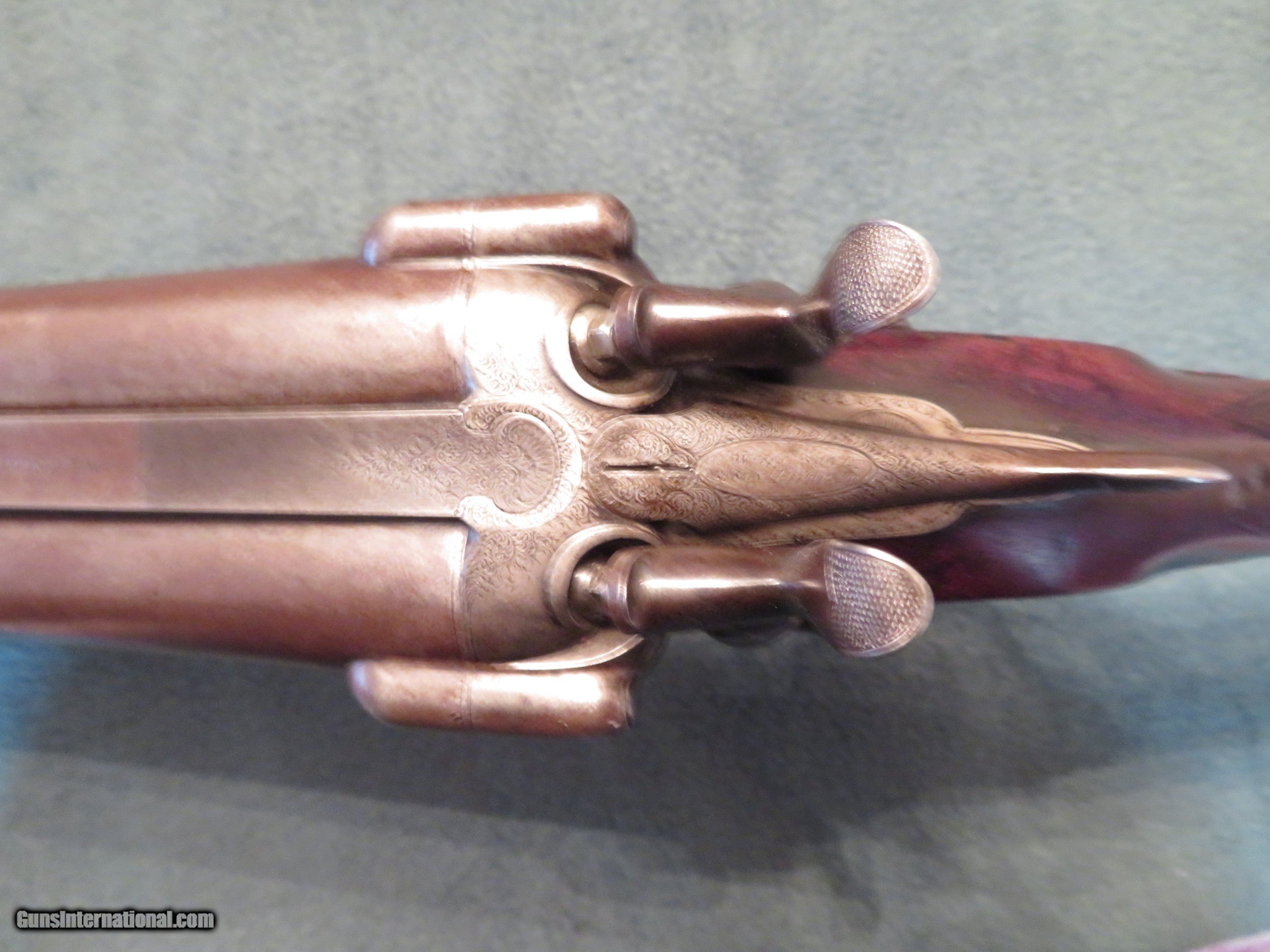 Description: This is one of the rarest guns in my 40 plus years of collecting W&C. Scott Guns. This was an attempt by Scott to produce a gun that would not shoot loose. This ungainly looking gun did not sell well, and very few were made. The price reflects the condition of this rare gun. It has seen a lot of use over the last 146 years. Finishes have faded and checkering shows lots of wear. Bores are somewhat shiny, but have some pitting. This gun would be an excellent restoration candidate, but would be a critical addition to the serious collector of Scott guns. PRICE Slashed TO $500.00 Plus $50. Shipping. (I will only accept USPS Postal Money Orders On This Item! FFL not required on this antique firearm. If you have questions call Jim (248) 266-6494 SOLD Antique: Yes Manufacturer: W&C. Scott Model: Quadruple Bolt Serial Number: 5528 Bore: 12 Chambers: 2&1/2 inch Condition: Good Metal Condition: Good Wood Condition: Good Bore Condition: Fair Barrels: 30 inches Barrel Type: Damascus Action: Sidelock Triggers: 2 Gauge Info: 12 LOP: 14 Weight: 9 pounds Manufacture Date: 1874 Choke Left: Cylinder Choke Right: Open Engraving: Fine Scroll Extras: No Case: No Item Location: MI Proof:Black: Black |