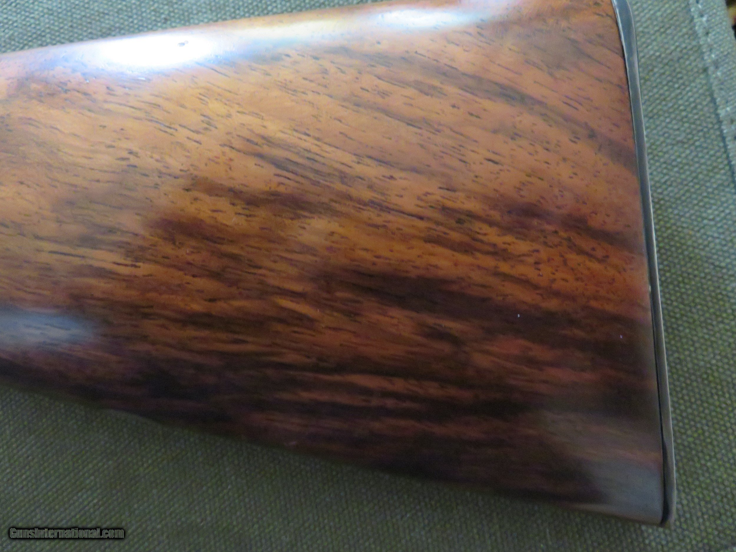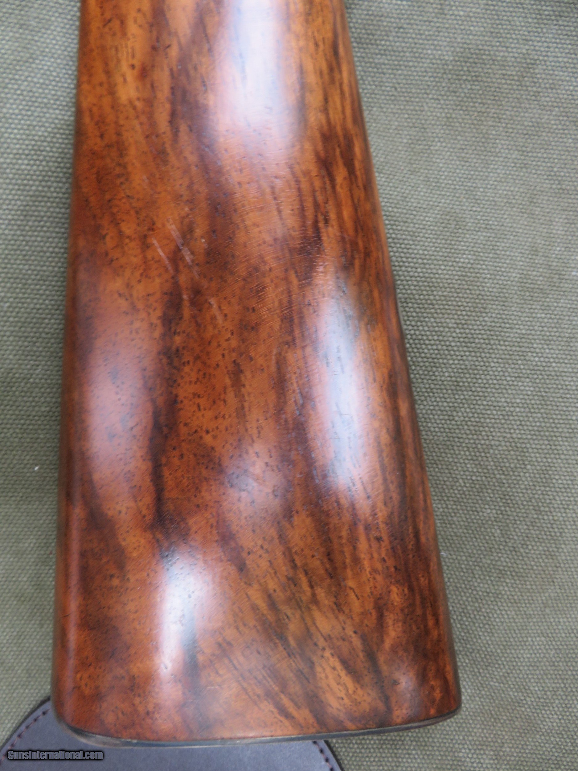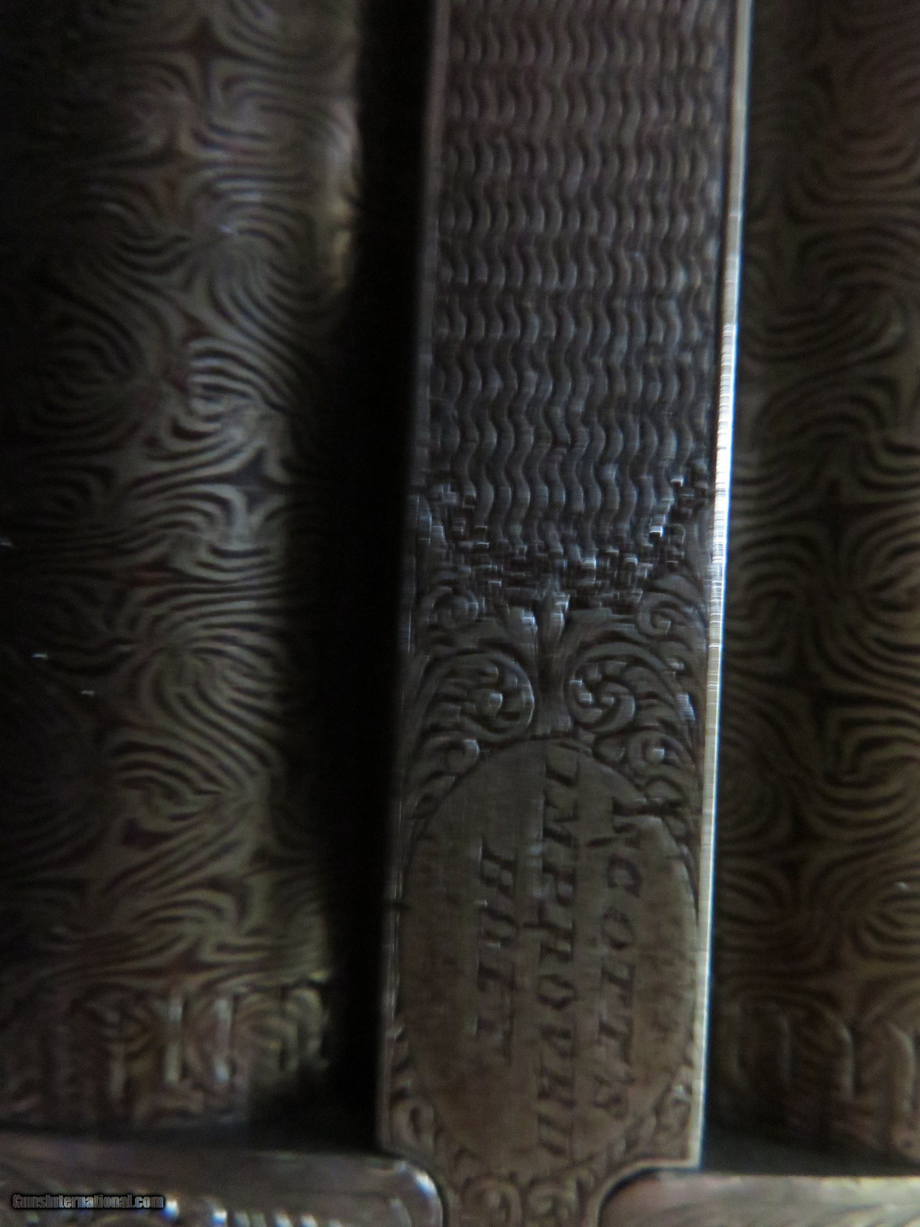 Description: This gun is an example of the English gun makers finest work. Though the gun is not marked with a model name, it has most of the features found on Scotts "A" grade guns. It is similar to a Monte Carlo, but does NOT have the pigeons engraved on the locks. The engraving is over 80% coverage and of the highest quality. The wood is simply spectacular. Turkish walnut with dark contrasting streaks. This is the type of wood typically found on Scotts Premier grade guns. The locks are seven pin. It has the Perkes System which can be identified by the small "Step" at the top back of the lock-plate. This sidelock was replaced with the "Rogers" action soon after this gun was built. This gun features ejectors, which are very rare on early Scott Sidelock guns. Specifications: 95-98% All (ORIGINAL) Finishes and Mechanics. Bright & Shiny Perfect Original Bores. 30 and 1/8th inch barrels. Ejectors are strong and "in-time" Weight 7.2 pounds. Scott's Improved Bolt (Square crossbolt) Rounded semi-pistol grip. Ckoke Right = Modified, Left = Modified Chambers are the original 2 and 1/2 inch. Original stock finish is 98% with only one or two very minor scratches on lower right of buttstock, Decorative metal buttplate with 99% original finishes. Lock-up is tight. No lateral or vertical play even without the forend attached. Checkering is like new. Screws are perfect and untouched, Notice the very thin slot on the hinge-pin screw, When this slot has been widened to about 1/16th inch it usual means someone has tampered with the gun The damascus bbls are the finest Scott made. They were more expensive than fluid steel barrels. Although I have not fired this gun I feel certain it would easily handle RST "Light Loads". I use those loads in my Scott Damascus Barreled guns and they pattern better than hi-power loads. In summary: This gun is in superb "original" condition. You will not find a better London "Best" gun at this price. PRICE REDUCED TO $2650. plus 75. shipping, if buyer wants insurance you must ad the amount for inurance. (Please note, due to problems with-in the USPS (United States Postal Services) I will no longer accept any payment from or through the USPS. If you are serious and need more info Please Call Me, rather than email. Jim (248) 266-6494 (Michigan) . SOLD Antique: Yes Manufacturer: W&C. Scott & Sons. Model: A grade Sidelock Serial Number: 58932 Barrel Length: 30& 1/8th Bore: 12 Chambers: 2&1/2 inch Ejectors: Yes Condition: Excellent Metal Condition: Excellent Wood Condition: Excellent Bore Condition: Excellent Barrels: Damascus Barrel Type: side by Side Action: Sidelock Triggers: 2 Gauge Info: 12 Stock: Russian Walnut Stock Comb: 1&7/8 in. Stock Heel: 3 Stock Cast: Neutral Butt Pad: Metal-Checkered LOP: 14& 1/8 Rib: Raised-Matted Weight: 7.2 pounds Sights: Front Bead Manufacture Date: 1897 Chokes: mod & mod Engraving: 85% Fine Scroll Extras: No Case: No Item Location: MI Proof:Black: Black |