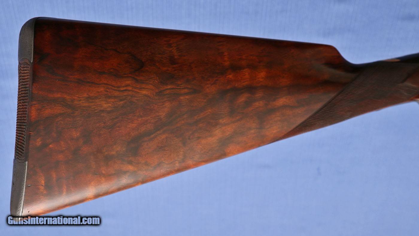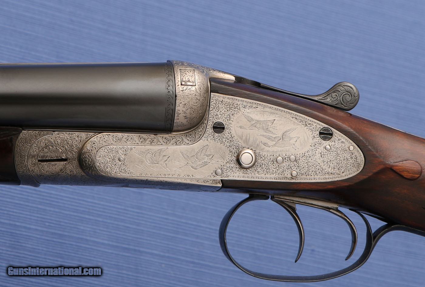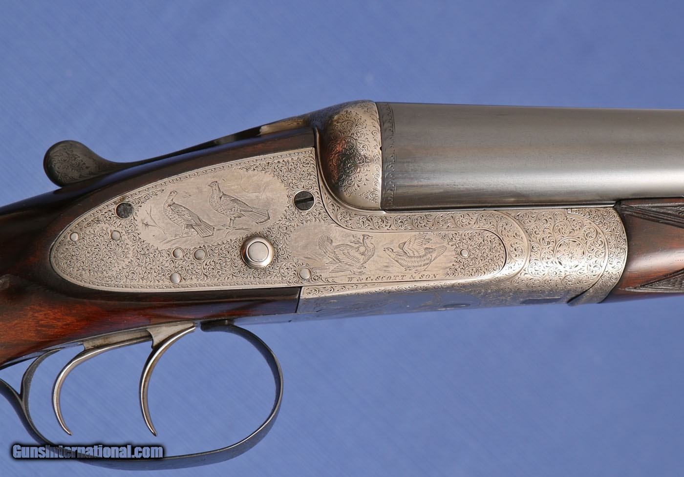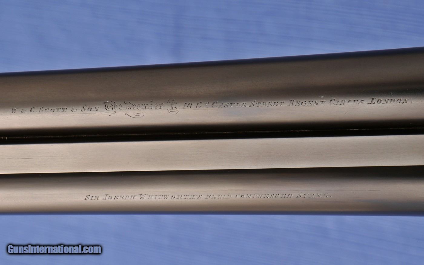 Description: W & C Scott & Son - The Premier Gun - Side Lock Ejector - 12ga, 2-1/2", IC / IM (.739 - .012 / .030) Wall Thickness .023, LOP 14-5/8", Drop 1-1/2" to 2-1/4", Neutral Cast, Weight 7 lbs. 2 oz. The Whitworth fluid steel barrels have excellent bores, good wall thickness, properly timed ejectors, and ring very nicely. The barrels are sligtly loose in the action. I believe the gun was built in the early 1890s for the U.S. Market. Seems to be an original configuration gun that has been restored.