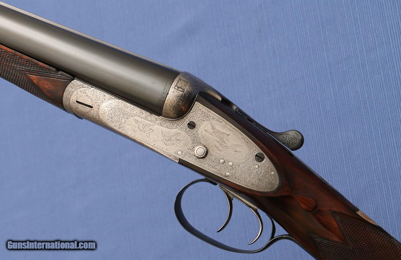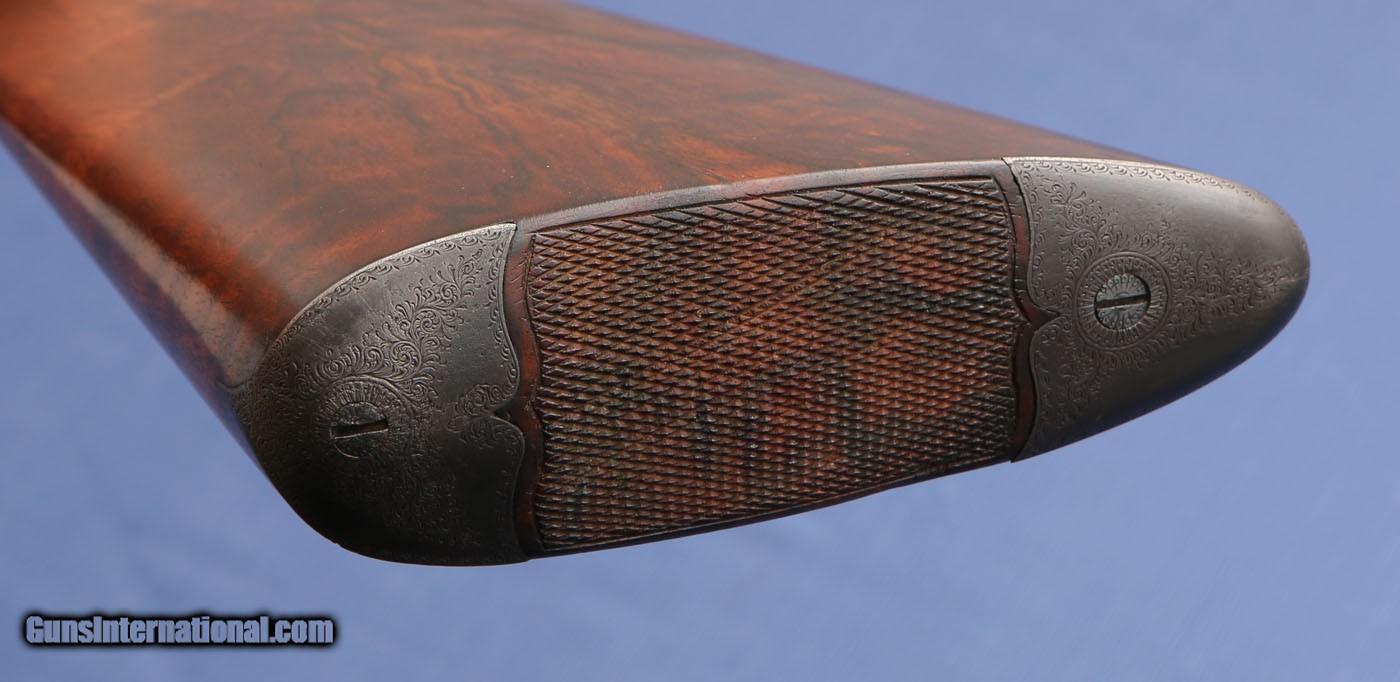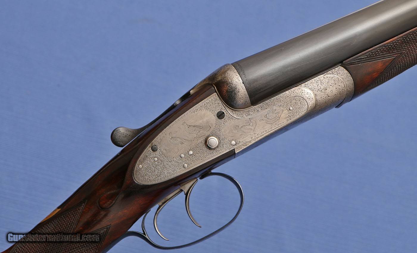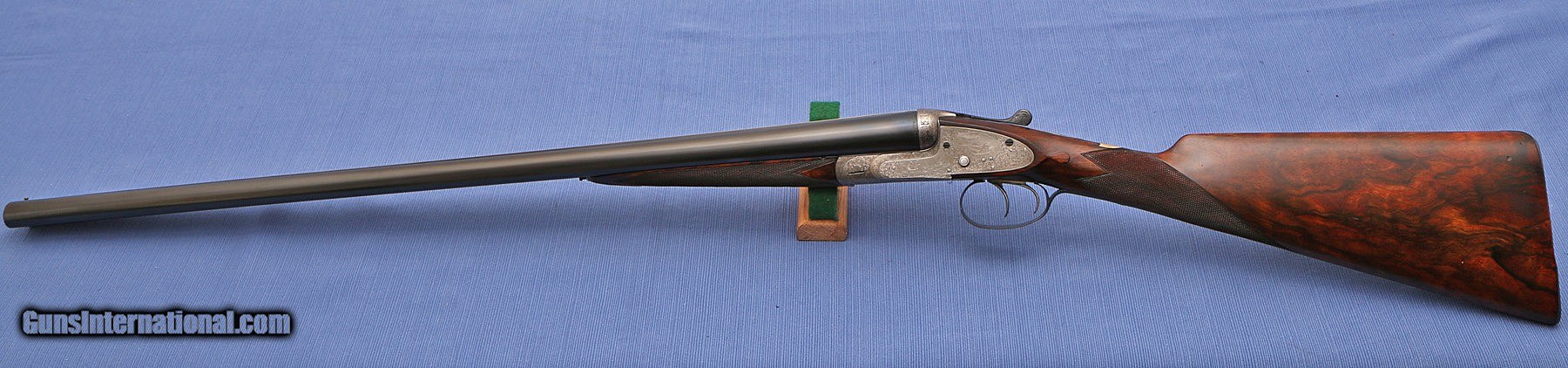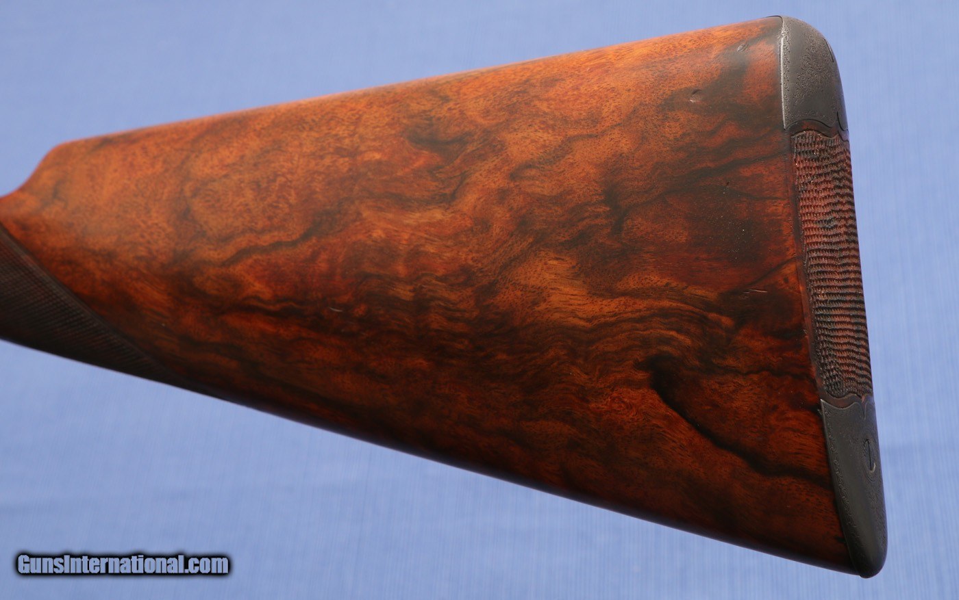 Description: W & C Scott & Son - The Premier Gun - Side Lock Ejector - 12ga, 2-1/2", IC / IM (.739 - .012 / .030) Wall Thickness .023, LOP 14-5/8", Drop 1-1/2" to 2-1/4", Neutral Cast, Weight 7 lbs. 2 oz. The Whitworth fluid steel barrels have excellent bores, good wall thickness, properly timed ejectors, and ring very nicely. The barrels are sligtly loose in the action. I believe the gun was built in the early 1890s for the U.S. Market. Seems to be an original configuration gun that has been restored.