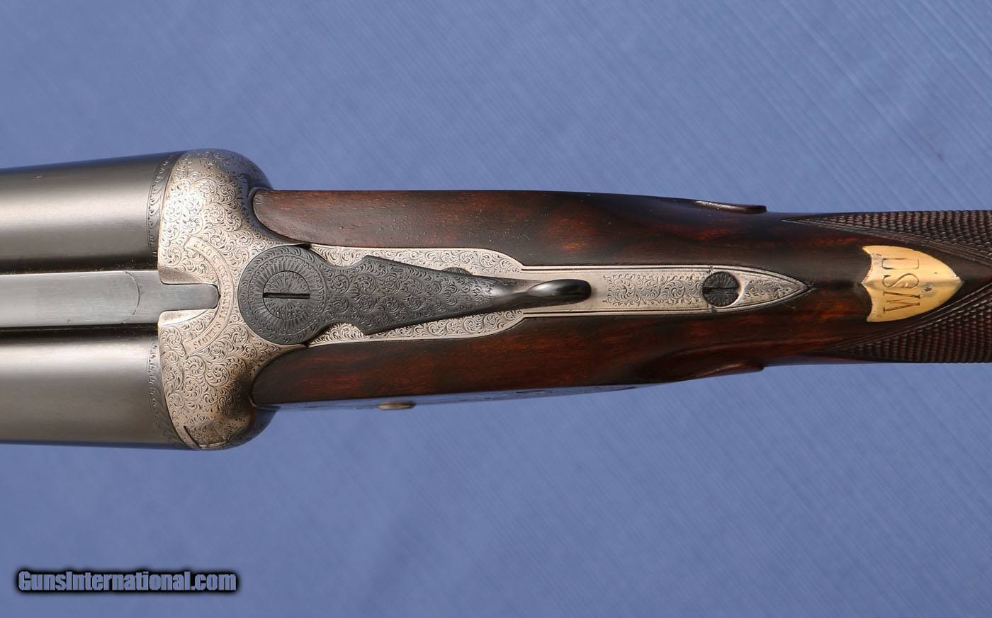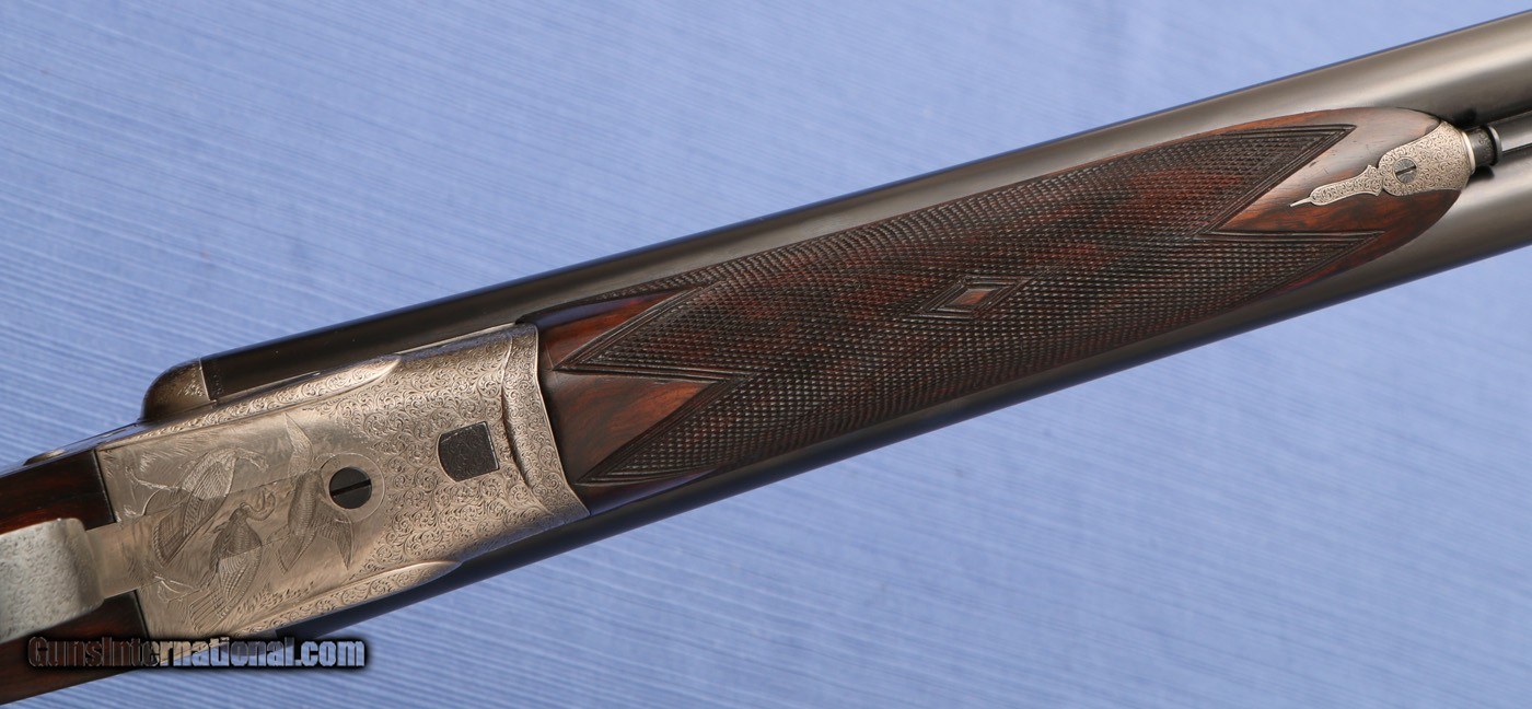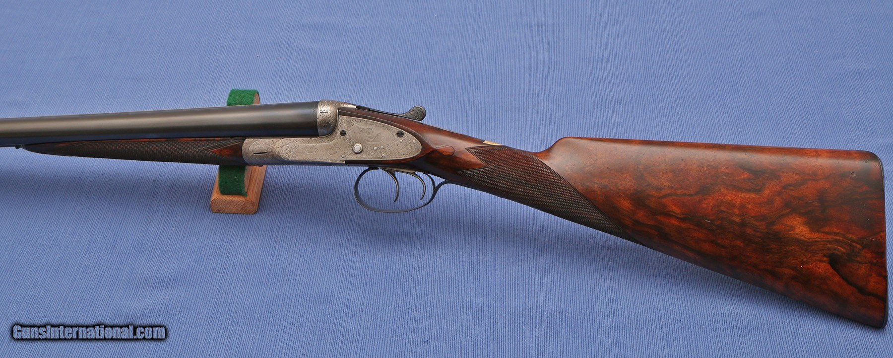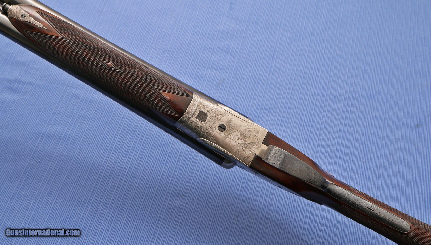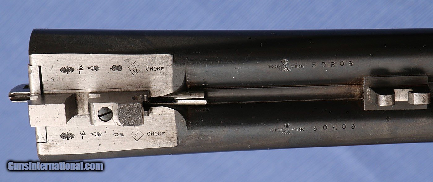 Description: W & C Scott & Son - The Premier Gun - Side Lock Ejector - 12ga, 2-1/2", IC / IM (.739 - .012 / .030) Wall Thickness .023, LOP 14-5/8", Drop 1-1/2" to 2-1/4", Neutral Cast, Weight 7 lbs. 2 oz. The Whitworth fluid steel barrels have excellent bores, good wall thickness, properly timed ejectors, and ring very nicely. The barrels are sligtly loose in the action. I believe the gun was built in the early 1890s for the U.S. Market. Seems to be an original configuration gun that has been restored.