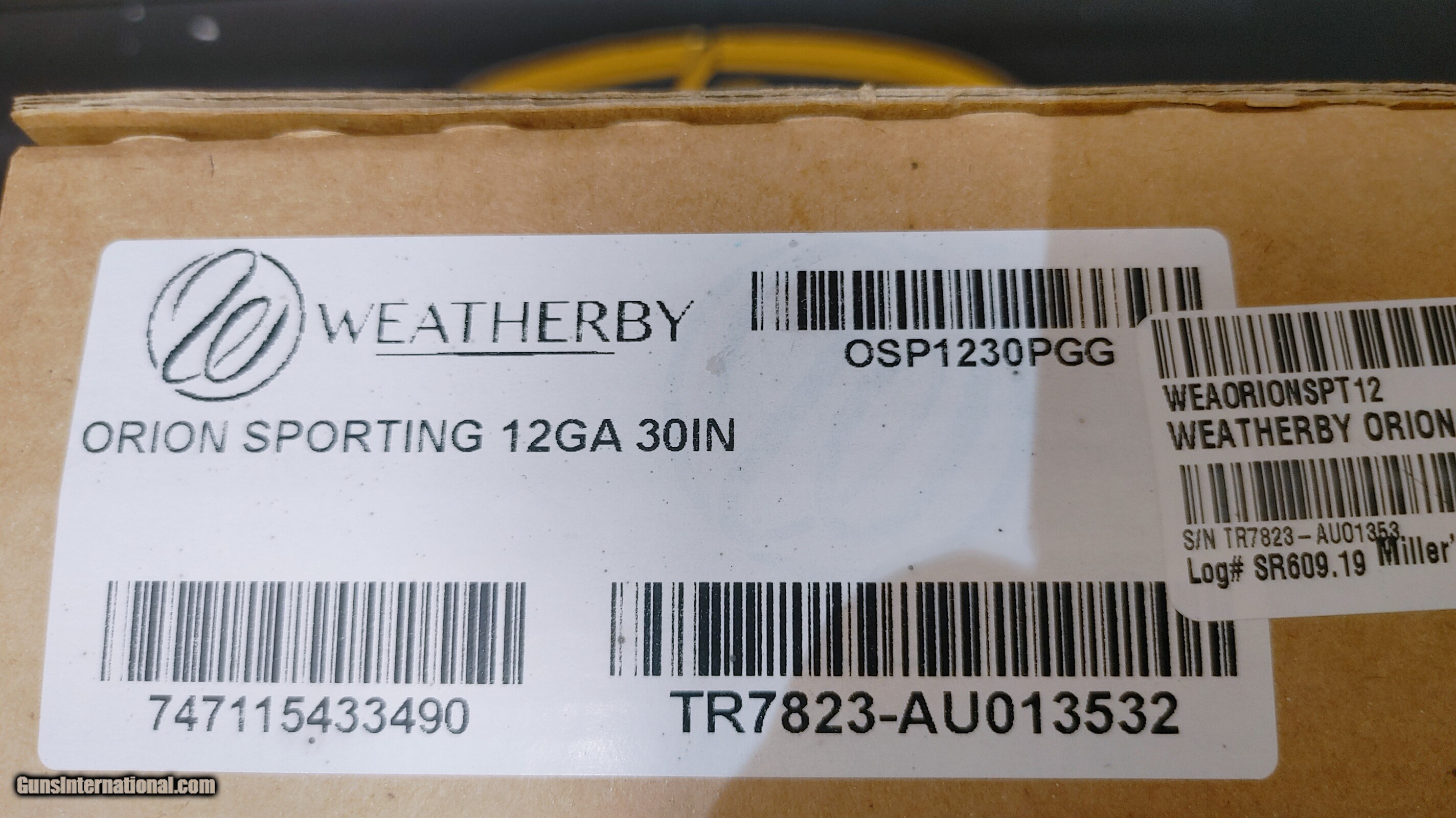 Description: new WBY ORION SPORTING 12M/30MC new in box (CALIBER:12 GAUGE); (MAG CAPACITY:2); (MODEL SERIES:ORION SPORTING); (CAPACITY:2); (FINISH:BLUE WITH HIGH LUSTRE FINISH); (STOCK:GRADE A WALNUT STOCK HIGH GLOSS FINISH); (SIGHTS:FIBER OPTIC FRONT); (OVERALL LENGTH:47.75); (FEATURES:DIAMOND POINT CHECKERING/ AUTO EJECTORS/ADJ COMB); (GUN TYPE:SHOTGUN: OVER AND UNDER); (ACTION:OVER + UNDER); (BARREL LENGTH:30 PORTED BARRELS); (DEPT:LONG) Millers Gun Center Located in New Castle, Delaware "Home of TAX-Free shopping" No Credit Card Fees Send Gun international inquiry and then call 302-328-9747 to complete your purchase SOLD Serial Number: TR7823-AUO1353 |