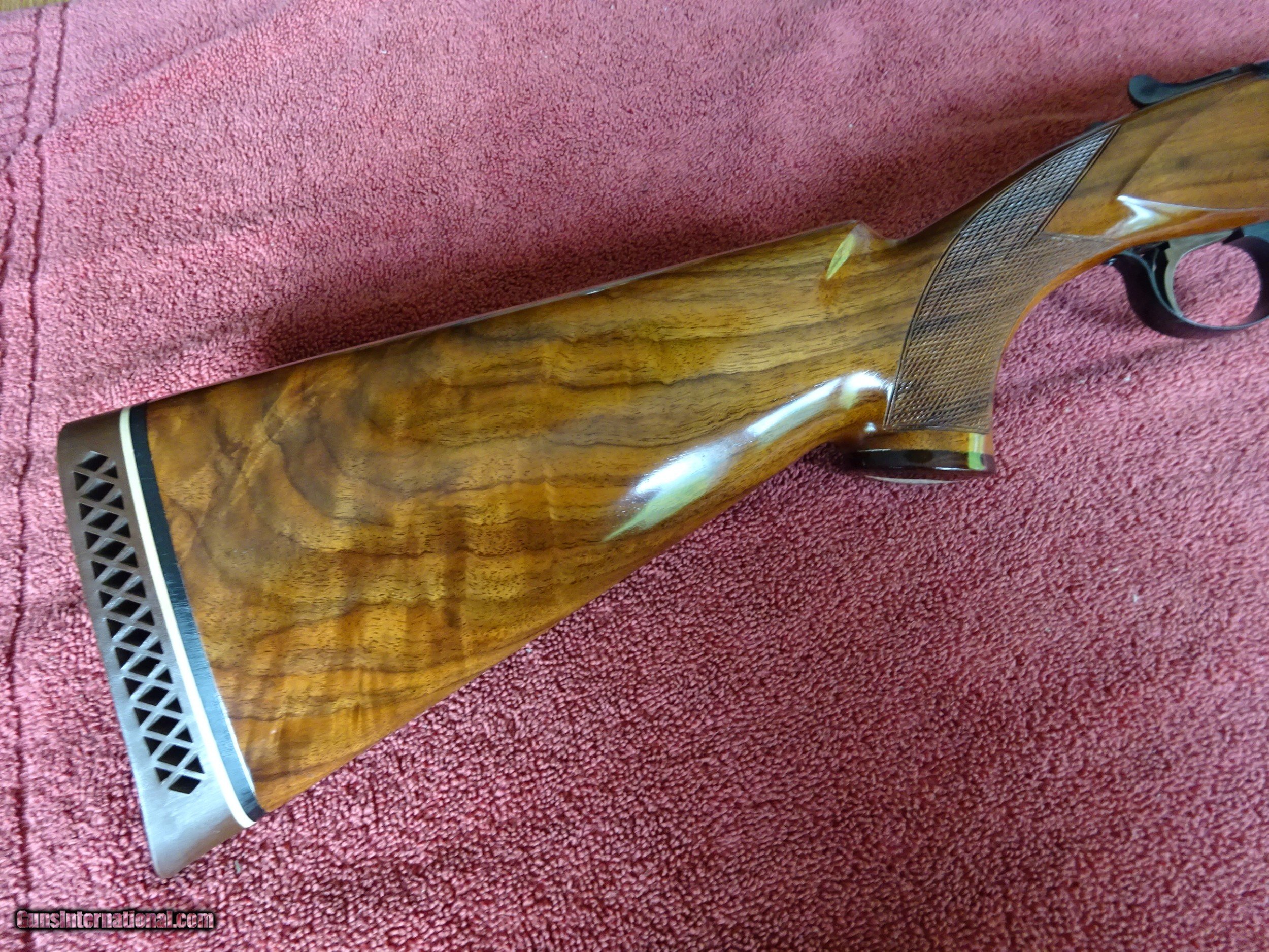 Description: WEATHERBY OLYMPIAN GRADE 20 GAUGE OVER/UNDER. 28" VENT RIB BARRELS, MODIFIED AND FULL, 3" CHAMBERS, MIRROR PERFECT BORES, 99% BRIGHT BLUE. ACANTHUS SCROLL AND BORDER ENGRAVING ON THE FRAME, TOP LEVER, FOREARM IRON AND TRIGGERGUARD. PISTOL GRIP STOCK, BEAVERTAIL FOREARM. GORGEOUS HIGHLY FIGURED WOOD, ROSEWOOD GRIP CAP. ORIGINAL WEATHERBY PAD, 1 3/8" X 2 3/8" X 14 1/8", 7 POUNDS 2 OUNCES. SINGLE TRIGGER, AUTOMATIC EJECTORS. ATTRACTIVE GUN MADE 1972-1981 BY SKB OF JAPAN. $1375.00 + $50.00 Insured shipping to an FFL address. See all Pats gun listings on this site! We also have hundreds of pieces of ORIGINAL gun company advertising & memorabilia available for sale on our site SPORTINGCOLLECTIBLES. We have no reprints or reproductions. Email for more information. SOLD |