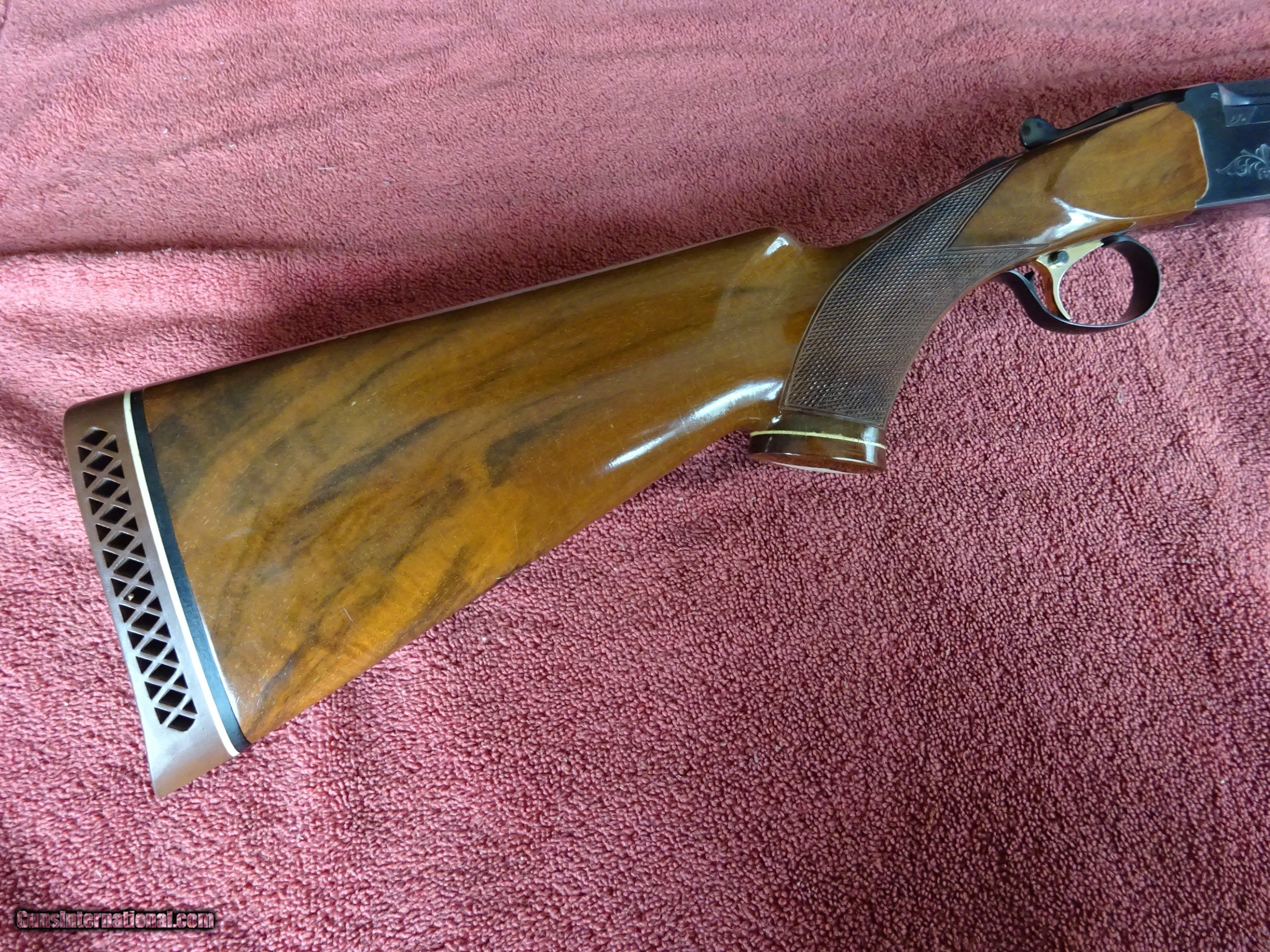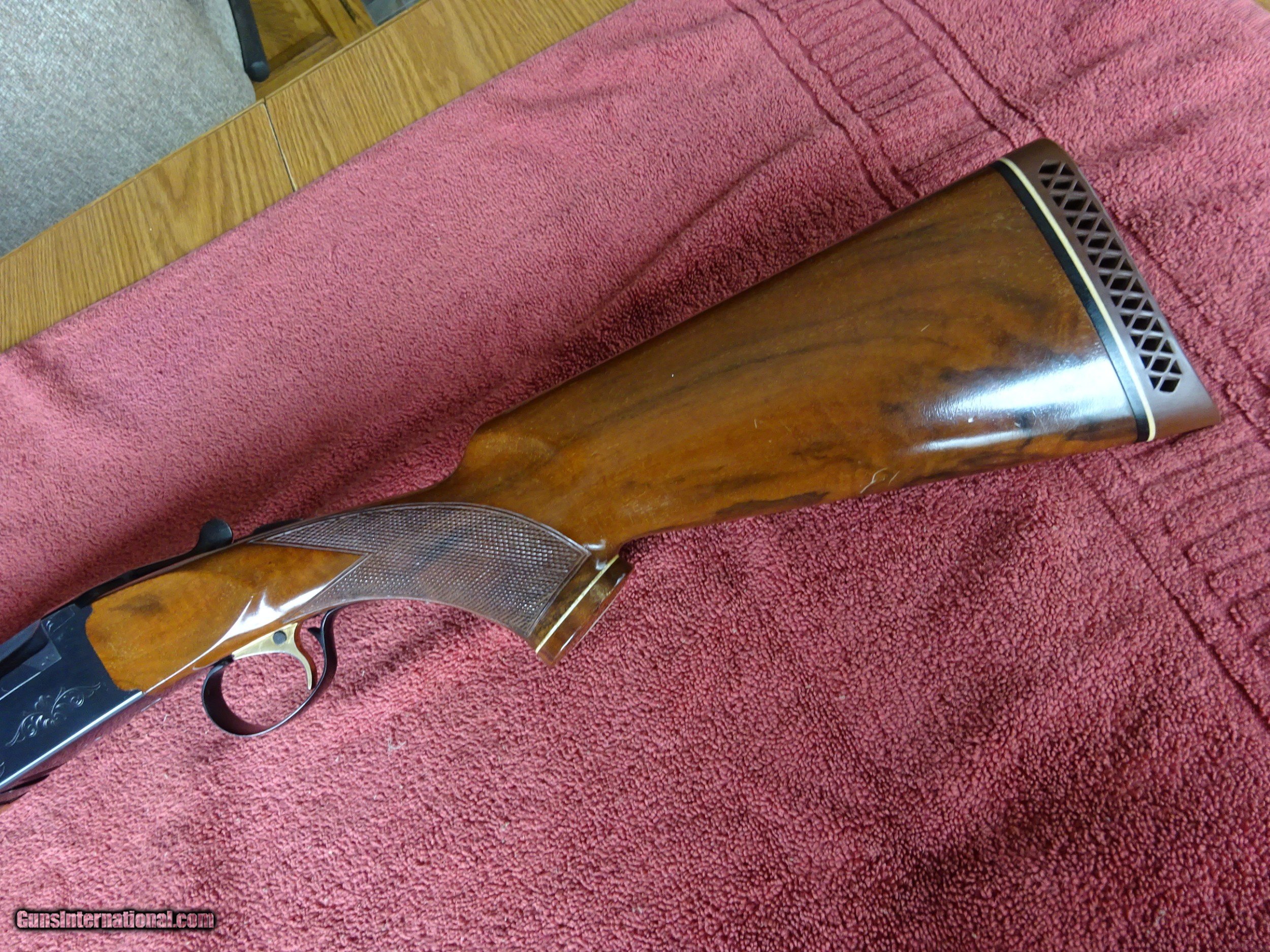 Description: SALE PENDING - WEATHERBY ORION 410 GAUGE. OVER/UNDER 26" BARRELS, IMCYL. AND MODIFIED, VENT RIB, SINGLE SIGHT, 2 3/4" CHAMBERS, AUTO EJECTORS. SINGLE SELECTIVE TRIGGER, SIMPLE SCROLL ENGRAVING. PISTOL GRIP STOCK, BEAVERTAIL FOREARM, WOOD GRIP CAP, WEATHERBY MARKED RECOIL PAD. LIKE NEW OVERALL CONDITION, STILL STIFF TO OPEN AND CLOSE. NO WEAR ON ANY OF THE METAL SURFACES. NICELY FIGURED WALNUT, FINE CUT CHECKERING. VERY MINOR HANDLING MARKS IN THE VARNISH, 1 1/4" X 2 1/2" X 14 1/8", 7 POUNDS EVEN. MADE IN JAPAN PRIOR TO 1986. SCARCE GUN. $1875.00 + $60.00 Insured shipping to an FFL address. Layaway is available. See all Pats gun listings on this site! We also have hundreds of pieces of ORIGINAL gun company advertising & memorabilia available for sale on our site SPORTINGCOLLECTIBLES. We have no reprints or reproductions. Email for more information. SOLD |