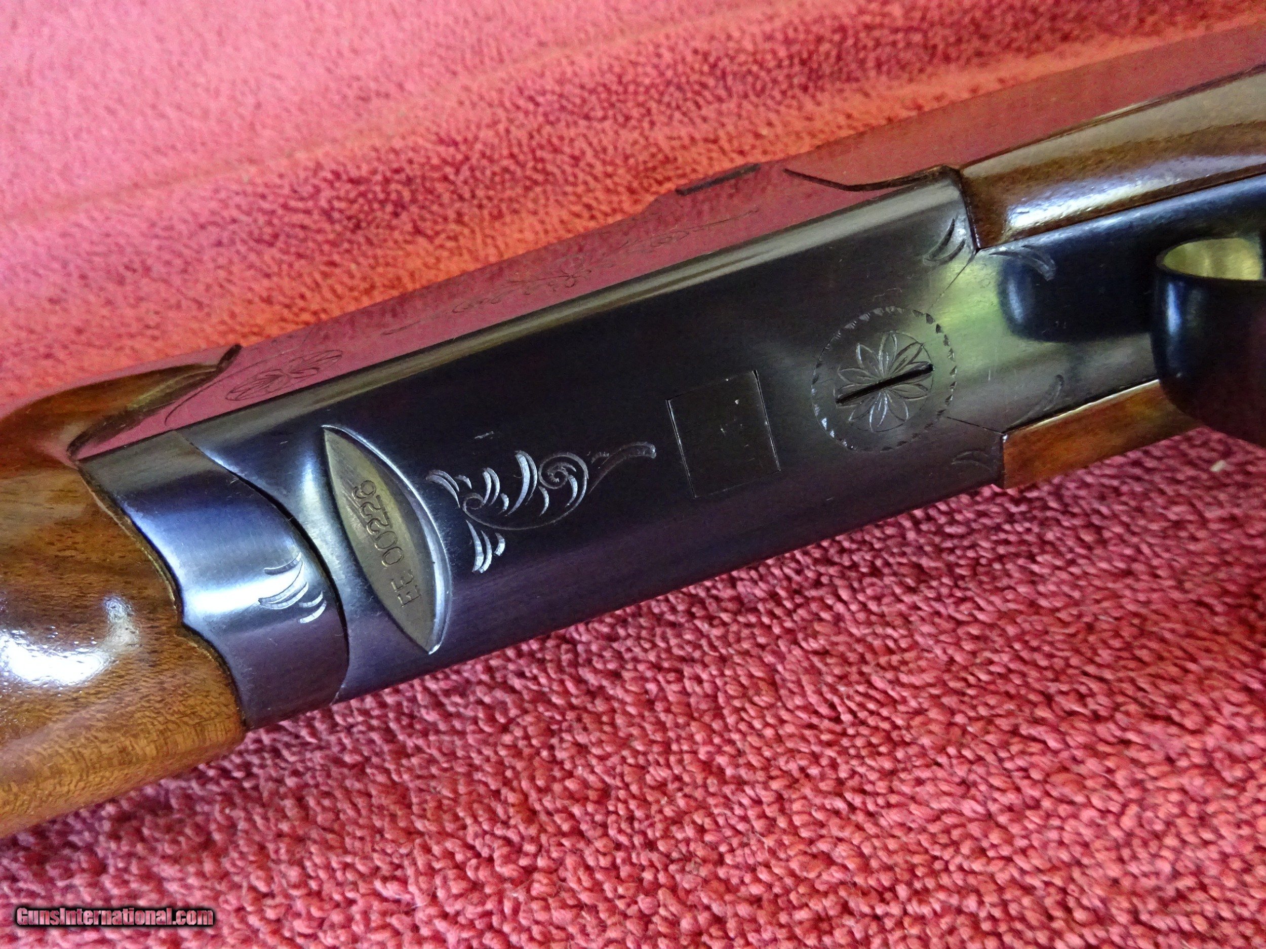 Description: WEATHERBY ORION O/U FIELD GRADE 28 GAUGE, MARKED SOUTHGATE, CALIF. MADE IN JAPAN". 26" VENT RIB BARRELS, SINGLE SIGHT, IMCYL. AND MODIFIED, 2 3/4" CHAMBER. SIMPLE SCROLL ENGRAVING ON ALL SIDES AND SCREWS, AUTOMATIC EJECTORS. SINGLE SELECTIVE TRIGGER, NON-AUTOMATIC SAFETY. PISTOL GRIP STOCK, BEAVERTAIL FOREARM, FINE HAND-CUT CHECKERING, ROSEWOOD GRIP CAP WITH INLAY, GORGEOUS HIGHLY FIGURED CALIFORNIA CLARO WALNUT. WEATHERBY MARKED PAD, 1 1/4" X 2 1/4" X 14 1/8", 6 POUNDS 14 OUNCES. 100% NEW UNFIRED CONDITION, STILL STIFF TO OPEN. ORIGINAL SERIAL NUMBERED BOX WITH HANG TAGS, INSTRUCTION BOOKLET AND WARRANTY CARD. 3 DIGIT SERIAL NUMBER, POSSIBLY FIRST MONTH OF PRODUCTION - CIRCA EARLY 1980'S. $2250.00 + $50.00 Insured shipping to an FFL address. See all Pats gun listings on this site! We also have hundreds of pieces of ORIGINAL gun company advertising & memorabilia available for sale on our site SPORTINGCOLLECTIBLES. We have no reprints or reproductions. Email for more information. SOLD |