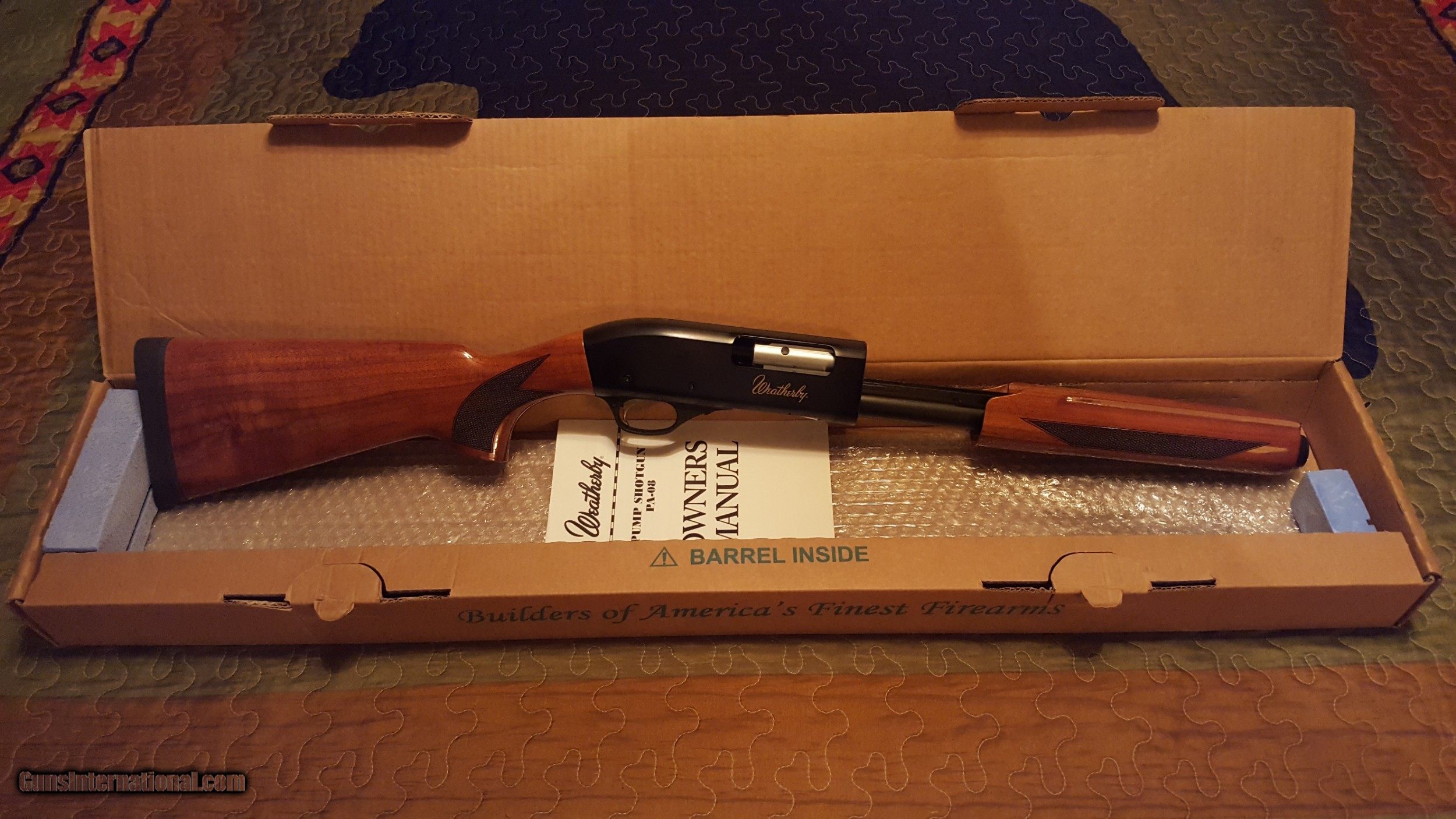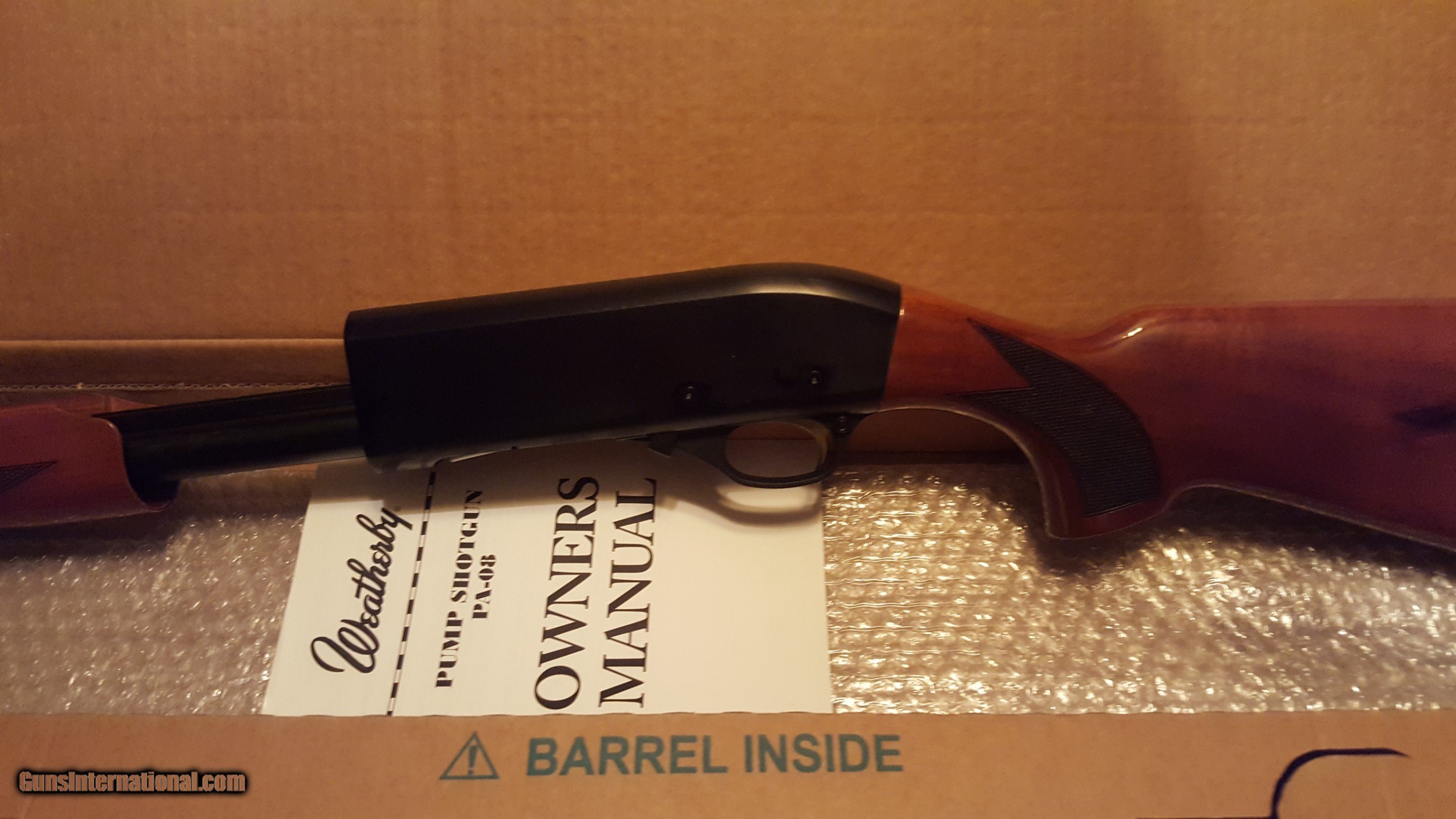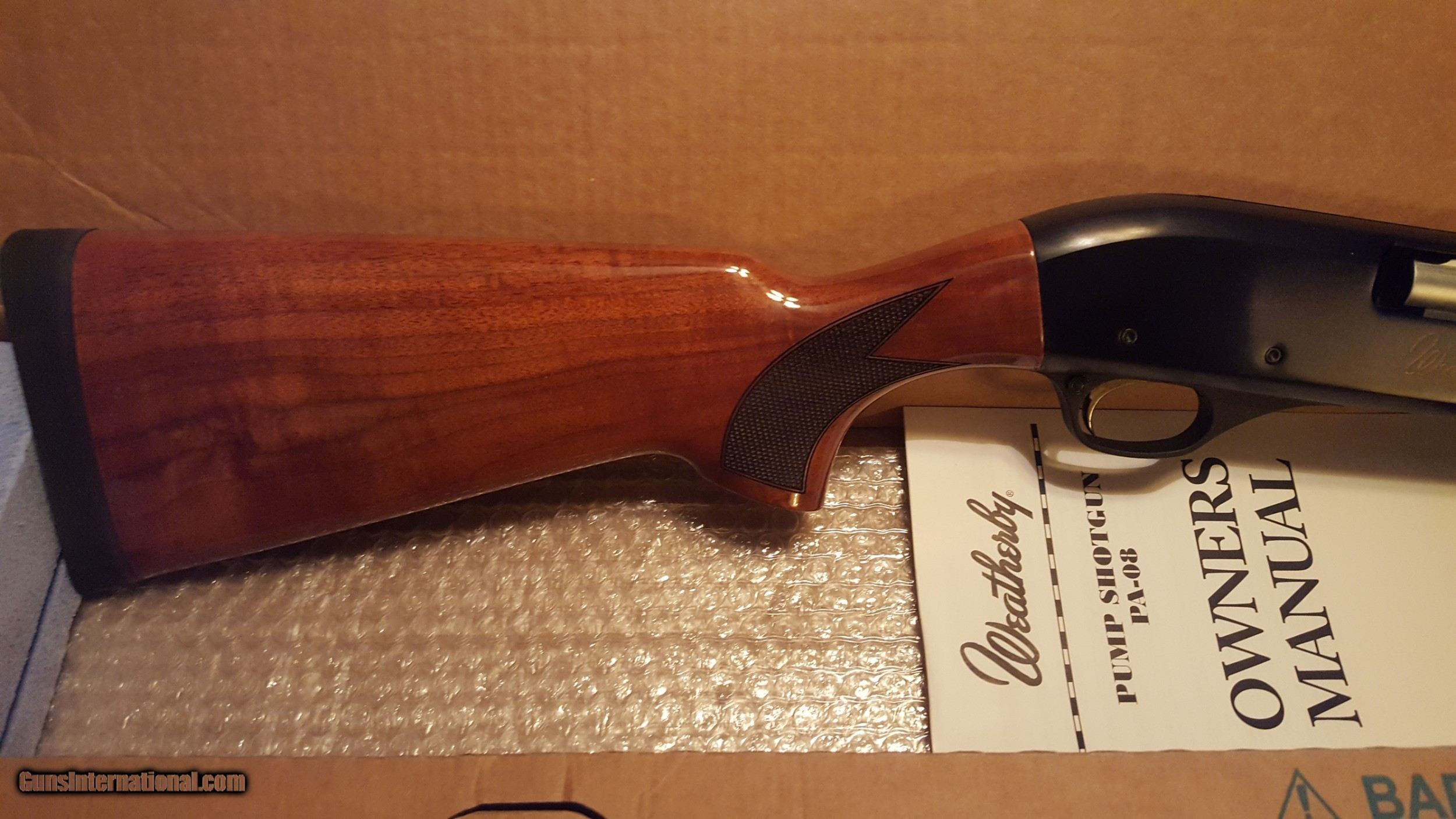 Description: Weatherby PA-08 Upland pump 20ga 28" Chrome - Lined barrel with vent rib. Chambered for both 2 3/4" and 3" shells. Beautiful High Gloss Walnut wood. Brand new in the box. SOLD |