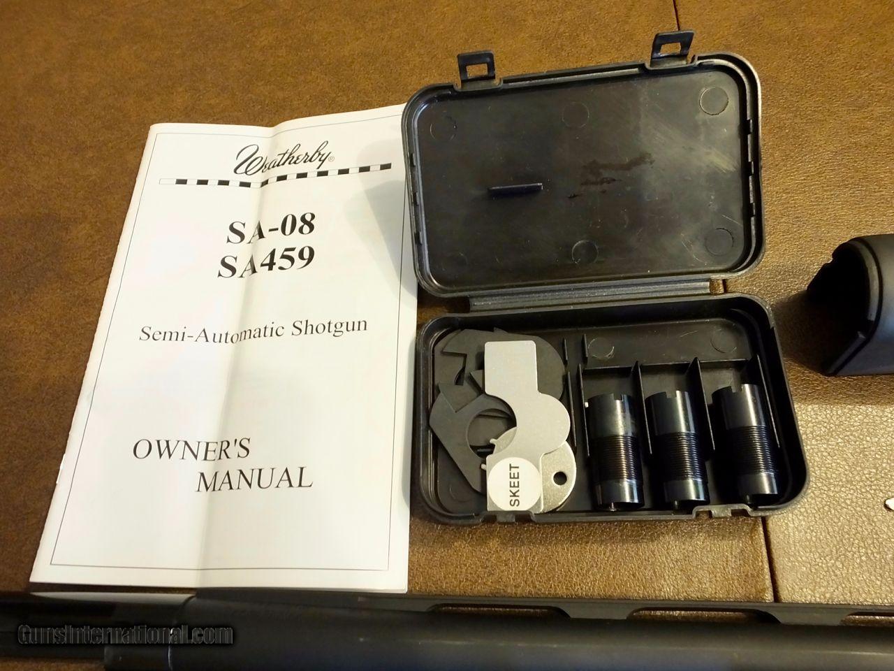 Description: Like new 20 GA Weatherby SA-08 semi auto. Perfect for teens or shorter adults, or ladies, or anyone looking for a COMPACT semi-auto shotgun. Includes a 3rd party skeet choke. Only 200 rounds. 20 GA 24" barrel 3" chamber 5+1 capacity INCLUDES HARD CASE FEATURES INCLUDE: