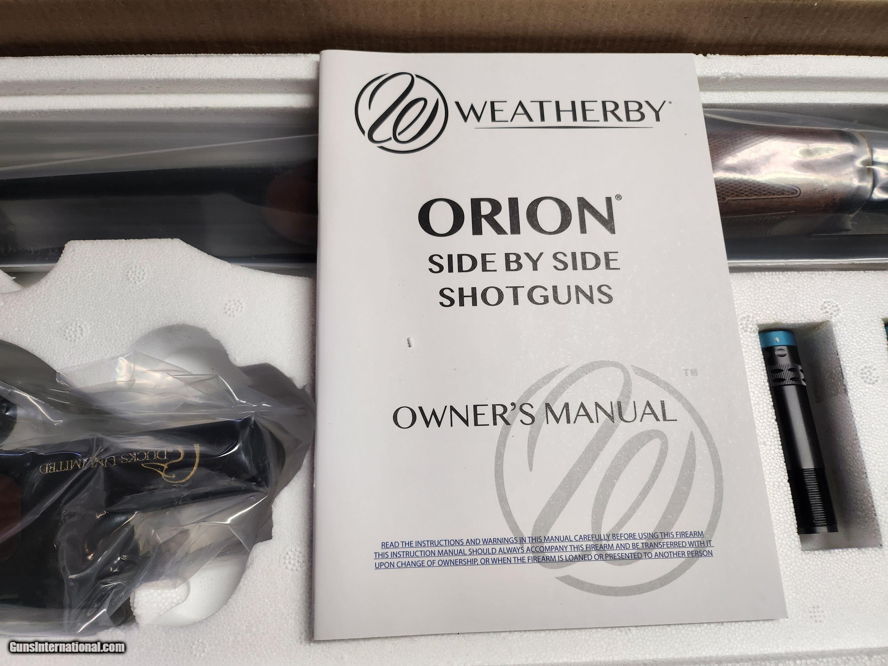 Description: This is a set of Weatherby SxS Shotguns commisioned by the Ducks Unlimited. It consists of all four Weatherby SxS Orion shotguns. Each shotgun is streight grip, double trigger, extractor guns with 3 inch chambers, 28 inch barrels, and 5 extended choke tubes. These shotguns are new in the box and have not been assenbled. They all are in their original shipping boxes. Great set of shotguns for the collector/hunter. Shotgun Gauge: 12 Gauge, 20 Gauge, 28 Gauge, .410 Gauge Manufacturer: Weatherby Model: Orion Serial Number: 79-H25YY- 002809, 002890, 003033, 003110 Barrel Length: 28 Bore Info: 100 % Chambers: 3 In Ejectors: no Condition: 100 % Metal Condition: 100 % Wood Condition: 100 % Bore Condition: 100 % Barrels: 28 In Barrel Type: Side x Side Action: Break Triggers: Double Stock: Straight Grip Price: $3,200.00 Buy Now Contact Seller |
