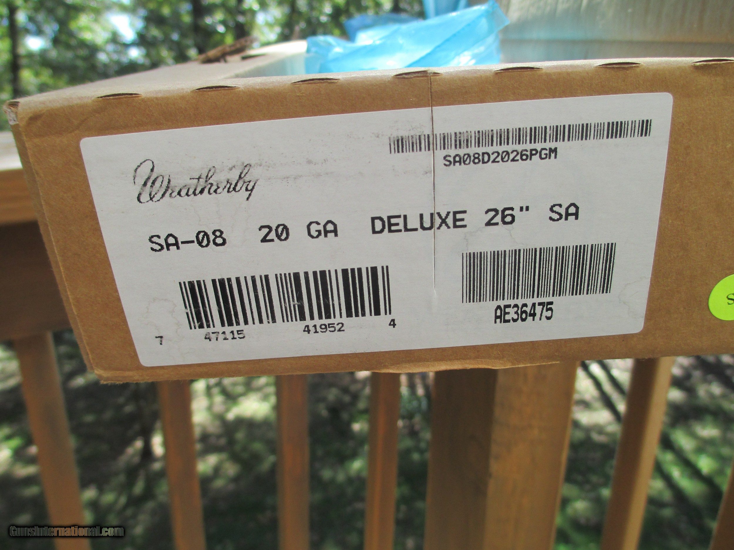 Description: Weatherby SA-08 Deluxe .20 gauge. 26 inch vent rib barrel. Comes with box, manual, and choke tubes. I purchased this shotgun and ran 3 rounds through it to make sure it functioned properly. Selling as used since I did fire it. It has never been in the field. I am not a dealer. Shotgun is from my private collection. It has a couple of tiny marks on the stock . It is best to call or text if you have questions. I don't check my email very often. 417-844-5828 CNC machined aircraft grade aluminum receiver Chrome plated bolt Vented top rib Brass front bead Chrome lined bore Drop out trigger system for easy cleaning Dual valve gas system Push-button safety STOCK: Beautiful select grade walnut stock with high gloss finish 22 LPI checkering on pistol grip and forend BARREL AND METALWORK: Available with 26-inch or 28-inch barrel Rich high lustre finish on metalwork CHOKES: Full Modified Improved Cylinder SOLD |