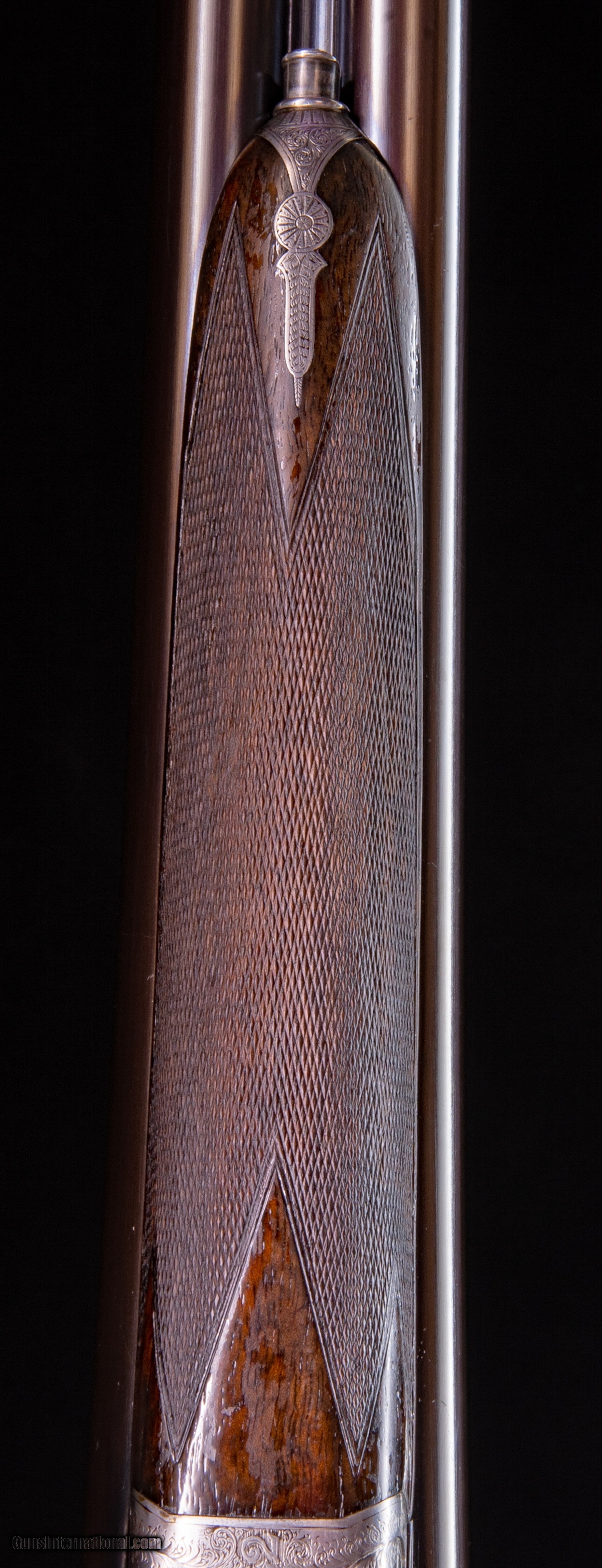 Description: Hammerless Sidelocks - A very fine shotgun from this fine maker. P. Webley was as one might expect, one of the previous companies that became Webley and Scott. The Scott being of the W.C. Scott fame. This gun was built 1894 so can be shipped direct. The newer steel barrels appear to be by Westley Richards the 1920\'s. *** Note: To see this gun with high resolution photos and a zoom-in feature, go to the vintagedoubles main site and search for the gun ID: 5100 or browse the main site to see our full gun collection. |