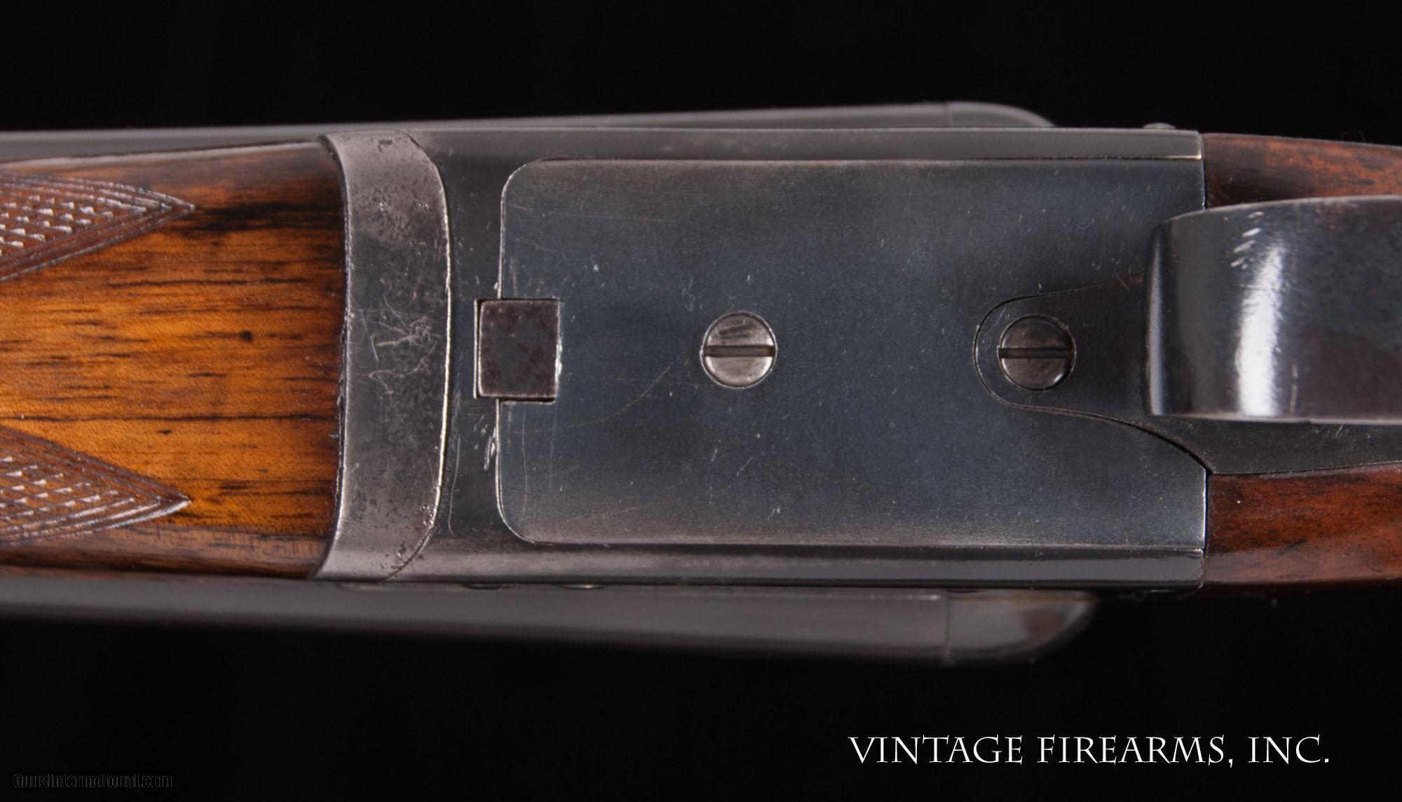 Description: Webley & Scott 16 Gauge Side-by-Side 2 BARREL SET, 28” & 30”, GREAT UPLAND SET, EJECTORS, CHEAP!!! General Specs: Webley & Scott, Year 1912, 16 Gauge, 6lbs 9oz, SxS Serial Number: 89937 Here we have a solid field gun from a great English maker, Webley and Scott, Ltd. This firm began its stint in 1906 and built fine guns right into the 1970’s. They are back in business again at this date. Webley & Scott made more double shotguns than any other British firm, and made guns that ran the gamut from simple field guns to beautifully engraved “BEST GUNS”. All of the guns they produced are considered quality guns and have been well respected for over 100 years. This gun, sn89937 made in 1912, is a simple Boxlock Ejector with no engraving but nicely figured English walnut stock. The gun shipped with 28” barrels that are presently choked SK/LM, perfect bird chokes for the wooded coverts or hunting over pointing dogs. Sometime after the gun was made, a second set of 30” barrels were made and fitted to the gun that are choked LM/F, a perfect set for late season grouse and pheasants. What a great hunting gun, with modern 2 ¾” chambers, the best range of chokes for all your hunting needs, nice stock dimensions, solid mechanics, and a very affordable price. We likely have a vintage, well used case we could supply to house the two-barrel set at a very moderate added cost. If you ever wanted a noted English double gun in the lightweight 16ga., the perfect upland gun, and a two-barrel set no less, this is your chance. Thanks for looking! Barrels Barrel Length: 30", 28" Chokes: 30=.013/.032 LM/F; 28=.004/.014 SK/LM Bores: very good Bore Diameter: 30=.663/.664 28=.665/.667 Wall Thickness: 30=.028/.027 28=.031/.028 % Blue: 95% Chambers: 2 3/4" 30" in proof Ribs: tight Sights: single Action Action: tight Ejectors or Extractors: ejectors, timed Case Color: 92% Screws: excellent Trigger Type: double Trigger Guard Color: 70% Stock Type: 1/2 round/splinter forend LOP: 14 1/2" LOP To End Of Wood: 13 7/16" DAH: 2 1/2" DAC: 1 3/4" Cast: 0 Checkering Condition: excellent w/mullered border Butt Treatment: red "Old English" There are more photos upon request. We offer a 30 day mechanical warranty on this fine shotgun. Call us for full details. PLEASE SEE MY OTHER FINE VINTAGE FIREARMS. Just open one of my ads and click on the line that says “see all items from this seller” and a very nice list of fine sporting and collectible arms will appear. I have many more fine sxs shotguns not yet listed. Thanks for looking! We employ a full time gunsmith on premises and can perform alterations to suit your needs within a few weeks of purchase. Payment Methods: Money Order, Certified Check, Personal Check, Wire Transfer Inspection Period / Return Policy: Three Days from the date the item was received. Sales Tax: 6% Michigan Only Shipping & Insurance: Ground $45.00 We ship internationally! Item Condition: Used Requires FFL?: Yes If you have any questions about this item or payment, please email or call us directly, at #616-292-6240. Thanks! Jay Shachter, Vintage Firearms, Inc We employ a full time gunsmith on premises and can perform alterations to suit your needs within a few weeks of purchase. Common requests are: -stock bending to suit your particular requirements -addition of any specified butt pad to increase length of pull -alteration of chokes to suit your shooting preferences -lengthening of chambers and forcing cones -darkening stock color with penetrating stains -restoring any part of the gun including rust blue, charcoal blue, bone and charcoal case color, wood restoration and checkering recuts. If you like one our guns but it needs "tweaked", let us know and we can quote you a time and price. Some enthusiasts like the guns "as found" and others want them "just so". We often list guns as found and let the particular buyer choose how they want their gun to fit or look. SOLD Curio/Relic: Yes |