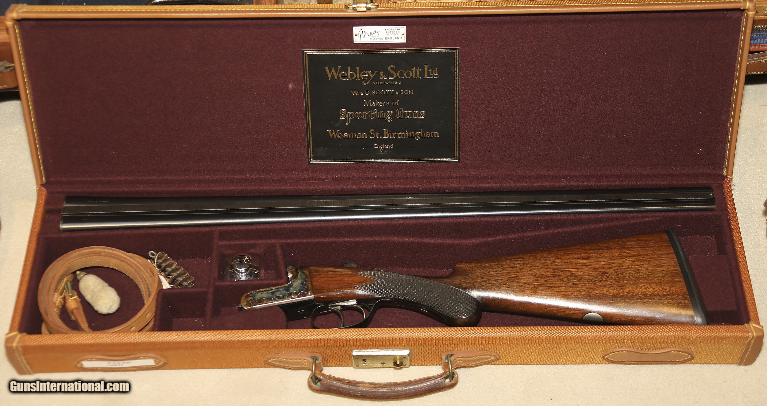 Description: 28" SxS barrels with flat matted rib choked improved cylinder & improved cylinder. 14 3/4"pull from front trigger to thin black Decelerator recoil pad. 1 3/8" - 2 1/8" drop. 1/4" cast off. Lightly figured European walnut stocks with Anson pushbutton-release splinter forend, round knob semi-pistol grip, classic point-pattern checkering, and vacant nickel-silver initial oval. Light scroll engraved, casehardened action with automatic ejectors and automatic top tang safety with SAFE inlaid in silver. Weight: 5lbs, 13 1/4oz. Built 1965. Tight, excellent bores, and ejectors in perfect time. 99%+ barrel blue, 99%+ casehardening colors. In Brady leather-trimmed, canvas-covered trunk case with cleaning accessories and Webley & Scott trade label. Curio/Relic: Yes Shotgun Gauge: 20 Gauge Manufacturer: Webley & Scott Model: 700 Boxlock Ejector Serial Number: 136632 Barrel Length: 28 Chambers: 3 Ejectors: Yes Condition: Excellent Barrels: Side-by-Side Triggers: Double Stock Comb: 1 3/8 Stock Heel: 2 1/8 Stock Cast: 1/4" Cast Off Fore End: Anson pushbutton-release splinter forend Butt Pad: thin black Decelerator recoil pad LOP: 14 3/4 Rib: Flat, matted Weight: 5lbs, 13 1/4oz Manufacture Date: 1965 Choke Left: improved cylinder Choke Right: improved cylinder Case: In Brady leather-trimmed, canvas-covered trunk case Item Location: Livingston, MOntana Proof:Nitro: Yes Price: $4,450.00 Contact Seller |