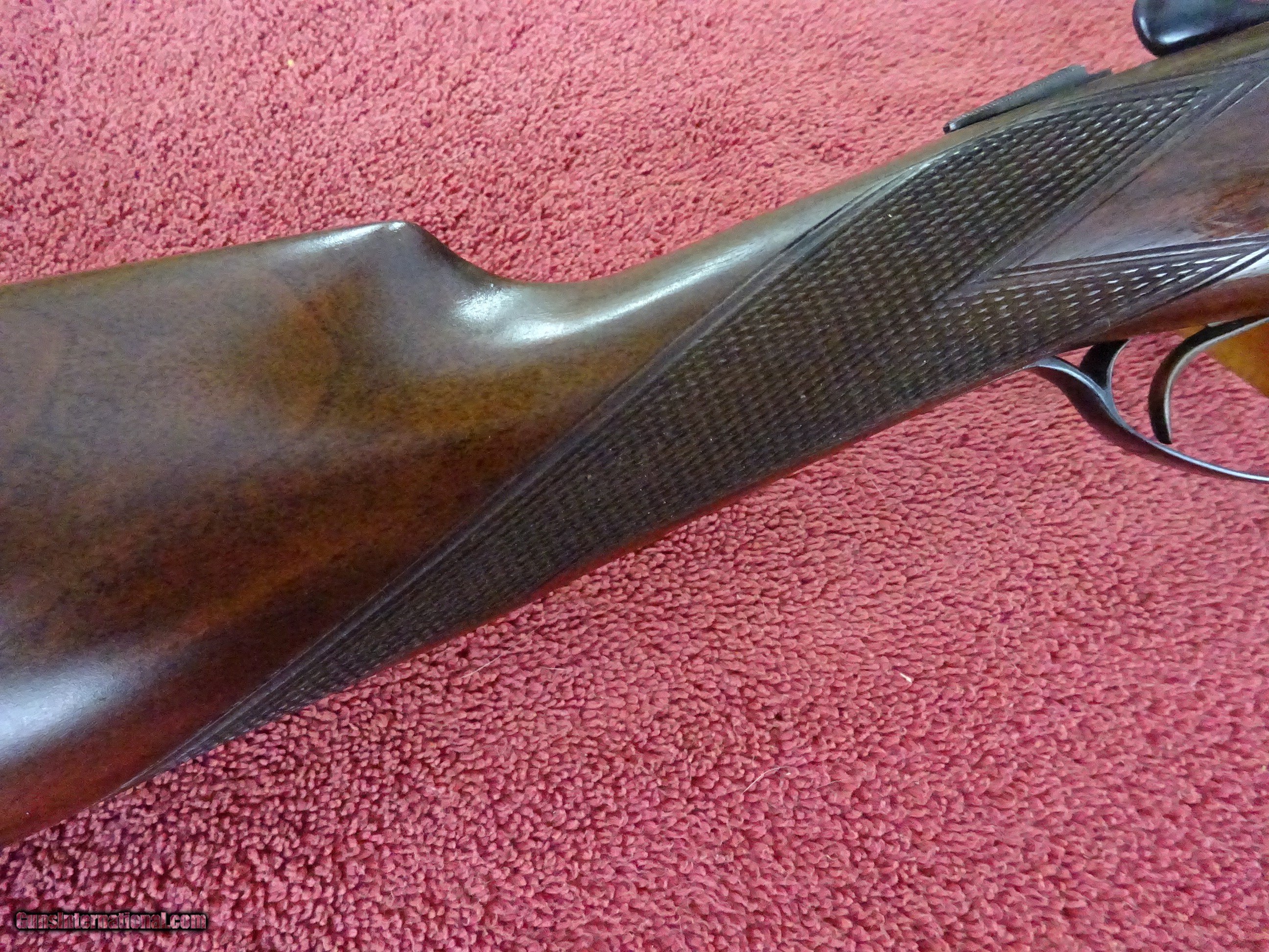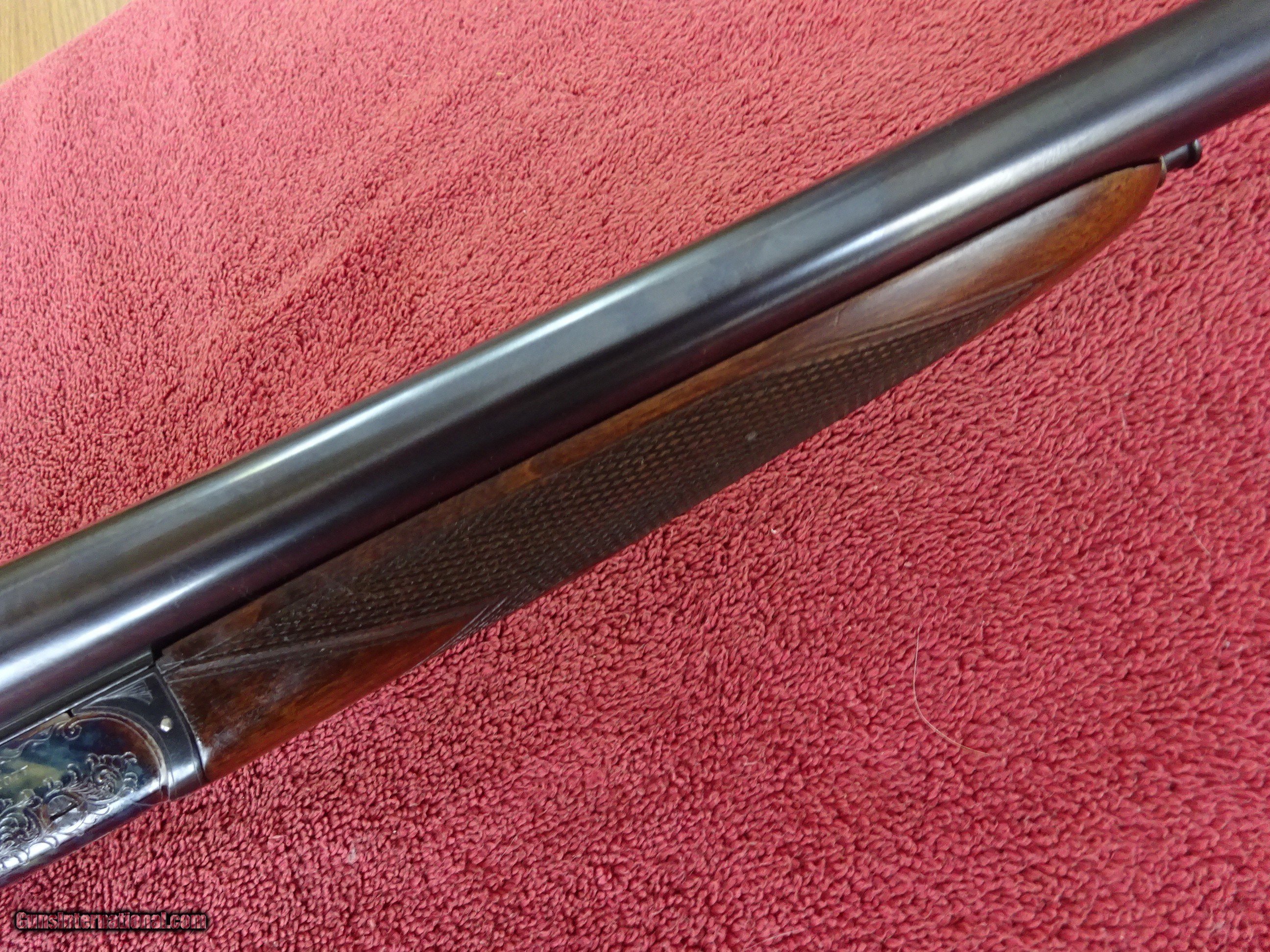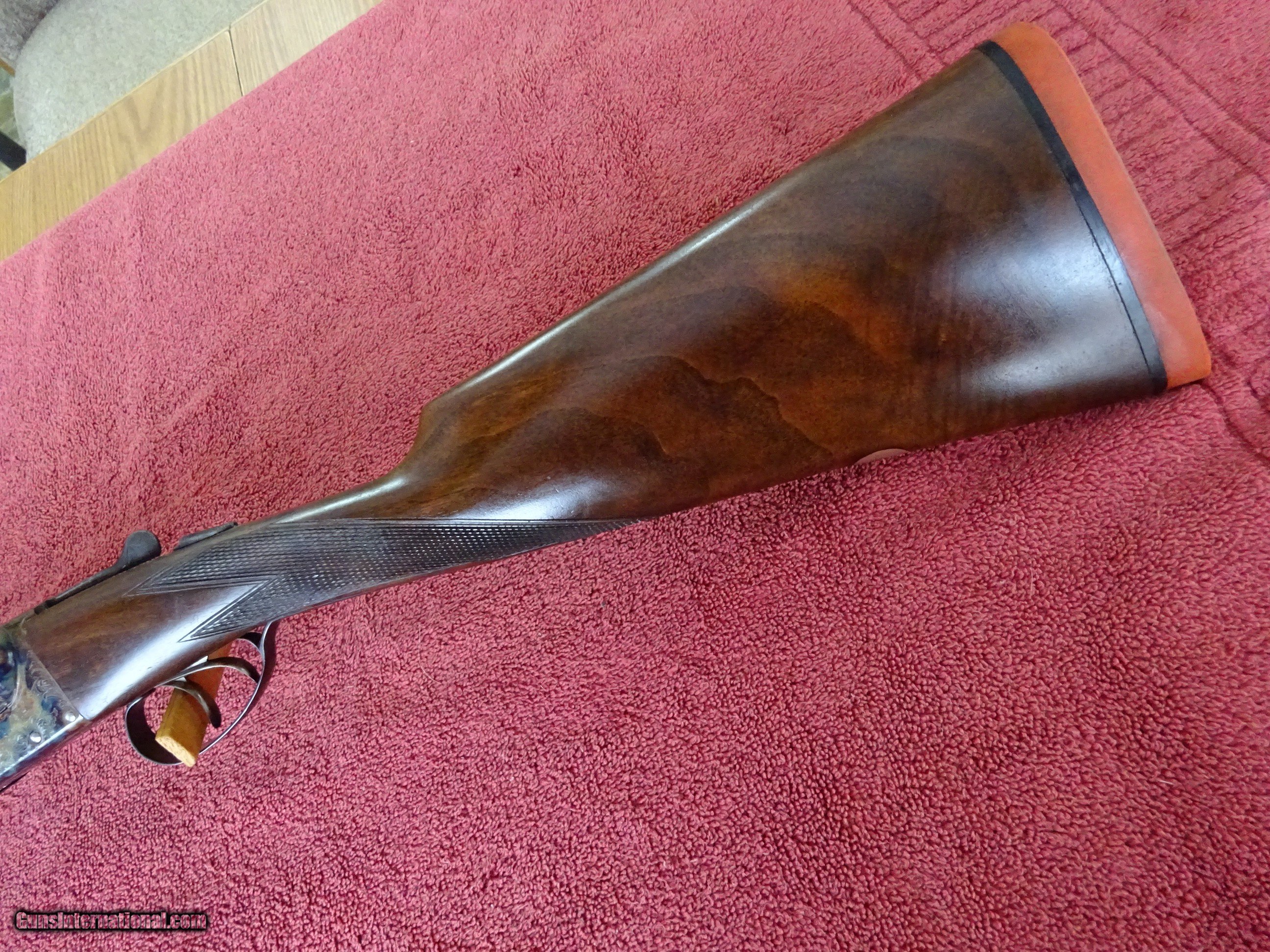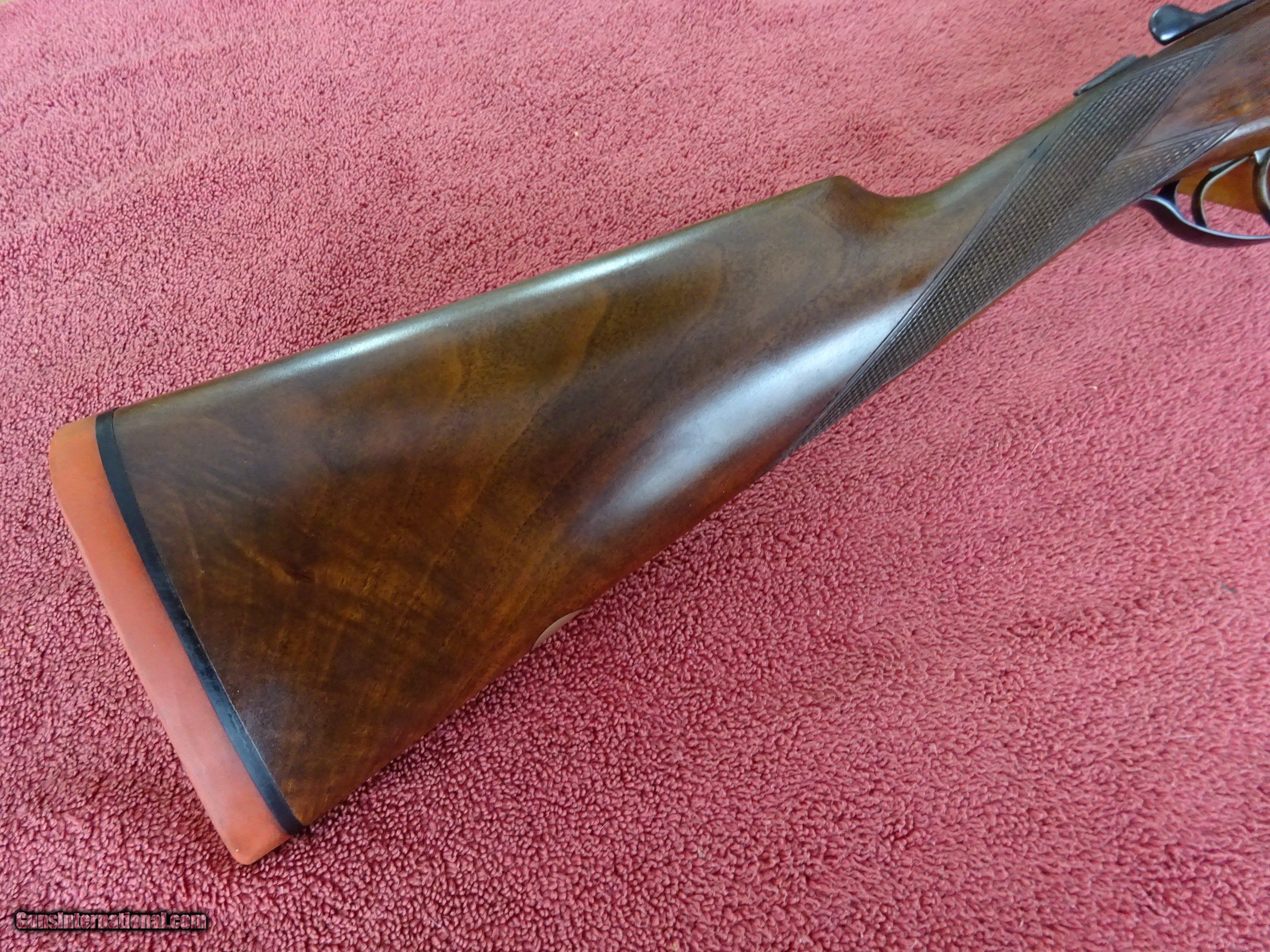 Description: WEBLEY & SCOTT, MODEL 700 12 GAUGE. 28" BARRELS, IMCYL. (.010) AND MODIFIED (.025, 2 3/4" CHAMBERS, SINGLE BEAD SIGHT, 100% BRIGHT BLUE, MIRROR PERFECT BORES. AUTOMATIC EJECTORS BOXLOCK FRAME WITH SCROLL ENGRAVING PATTERN, 100% BOLD VIVID CASE COLOR. STRAIGHT GRIP STOCK, SPLINTER FOREARM, NICELY FIGURED EUROPEAN WALNUT, PERFECT FINE CHECKERING. OVAL BRASS STOCK INLAY (NOT ENGRAVED), 100% TRIGGERGUARD BLUE, 1 1/4" X 2" X 14 3/4", 6 POUNDS 8 OUNCES. SOLID SILVERS PAD. ONE OF A CONSECUTIVE SERIAL NUMBERED PAIR, MADE IN 1976, SEE OUR OTHER LISTINGS. $2750.00 + $70.00 Insured shipping to an FFL address. Layaway is available. See all Pats gun listings on this site! We also have hundreds of ORIGINAL gun company advertising & memorabilia pieces available for sale on our site SPORTINGCOLLECTIBLES. We have no reprints or reproductions. Email for more information. If you need to call, morning or evening is best, and please note the Seller's Inventory number. SOLD Curio/Relic: Yes |