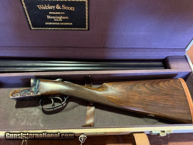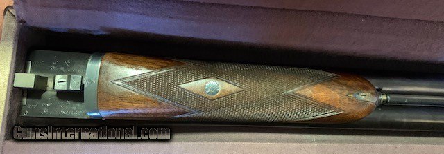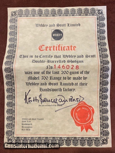Description: Webley & Scott Model 700 12g 28" Excellent SN- 146028 w/factory certificate of authenticity as one of the last 200 manufactured 6 1/4 lbs Comb 1 1/2" Heel 2 1/4" LOP 14 7/8" to leather covered pad Ejectors Automatic safety 28" bbls SKT 1 and Mod Double triggers 2 3/4" chambers A very nice 12g field gun. Clean and all original with pretty colors. Factory canvas case. Please call or email for additional information and photos. SOLD |