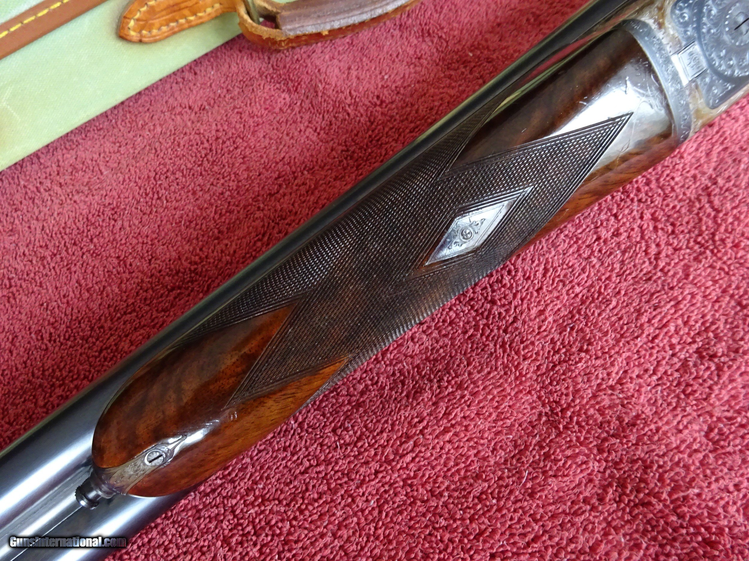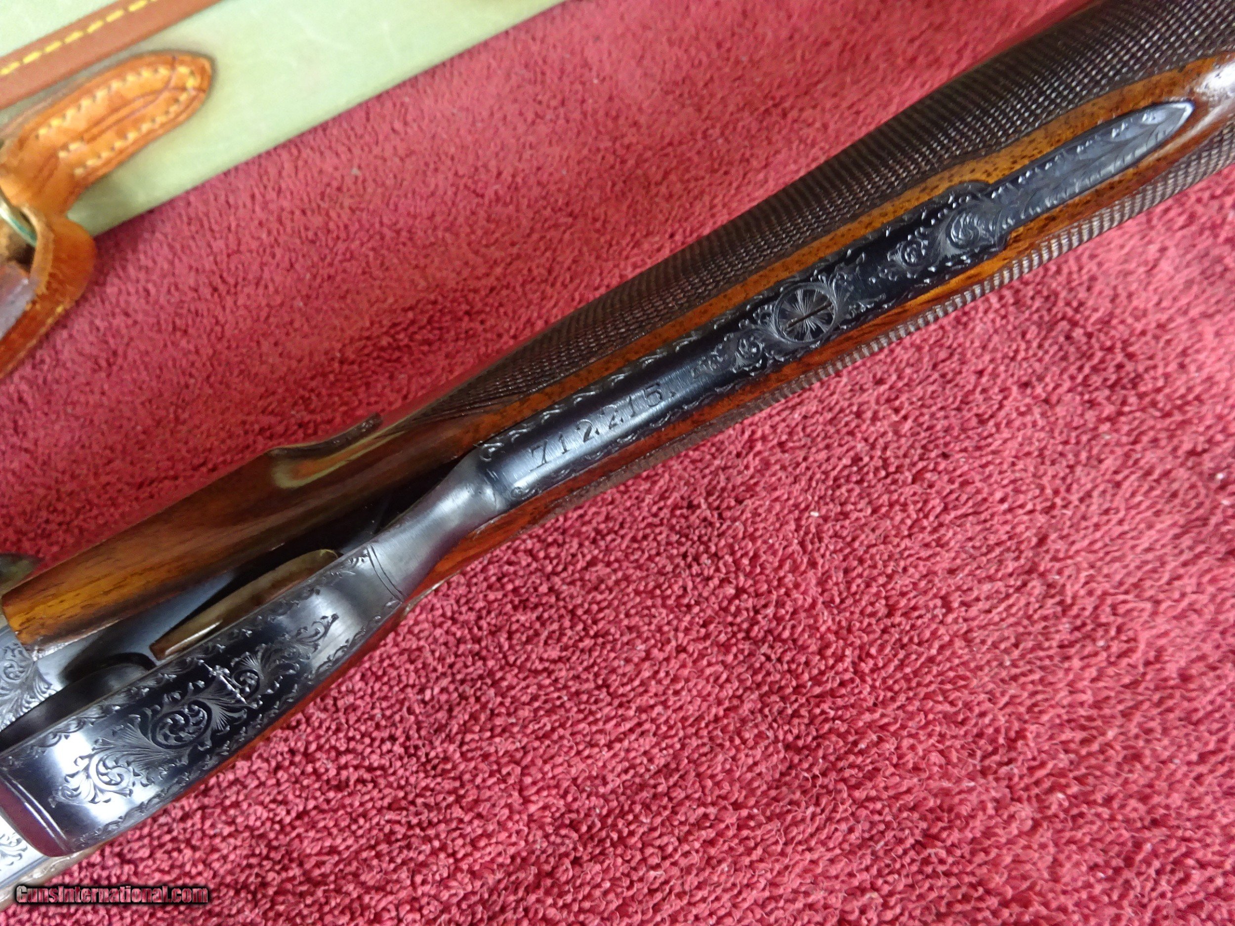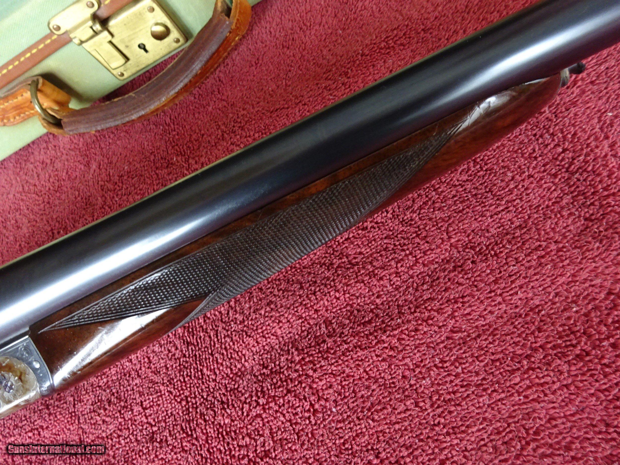 Description: WEBLEY & SCOTT, MODEL 702, 12 GAUGE, 26" BARRELS IMCYL. AND MODIFIED, AUTOMATIC EJECTORS, MIRROR PERFECT BORES, 100% BRIGHT BLUE, ENGRAVED AT BREECH ENDS, 2 3/4" CHAMBERS. FRAME, FLOOR PLATE, TRIGGERGUARD AND FOREARM IRON ARE ALL ENGRAVED WITH ATTRACTIVE SROLLWORK AND INTRICATE BORDERS, MOST ALL THE BOLD VIVID CASE COLOR. STRAIGHT GRIP STOCK, SPLINTER FOREARM WITH ANSON RELEASE, NICELY FIGURED EUROPEAN WALNUT WITH ATTRACTIVE COLOR FINE CHECKERING WITH MULLERED BORDERS, GOLD OVAL STOCK INLAY - NOT ENGRAVED. 1 1/4" X 2 1/4" X 15 14", HIGH QUALITY LEATHER COVERED PAD. CAST 1/4 ON, 6 POUNDS EVEN. ORIGINAL FACTORY CANVAS AND LEATHER TRUNK CASE, NICKEL PLATED SNAP CAPS, OIL BOTTLE, TWO PIECE BRASS FITTED WOOD CLEANING ROD, UNUSED BRUSH AND SWAB. RED FELT INTERIOR WITH LEATHER MAKERS LABEL. THE GUN APPEARS LITTLE USED, TOP LEVER TO THE FAR RIGHT, STIFF TO OPEN. MADE IN THE 1970'S. $2750.00 + $50.00 Insured shipping to an FFL address. See all Pats listings We also have hundreds of pieces of ORIGINAL gun company advertising & memorabilia available for sale. We have no reprints or reproductions. Email for more information. SOLD Curio/Relic: Yes |
