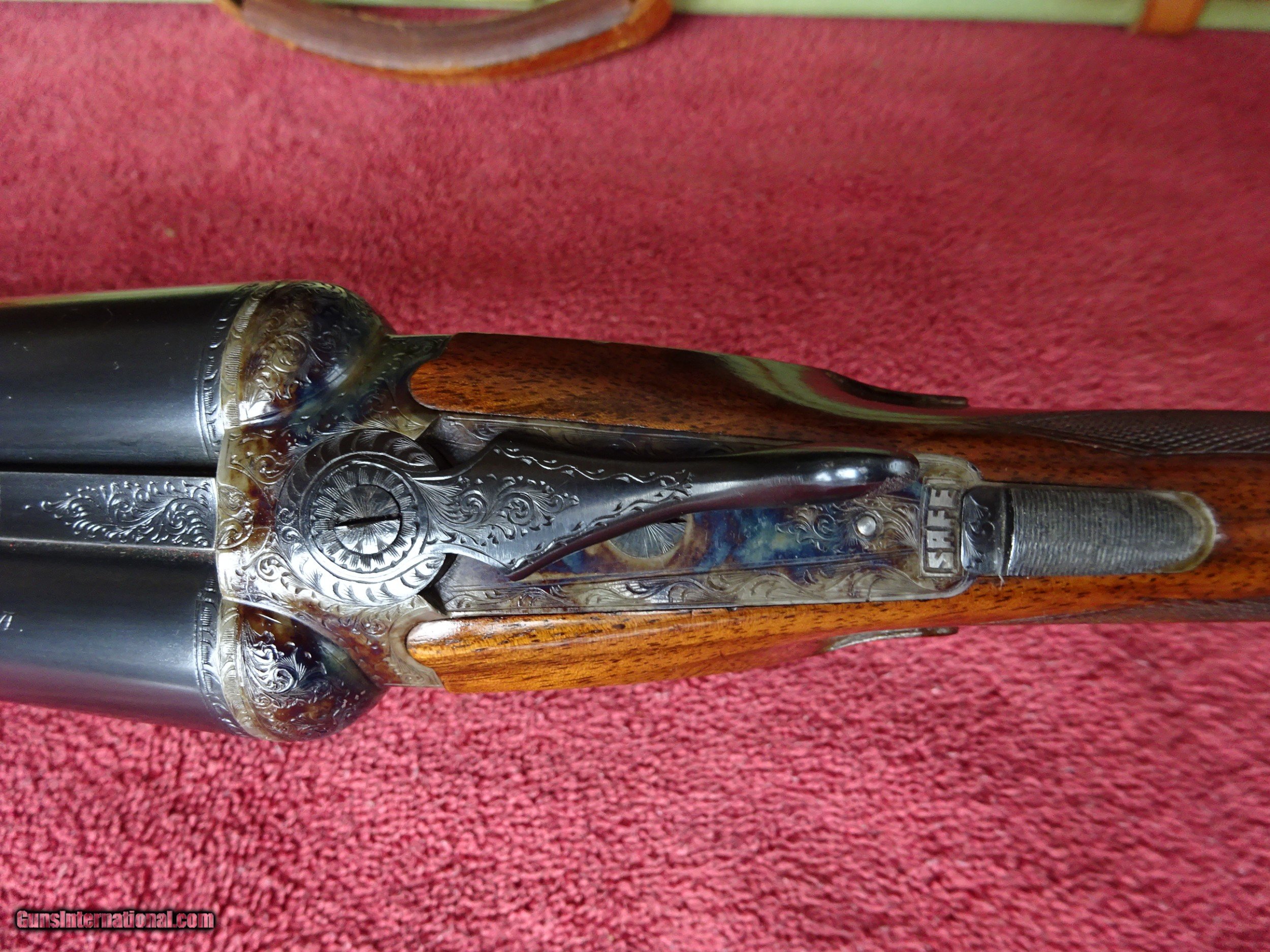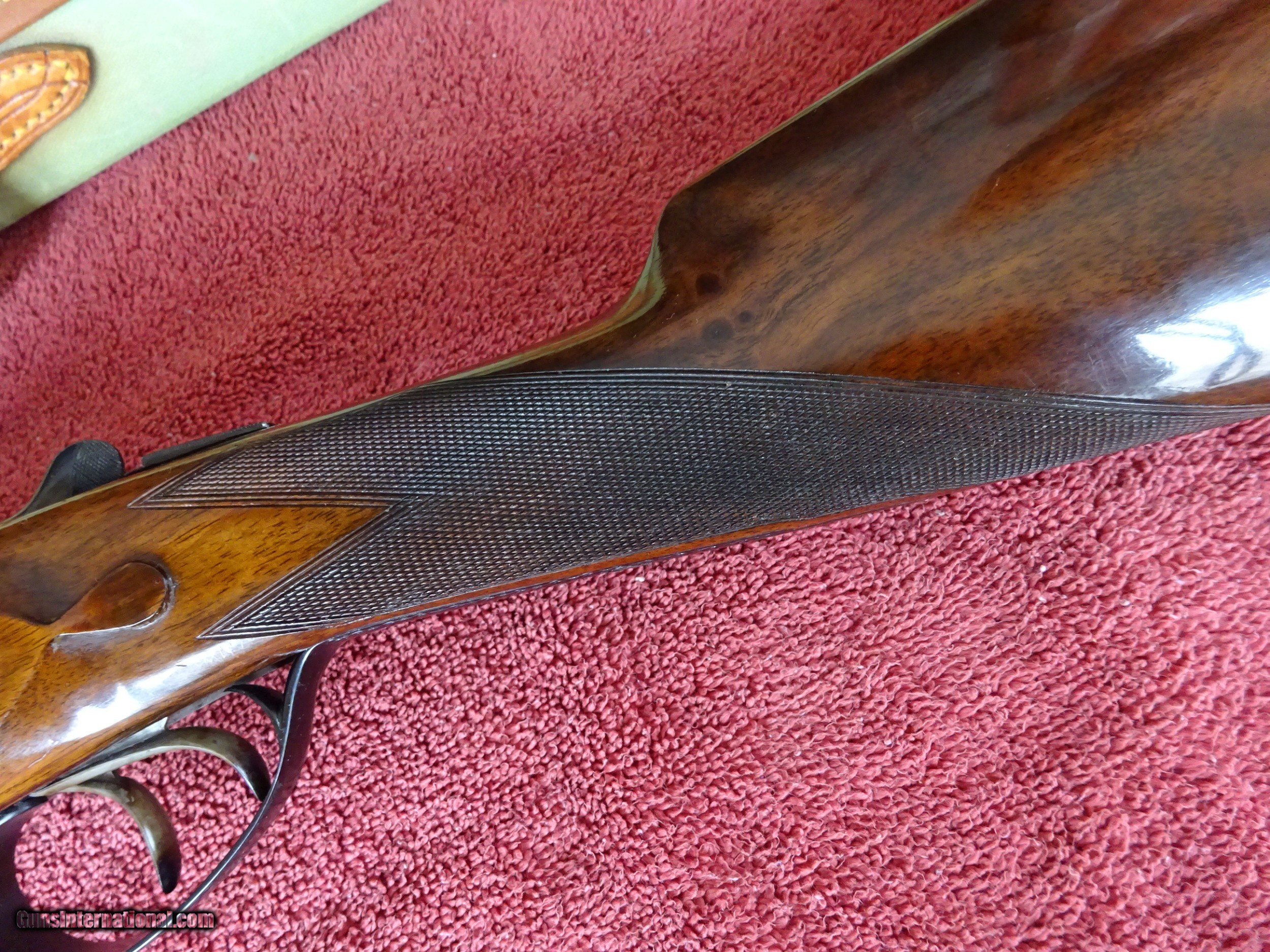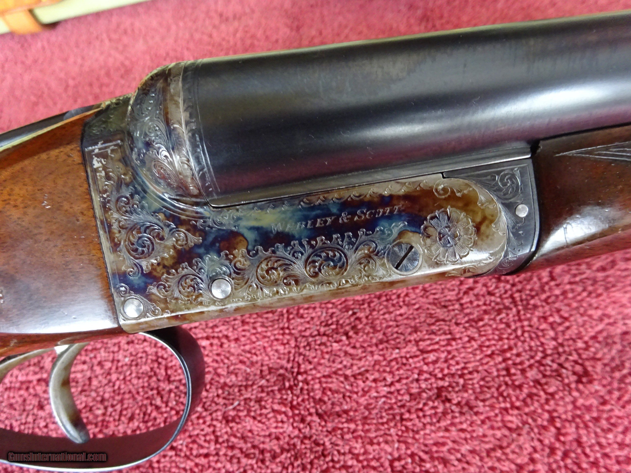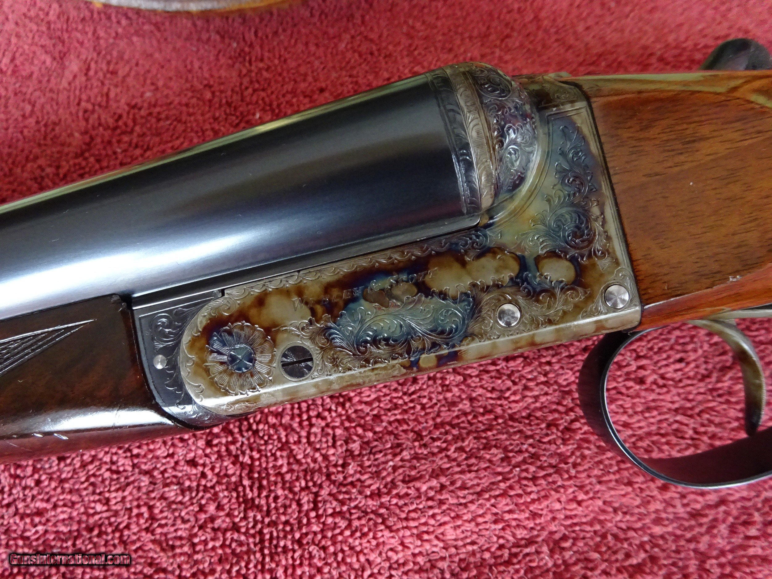 Description: WEBLEY & SCOTT, MODEL 702, 12 GAUGE, 26" BARRELS IMCYL. AND MODIFIED, AUTOMATIC EJECTORS, MIRROR PERFECT BORES, 100% BRIGHT BLUE, ENGRAVED AT BREECH ENDS, 2 3/4" CHAMBERS. FRAME, FLOOR PLATE, TRIGGERGUARD AND FOREARM IRON ARE ALL ENGRAVED WITH ATTRACTIVE SROLLWORK AND INTRICATE BORDERS, MOST ALL THE BOLD VIVID CASE COLOR. STRAIGHT GRIP STOCK, SPLINTER FOREARM WITH ANSON RELEASE, NICELY FIGURED EUROPEAN WALNUT WITH ATTRACTIVE COLOR FINE CHECKERING WITH MULLERED BORDERS, GOLD OVAL STOCK INLAY - NOT ENGRAVED. 1 1/4" X 2 1/4" X 15 14", HIGH QUALITY LEATHER COVERED PAD. CAST 1/4 ON, 6 POUNDS EVEN. ORIGINAL FACTORY CANVAS AND LEATHER TRUNK CASE, NICKEL PLATED SNAP CAPS, OIL BOTTLE, TWO PIECE BRASS FITTED WOOD CLEANING ROD, UNUSED BRUSH AND SWAB. RED FELT INTERIOR WITH LEATHER MAKERS LABEL. THE GUN APPEARS LITTLE USED, TOP LEVER TO THE FAR RIGHT, STIFF TO OPEN. MADE IN THE 1970'S. $2750.00 + $50.00 Insured shipping to an FFL address. See all Pats listings We also have hundreds of pieces of ORIGINAL gun company advertising & memorabilia available for sale. We have no reprints or reproductions. Email for more information. SOLD Curio/Relic: Yes |